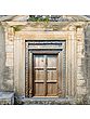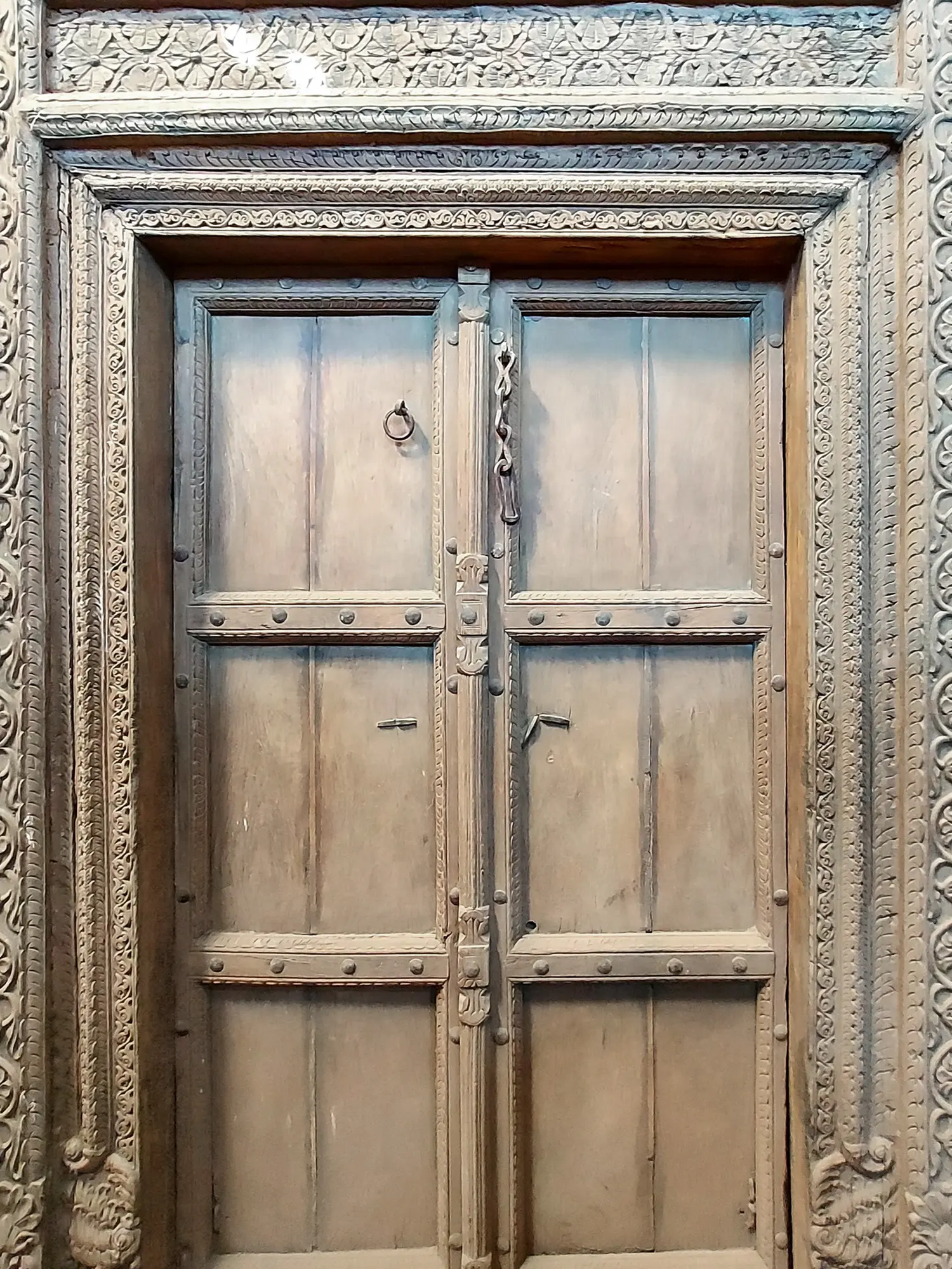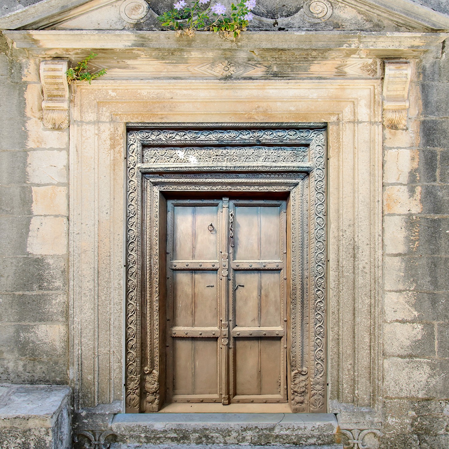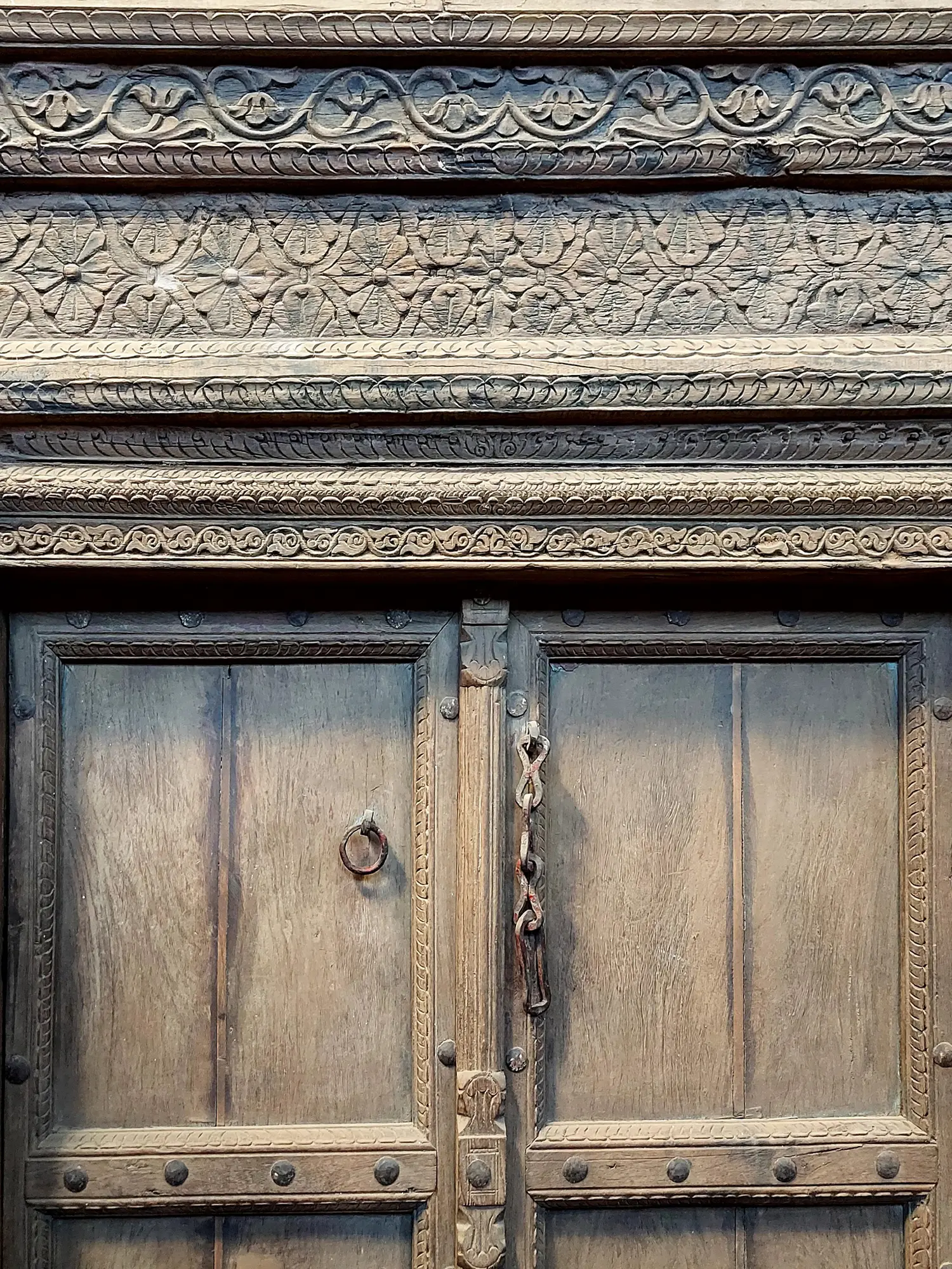 78" Floral Hand Carved And Block Design Wood Door With Vintage Style Knock