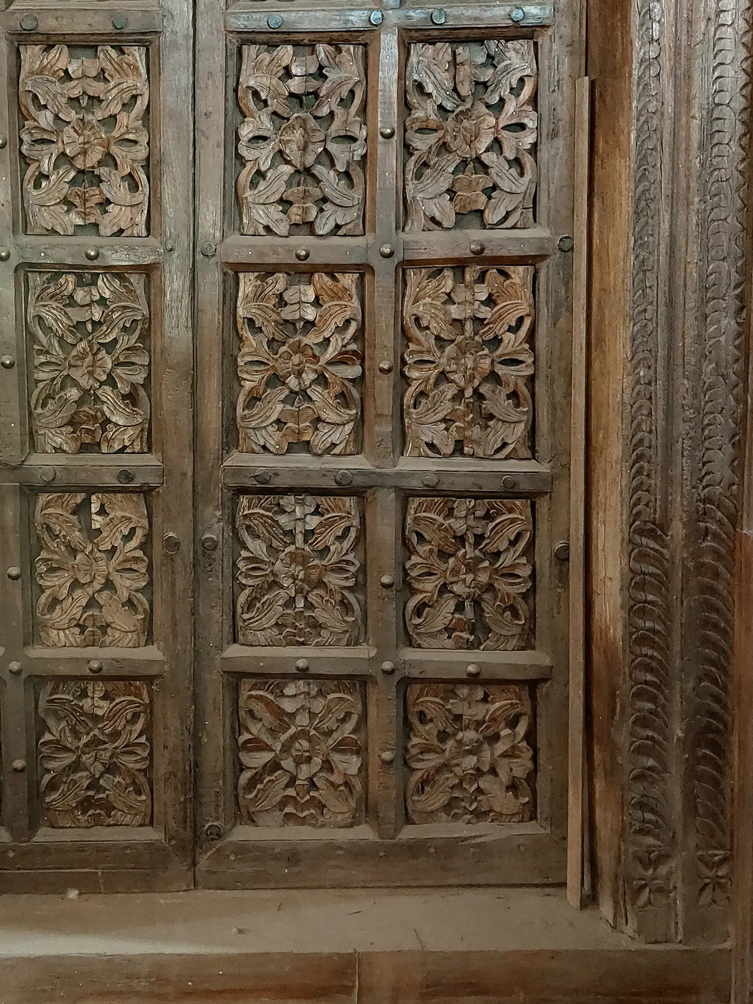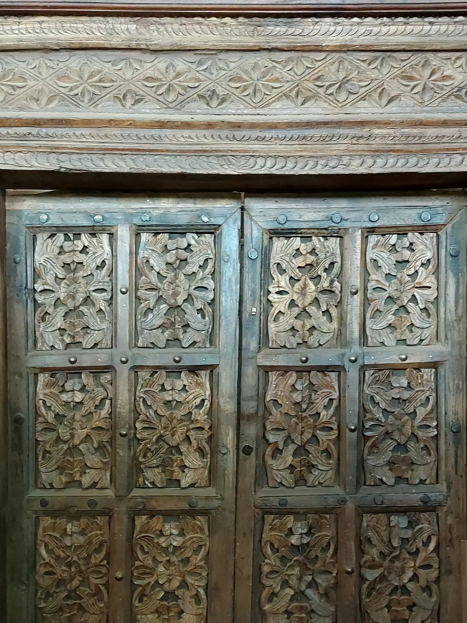 Every inch of this door tells a story of skilled artistry. The intricate floral carvings that adorn the door panels are testaments to the patience and dedication of the artisans who created it. The frame itself is a symphony of textures and patterns, featuring deeply carved motifs that lend depth and visual interest. The wood, aged gracefully over time, bears the marks of its journey, adding to its unique and irreplaceable character. Notice the details in the frame, which showcase an excellent eye and hand for design.