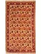 This dhurrie features a beautiful almond-buff base that provides a soft, neutral backdrop for the vibrant floral design. The printed flowers, rendered in a rich palette of reds, yellows, and greens, are meticulously arranged across the surface, creating a visually captivating pattern. The border, a deep shade of red, further enhances the overall design, adding a touch of elegance and sophistication. The subtle variations in color and pattern are hallmarks of hand-crafted pieces, making each dhurrie a unique work of art. The delightful fringe along the edges adds a charming finishing touch.