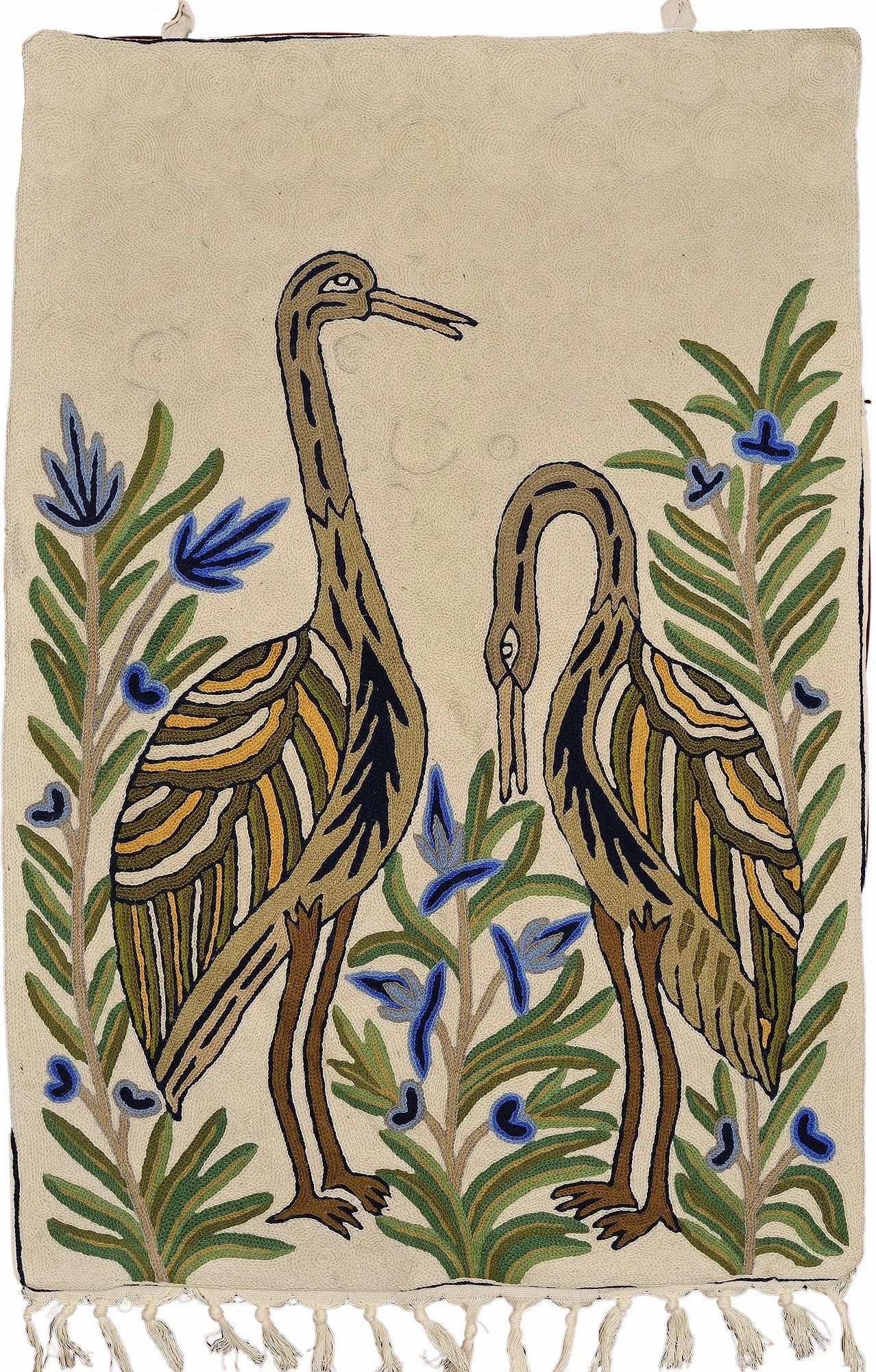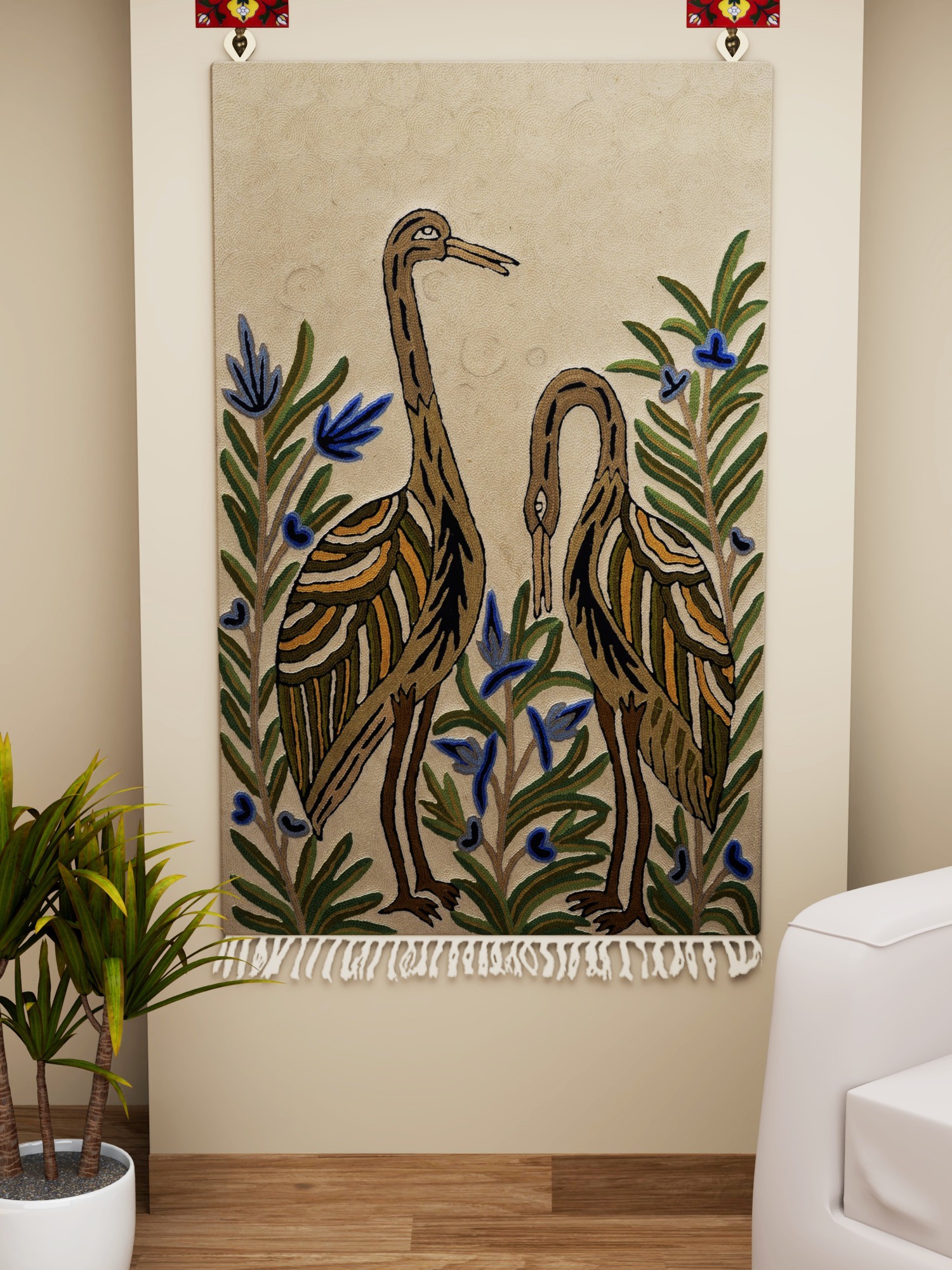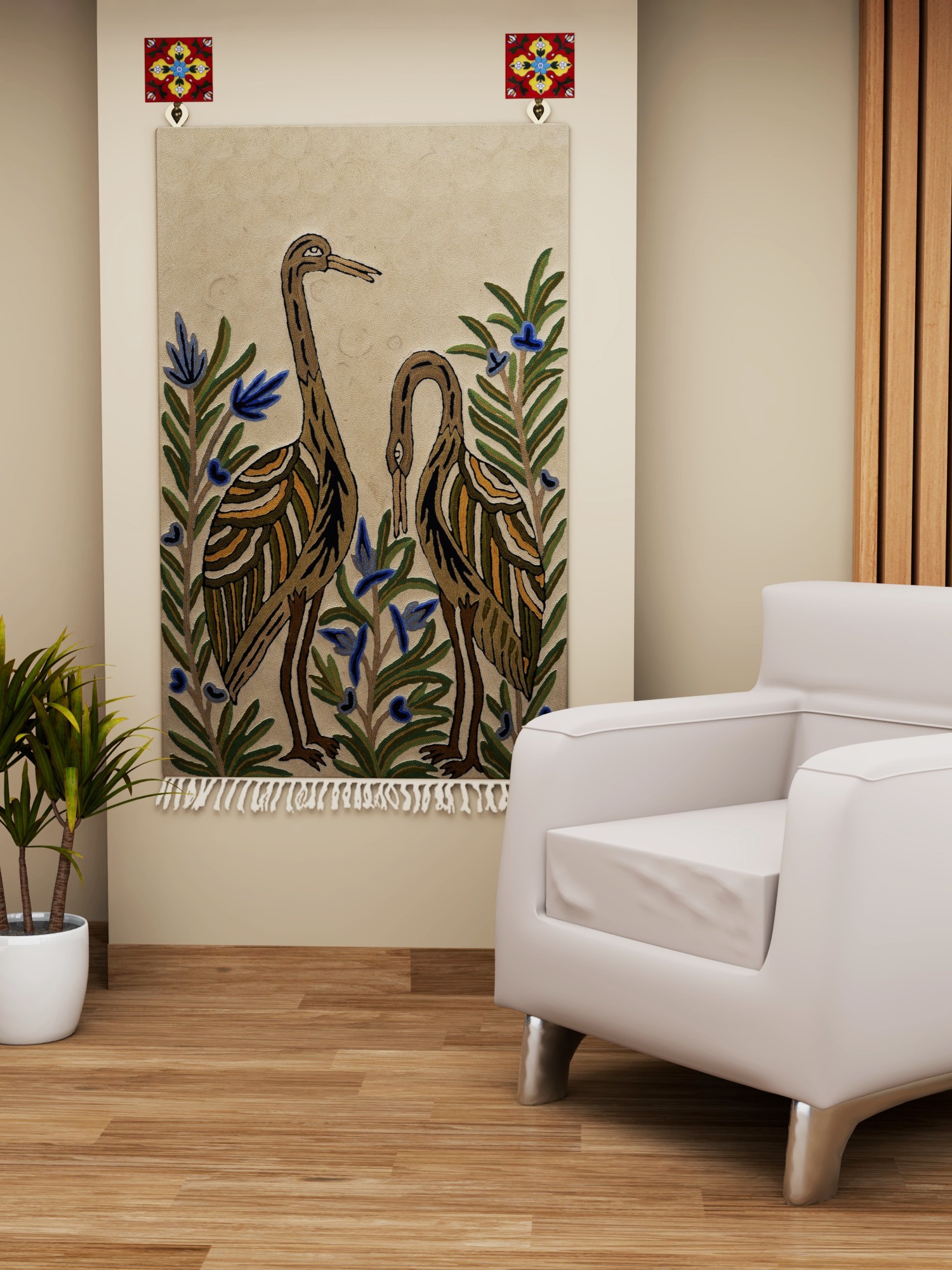 Vanilla-Custard Asana Mat cum Wall Hanging with Embroidered Birds and Foliage