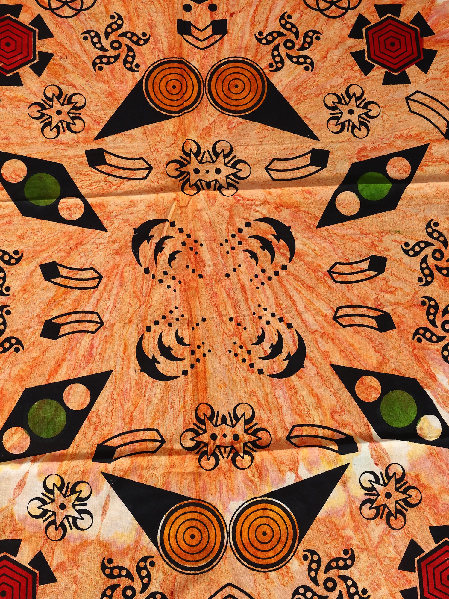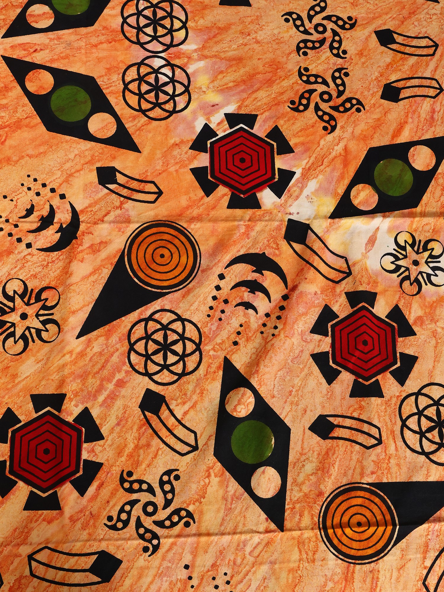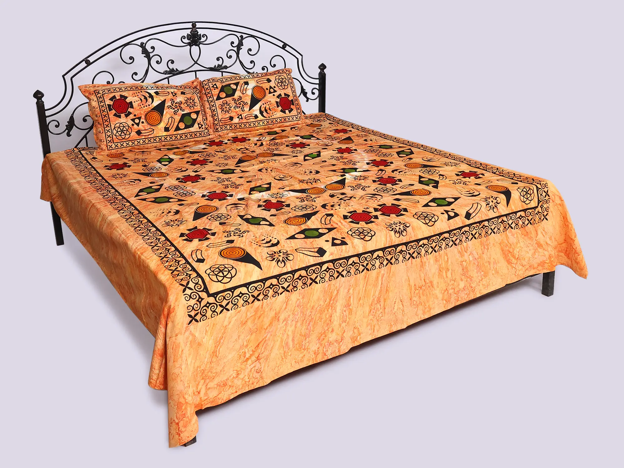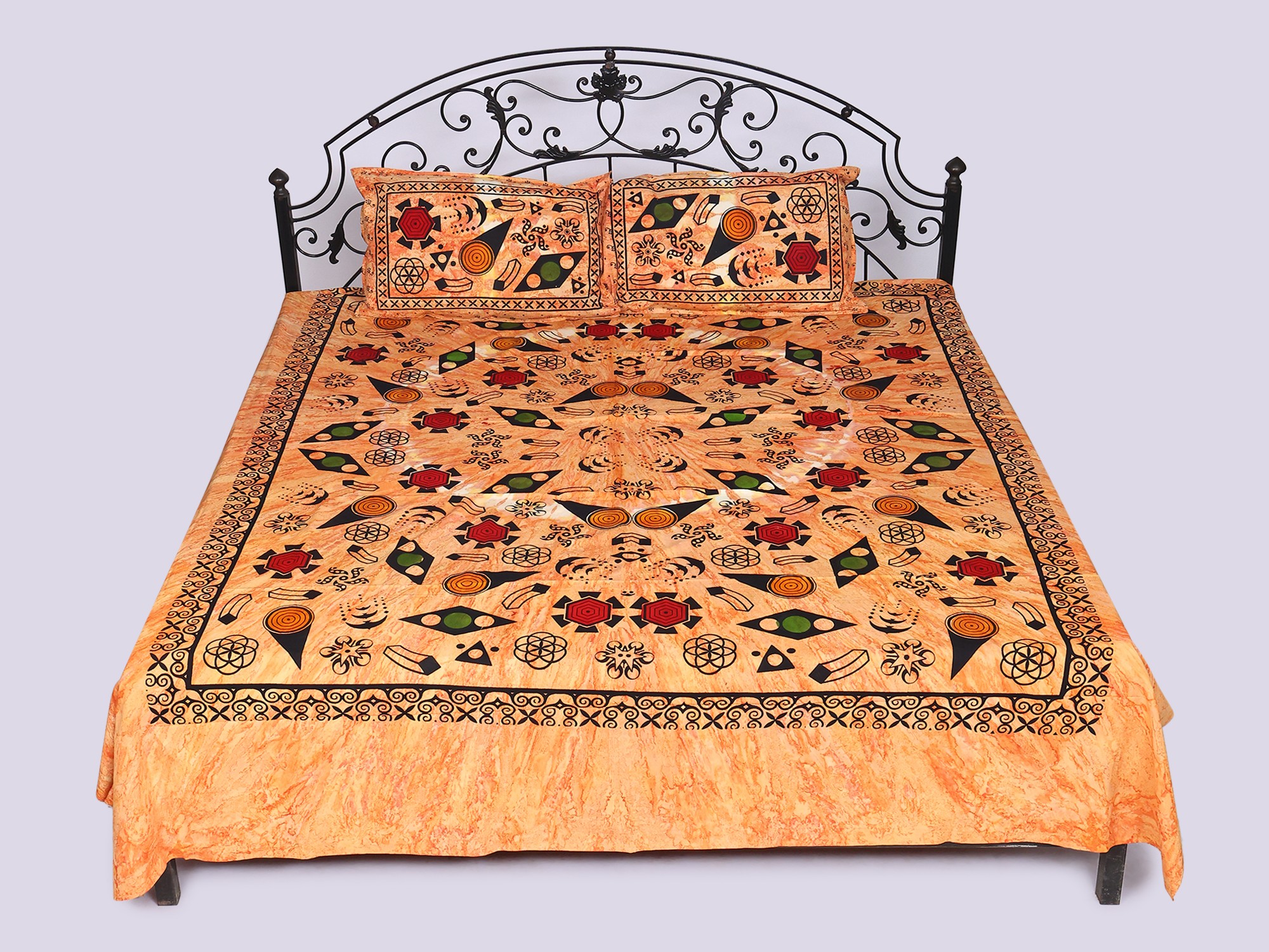 Adorned with a captivating printed geometric pattern, this bedspread presents a striking visual narrative. The bold motifs are thoughtfully arranged, creating a balanced yet dynamic aesthetic that commands attention. The generous dimensions of the bedspread, measuring 112 inches in length and 88 inches in width, ensure a graceful drape over your queen-sized bed, while the accompanying pillow covers, each 28 inches by 18 inches, offer a perfectly coordinated finish. The rich apricot-nectar hue serves as a warm, inviting backdrop to the intricate design elements.