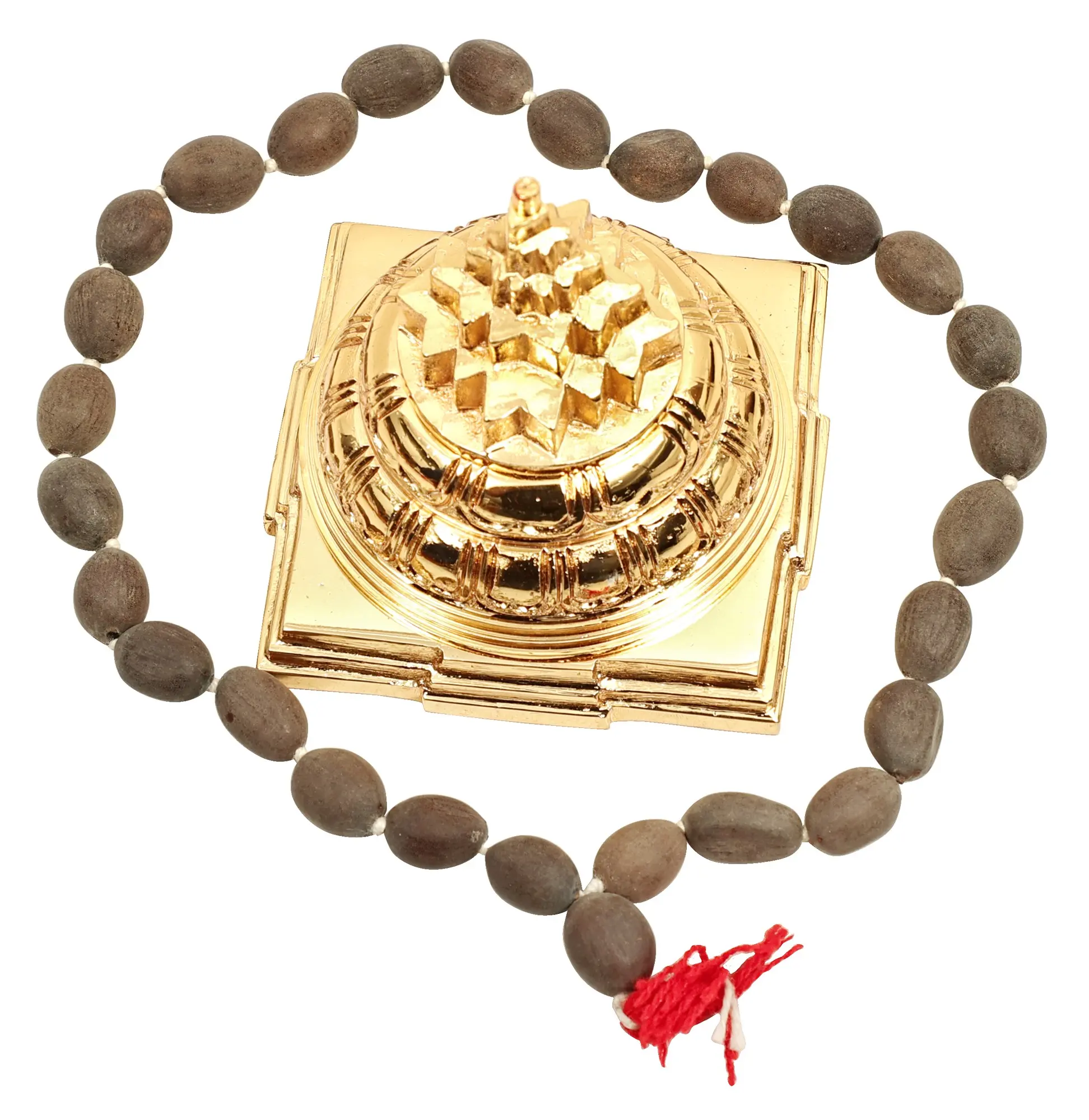 The smashing, auspicious multi-pyramid Brass Sri Yantra in sumeru form is created in the mandala and rises from the three squared - circular bases to the Lotus Petals in several circles and the intermingled Triangles to a stupa-like peak. It is in buoyant light golden color. A one-of-a-kind rosary (mala) made of holy beads, stitched in a rose-colored thread is placed around the Yantra like Lakshman Rekha. You can use it during worship, and meditation, and strengthen inner peace and mindfulness.