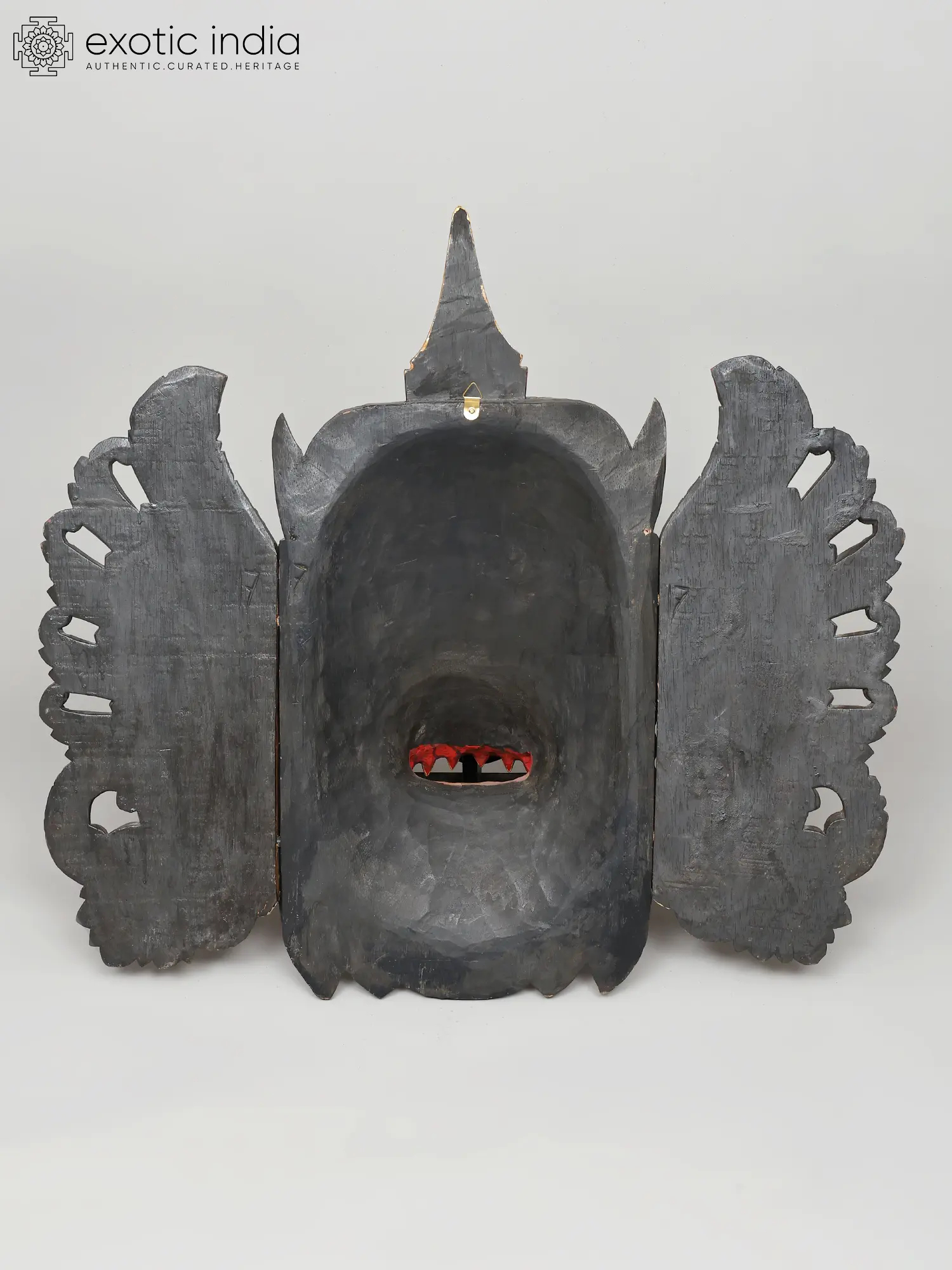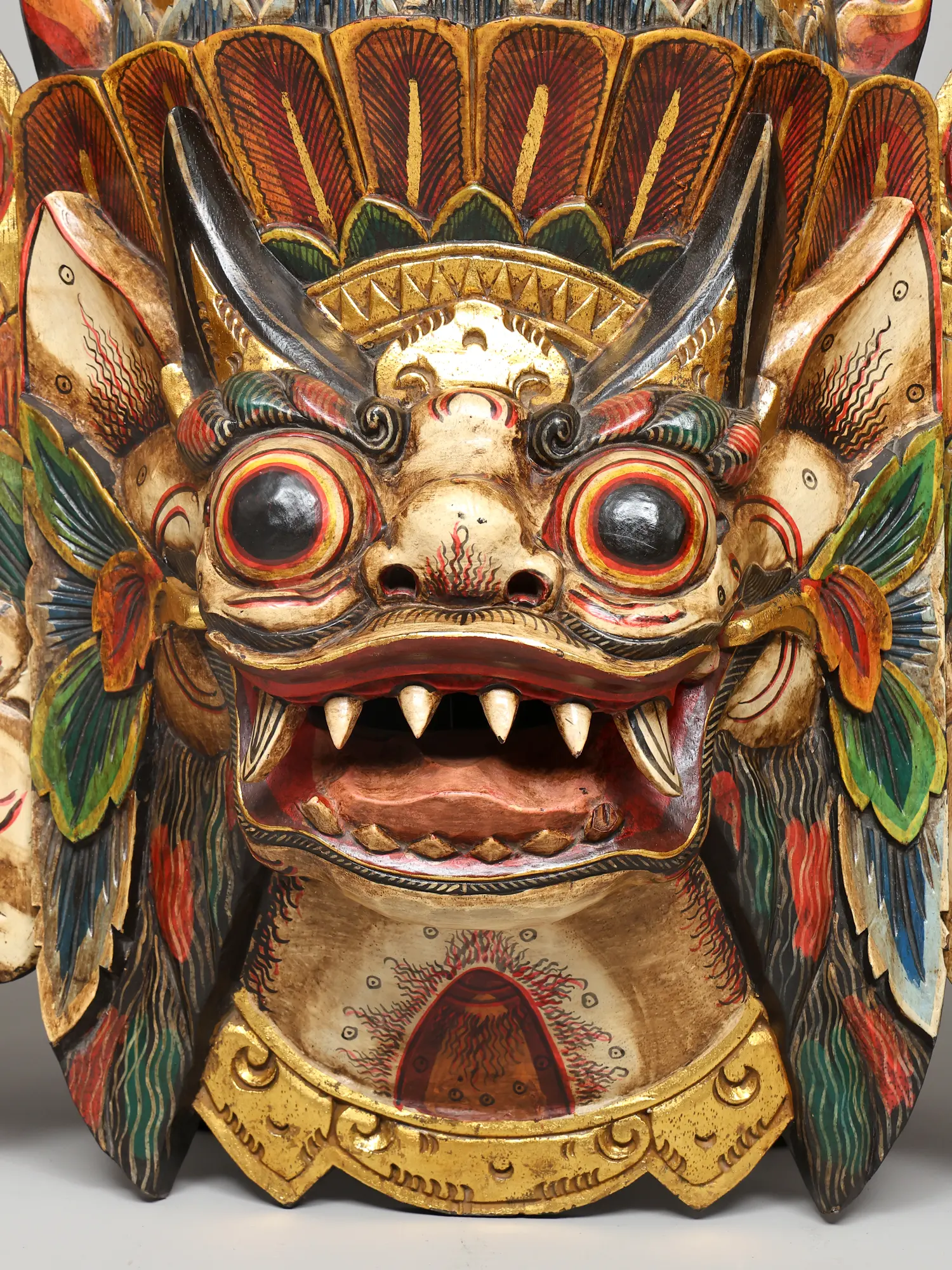 Intricately hand-carved wooden mask with detailed facial features and ornate crest.