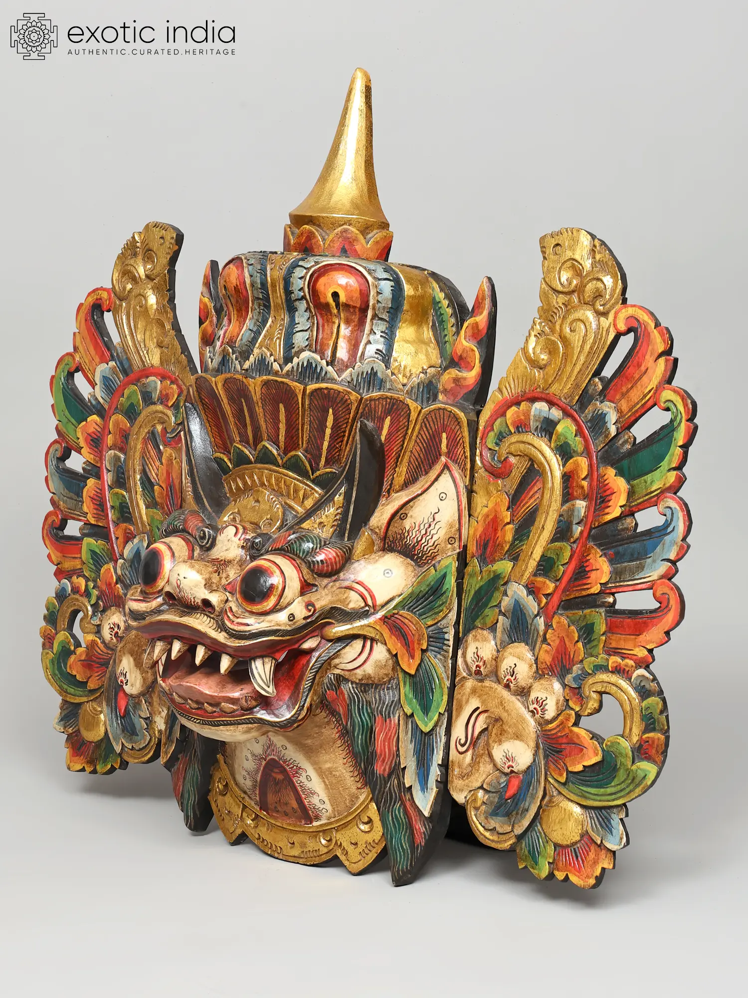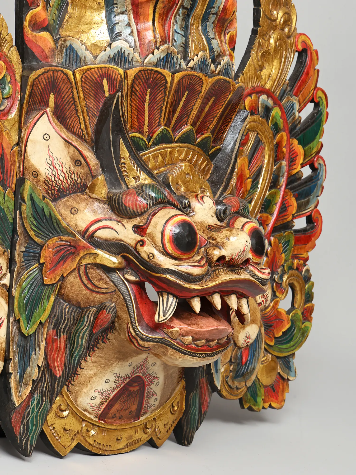 You'll appreciate the commanding presence of this piece, measuring an impressive 34 inches in width, 31 inches in height, and extending 9 inches in depth. Its substantial dimensions ensure it makes a significant visual impact, while the detailed wood carving showcases remarkable depth and texture. The vibrant polychromatic finish, featuring bold reds, blues, greens, and golds, adds an unparalleled vibrancy, drawing the eye to its many captivating elements.