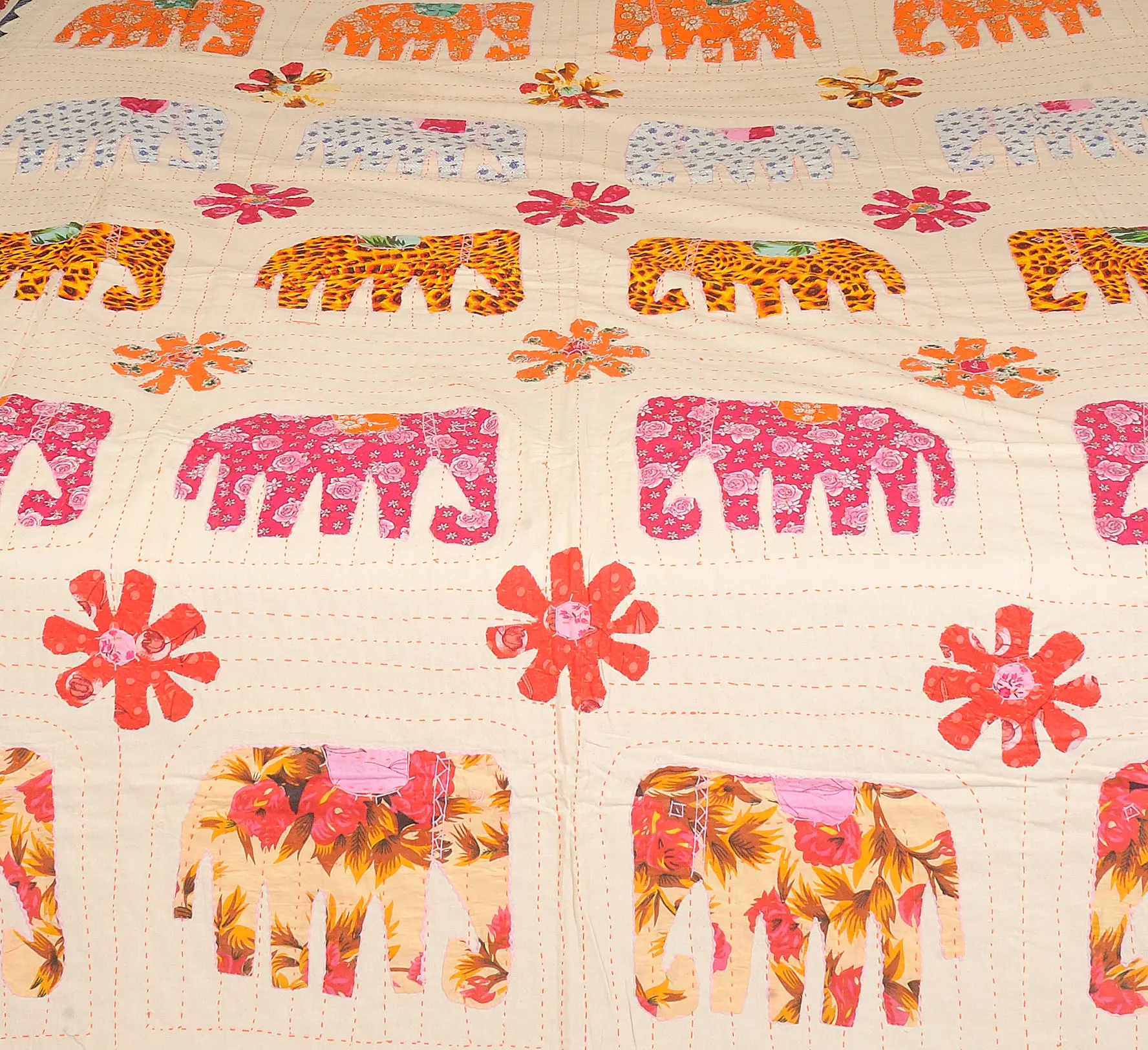 This piece of home decor is a cross-cultural collaboration of two fine arts of Applique with Kantha Stitch Embroidery made into Jodhpur Bedcover. Applique consists of carefully chosen pieces of colorful fabric skillfully sewn onto the backdrop of darker material. There are regal elephants as well as blooming flowers appliqued that will add splashes of colors and culture to the bedroom decor. The spaces between these complex forms are elegantly filled by the Kantha Stitch, comprised of straight lines. Bordering the masterpiece is the double border of the bed cover that emphasizes its beauty. This piece will elevate any decor with a contemporary take on traditional art.