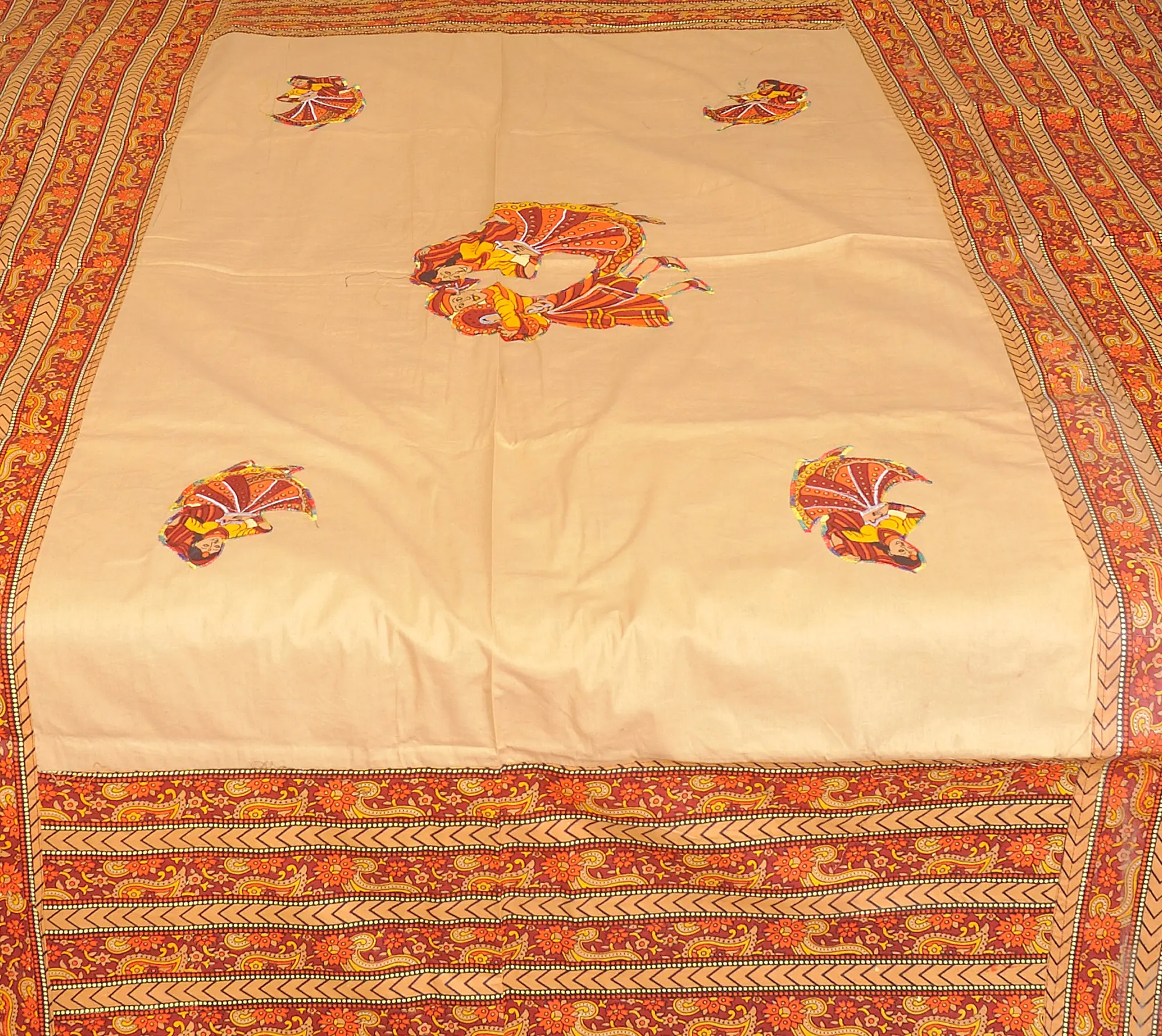 This work of art, which is made entirely of cotton, not only offers opulent comfort but also a tale of creative skill and ethnic diversity. The beautiful applique work with dancing ladies offers a sense of traditional beauty to your decor, representing the vivid traditions of Gujarat. Included are matching pillow coverings that complete the set. Embrace the blend of elegance and legacy, as this bedspread not only complements your decor but also beckons a good night’s sleep in its soft, pure cotton texture.