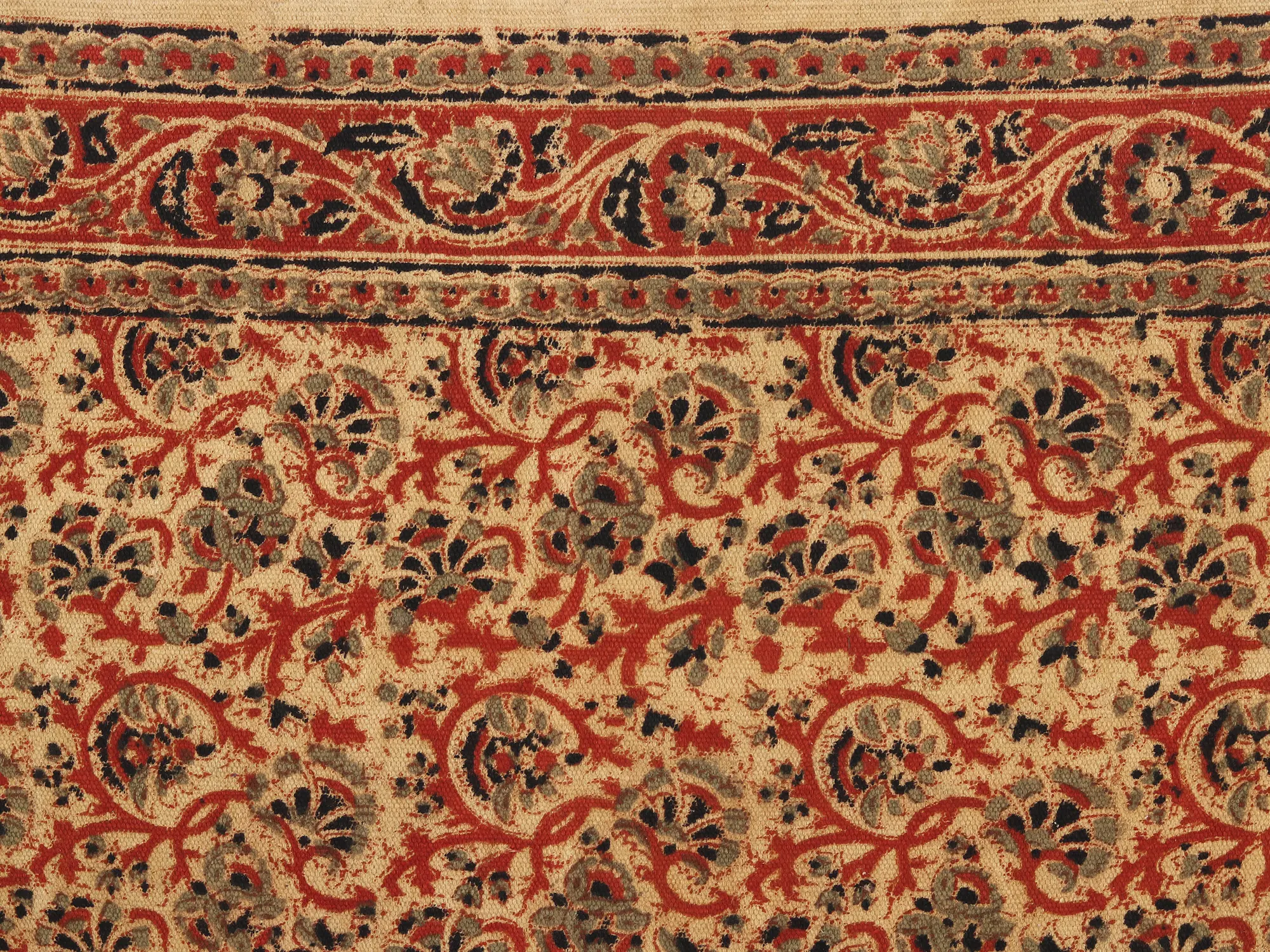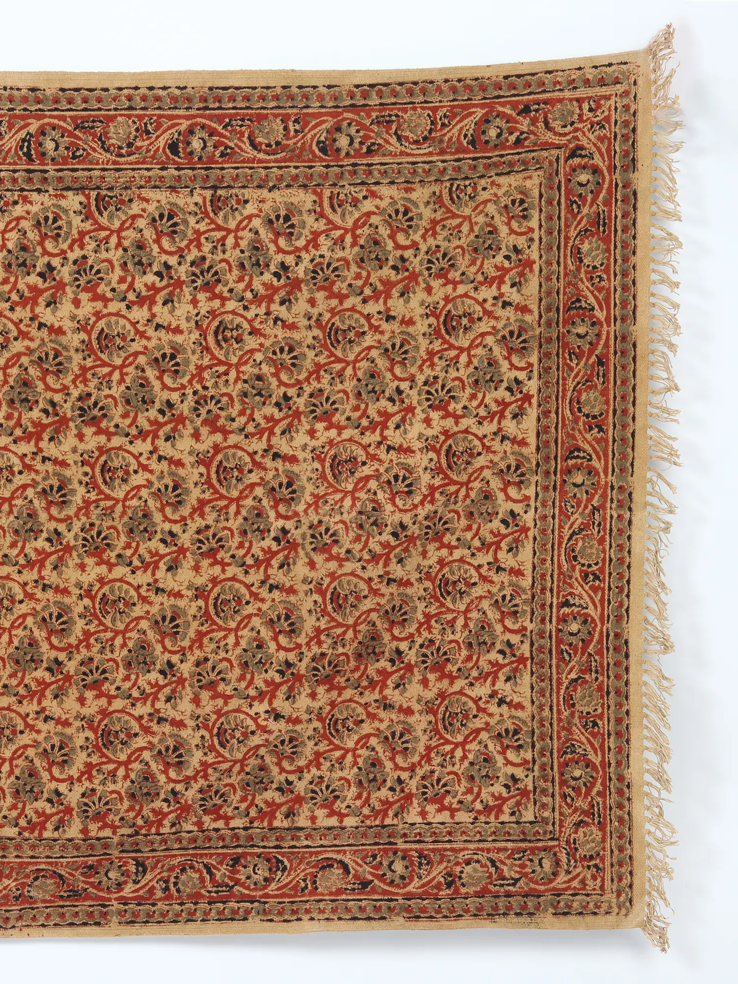 This “Dhurrie” from Telangana, decorated with stunning ‘Printed Floral Vines’ and ‘Kalamkari embroidery,’ transports you to a world of classic beauty. Each thread weaves a narrative of heritage and refinement, signifying the combination of pen and craftsmanship inherent in “Kalamkari”. This masterpiece exceeds ordinary decor; it signifies legacy, culture, and a vast tapestry of tales.