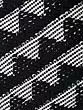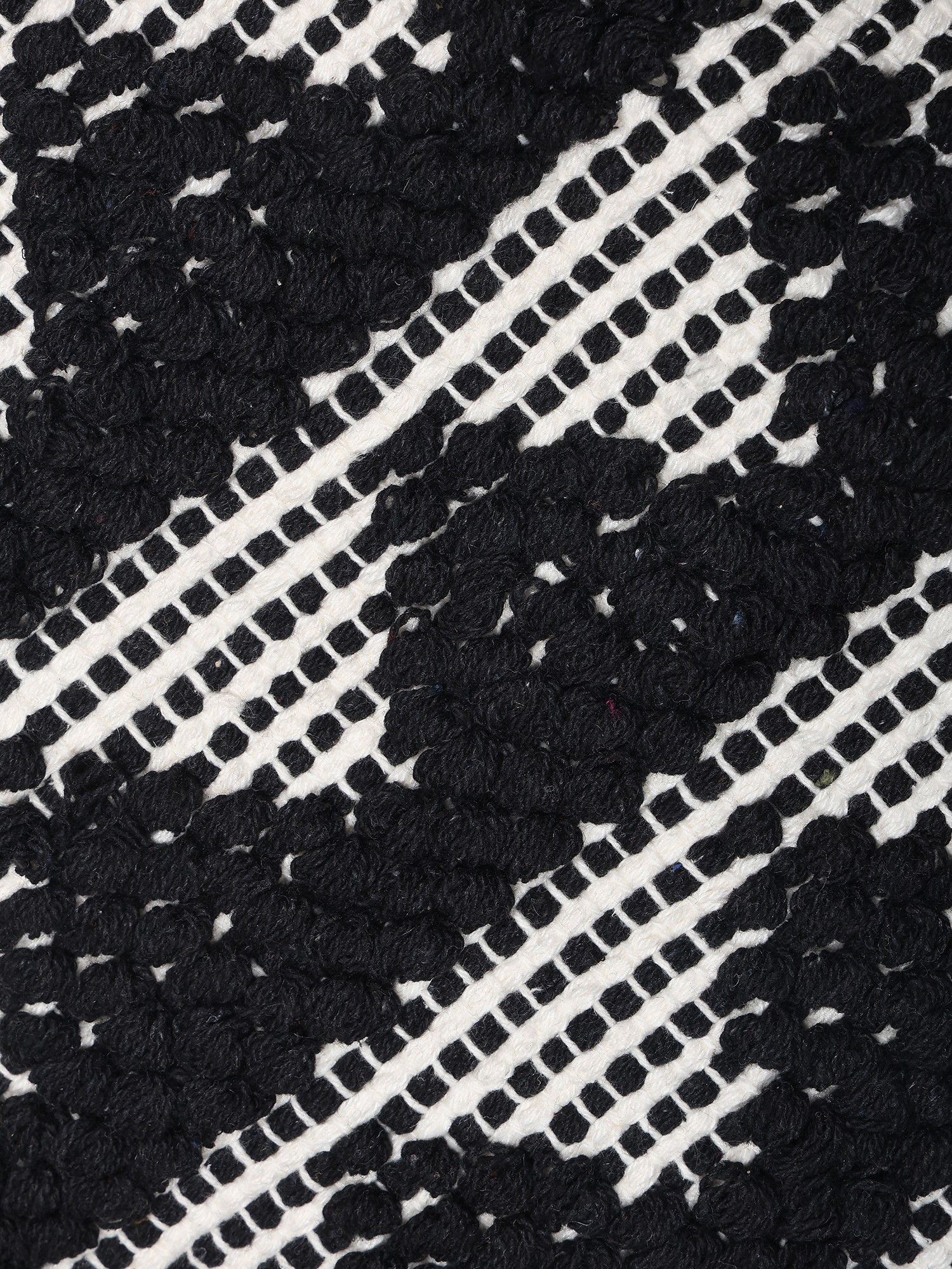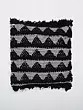 The captivating geometric patterns, rendered in rich black wool against a crisp white background, create a visual rhythm that draws the eye. This design, measuring a generous 15 inches by 16 inches, offers a pleasing scale for various placements. The playful yet refined fringes adorning the edges add a final flourish, imbuing the design with a sense of movement and artisanal charm.