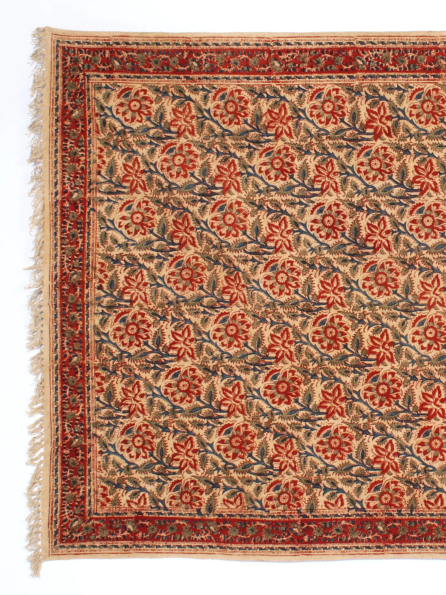Immerse yourself in the rich heritage of Indian textile art with this exquisite Kalamkari carpet. Originating from the vibrant state of Telangana, known for its deeply rooted artistic traditions, this carpet is a testament to the meticulous craftsmanship passed down through generations. The art of Kalamkari, which translates to "pen-work," involves intricate hand-painting or block-printing on fabric, creating designs that are both detailed and evocative. This particular piece showcases a captivating pattern of blue and red floral vines set against a warm, neutral background.
