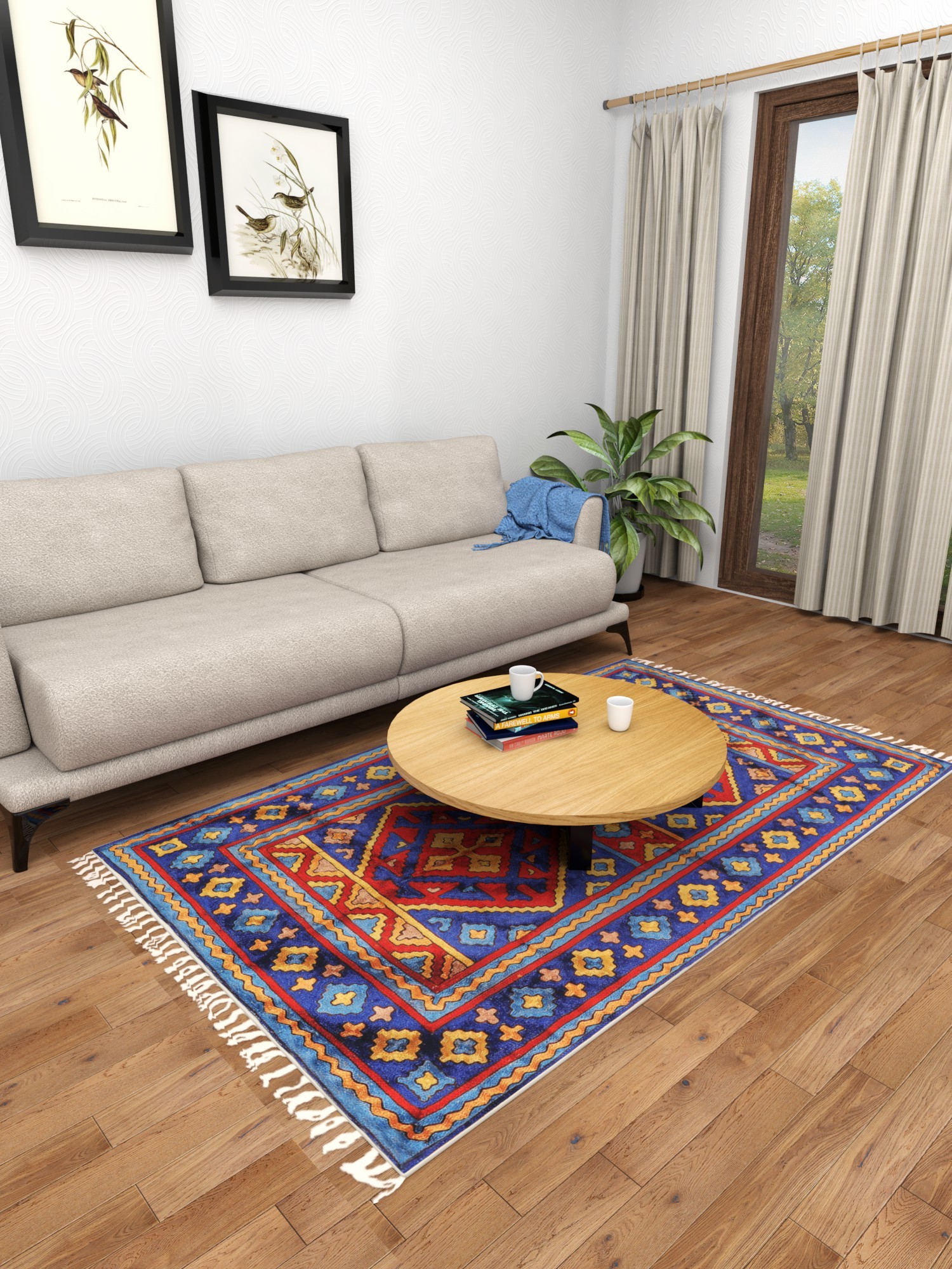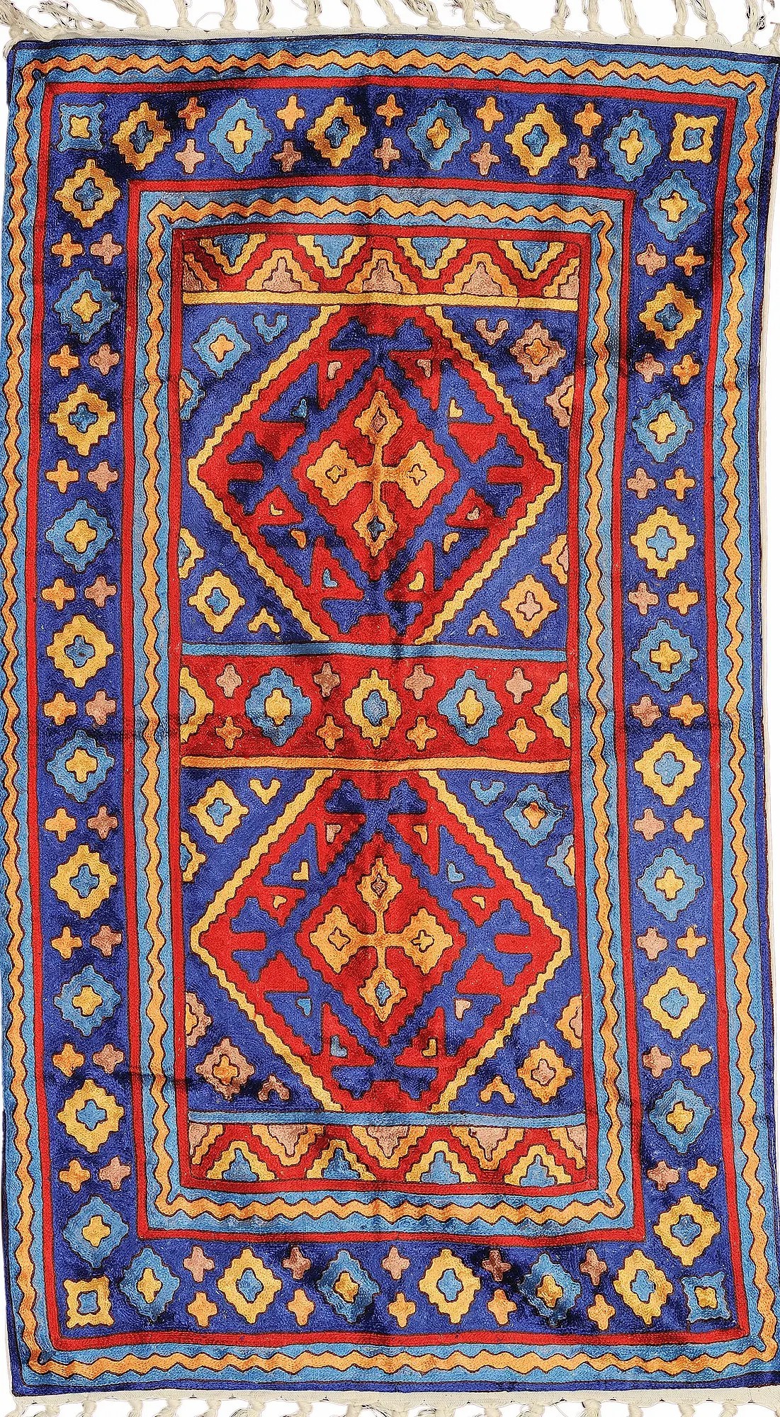 Immerse yourself in the rich cultural heritage of Kashmir with this meticulously crafted piece. This stunning mat showcases the timeless artistry that has been passed down through generations of skilled artisans. The vibrant color palette, dominated by bold blues and passionate reds, creates a visually striking centerpiece that is sure to captivate and enhance any space. Every detail, from the intricate embroidered motifs to the carefully selected color combinations, tells a story of tradition and dedication to excellence. The texture invites you to reach out and feel the work of dedicated hands.