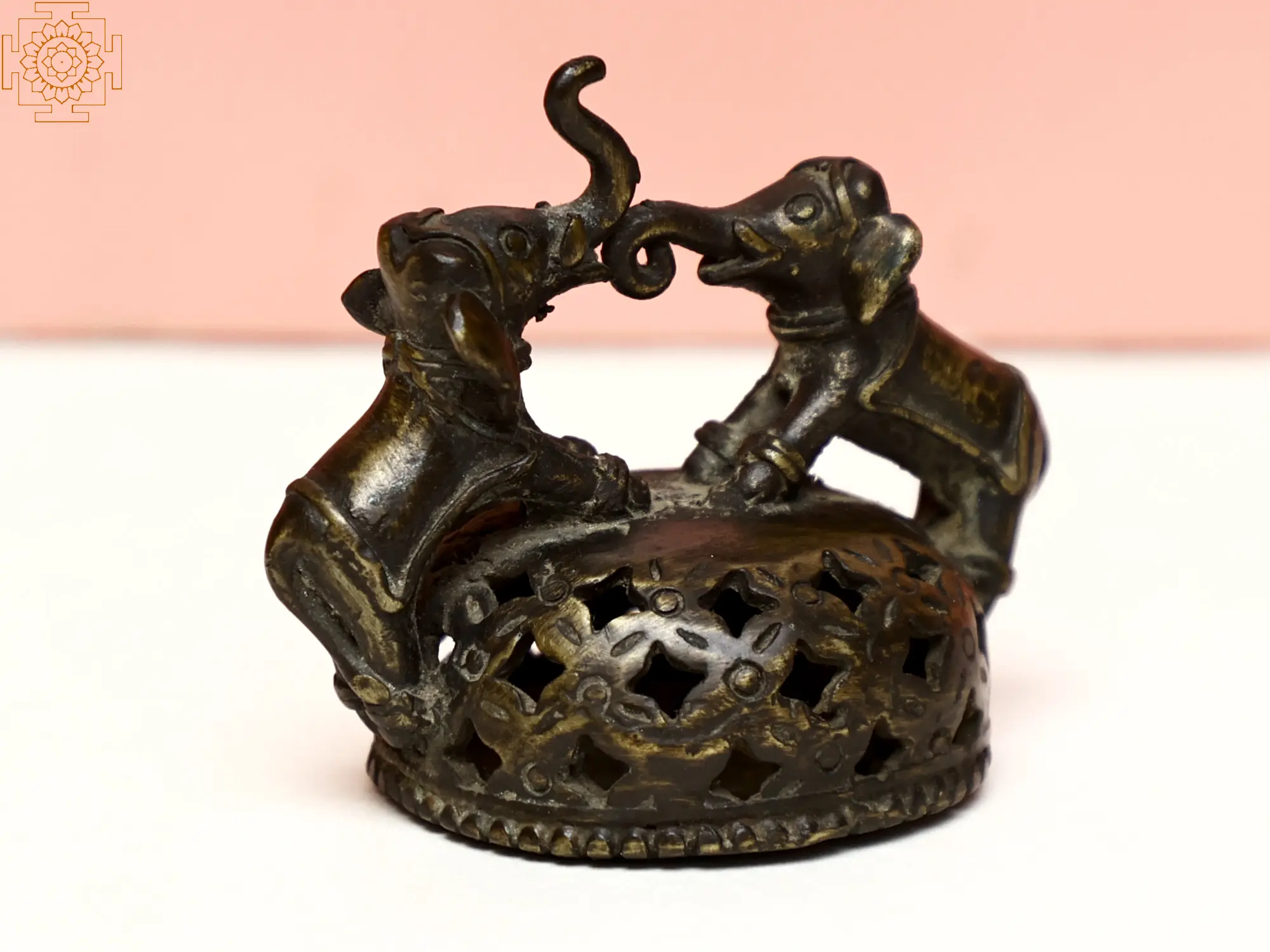 The artistry displayed in this figurine is evident in every curve and contour. The elephants are depicted with a lifelike quality, from the textured skin suggested by the casting to the expressive posture of their heads. The intricately designed base, adorned with delicate floral cutouts, adds another layer of visual interest, allowing light to play through the openings and cast enchanting shadows. This ornamental base not only provides a sturdy foundation but also elevates the overall aesthetic of the piece, showcasing the artisan's skill in metalwork. ––––––––––––––––––