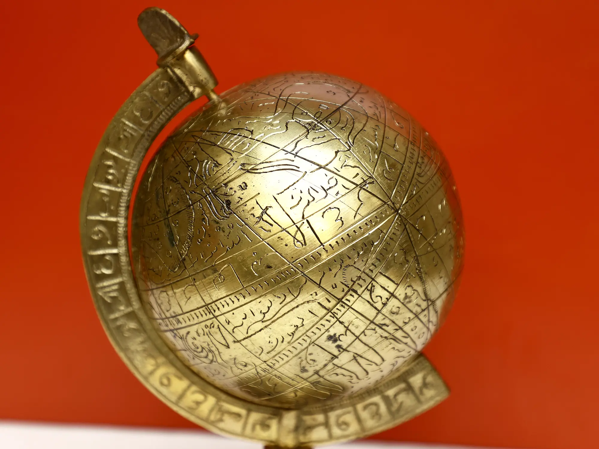 The globe itself is a miniature representation of our world, with continents and oceans delicately delineated. What sets this piece apart are the meticulously engraved lines of Arabic script that adorn its surface. These inscriptions are not merely decorative; they speak to a deep cultural and scientific heritage, hinting at the historical understanding and artistic expression that flourished in the Islamic world. The precision of the engraving suggests a skilled artisan dedicated to capturing both earthly geography and spiritual narrative.