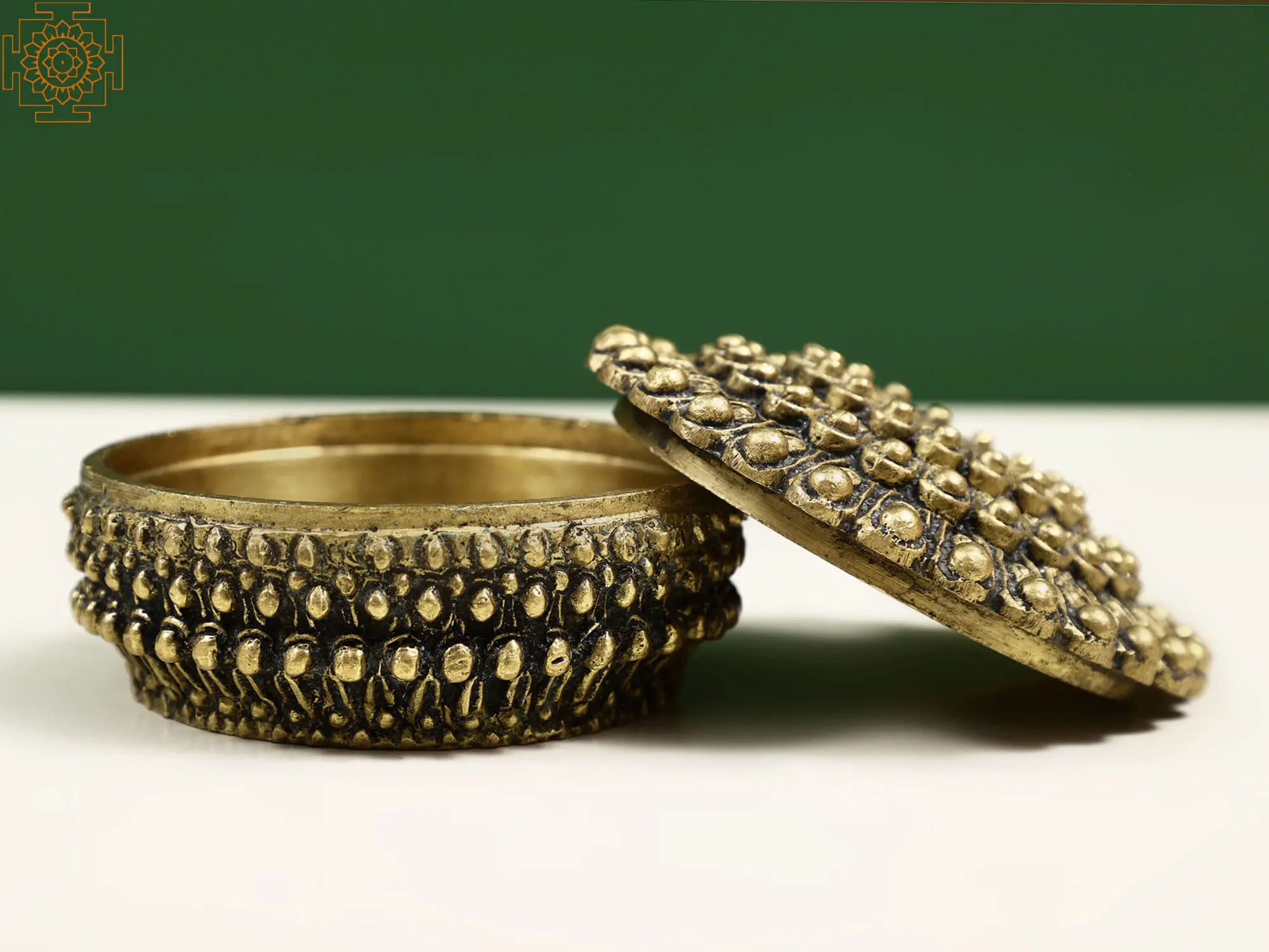 Whether you want a beautiful and auspicious gift for a loved one or are looking for something for your trousseau, this brass Kumkum is a beautiful piece. Crafted with fine details, and made with durable brass, in a traditional style, the box is adorned all over with petal motifs, giving it an ornate beauty, you will adore.