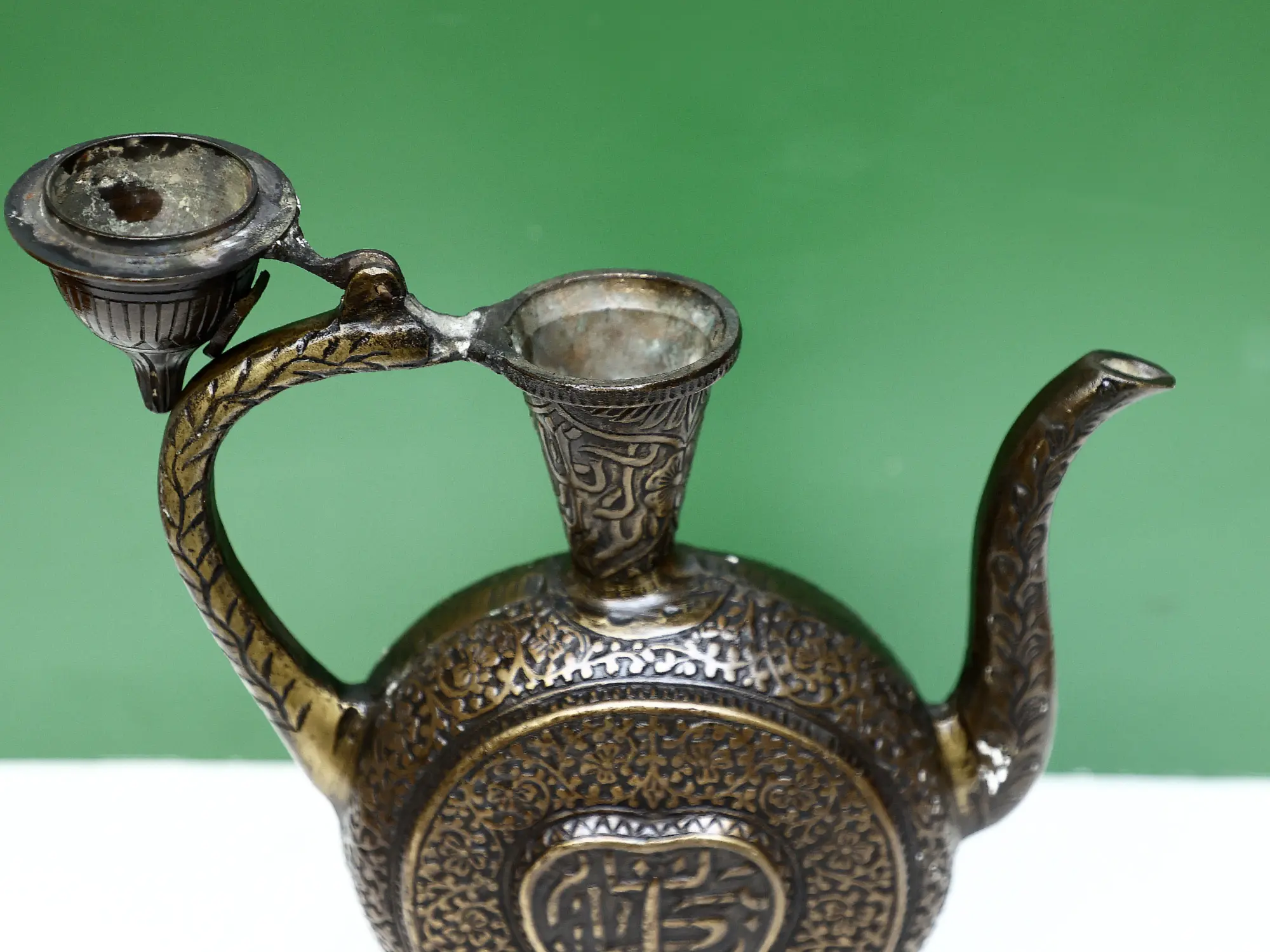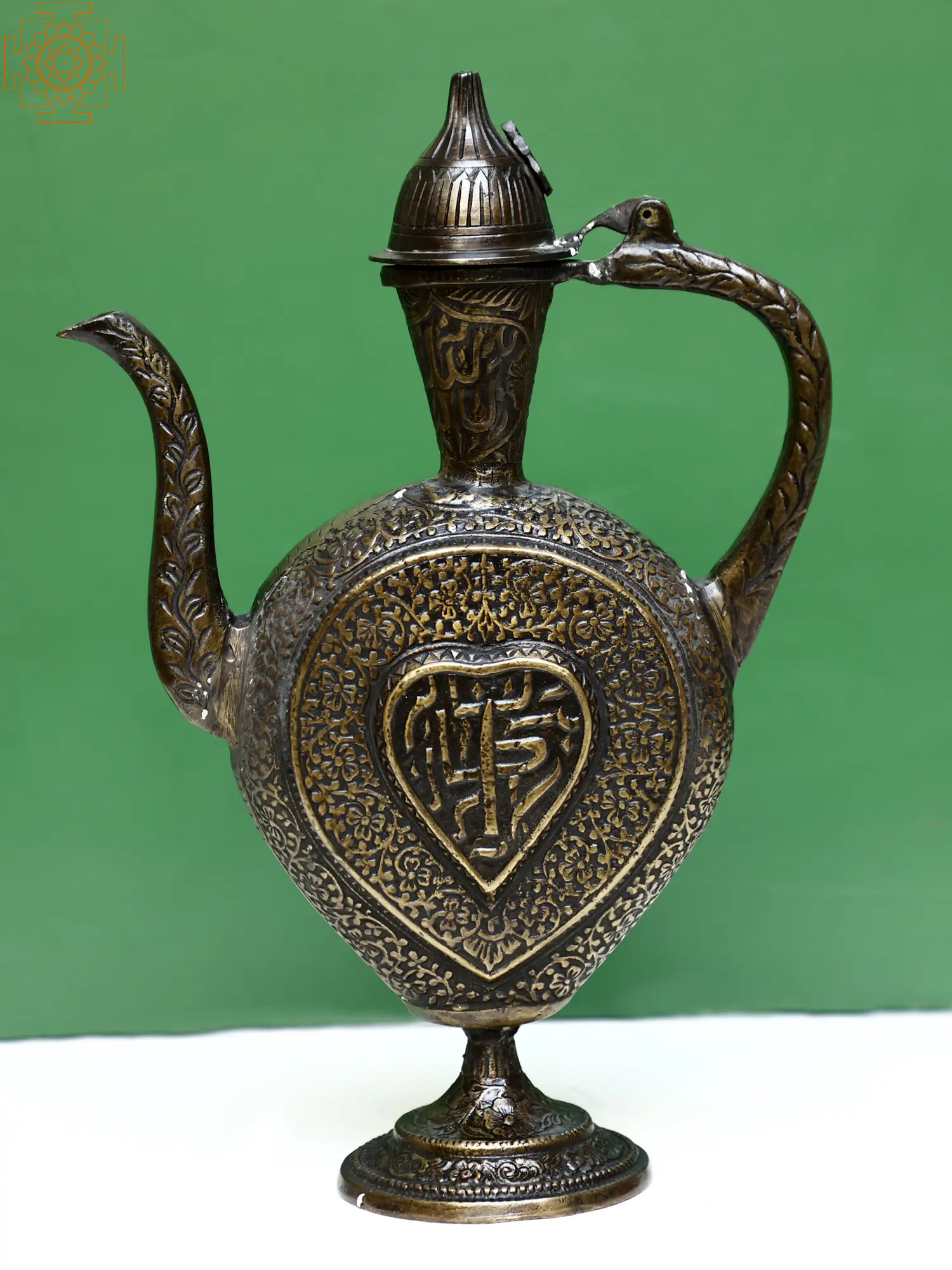 The entire surface of this surahi is a canvas for breathtaking craftsmanship. Delicate floral motifs are meticulously etched, creating a mesmerizing tapestry of patterns that flow seamlessly around its generously proportioned body. At its heart, enclosed within a beautifully rendered heart shape, lies an area of deeply carved script, adding an air of mystery and cultural significance. The handle, designed in the likeness of a serpent with its head poised to guard the opening, is an artistic marvel in itself, showcasing the artisan's skill in bringing metal to life. The accompanying lid, also adorned with detailed carvings and a unique finial, completes the vessel with an undeniable touch of regal charm.