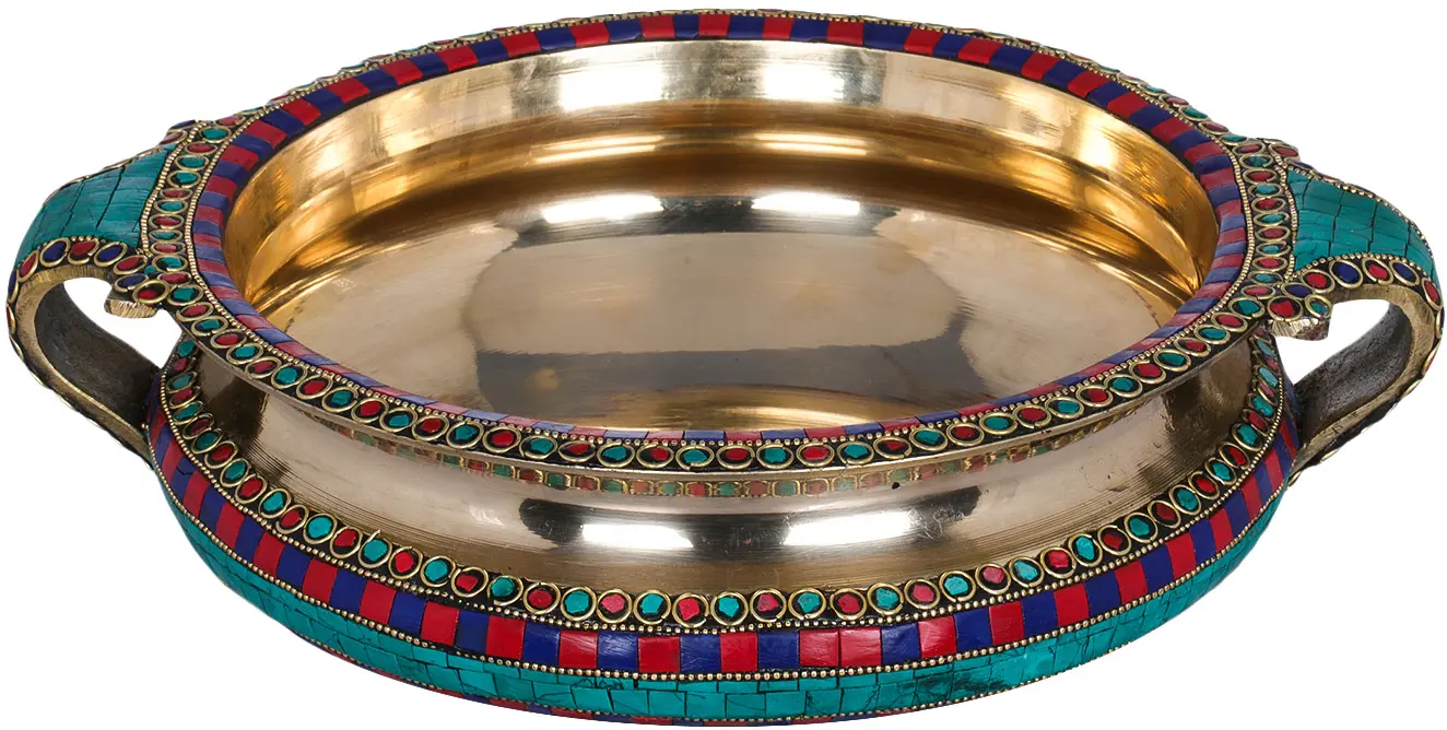 The inlay featured on this brass Urli is commonly known as the turquoise inlay, yet it has evolved into a colorful dance of stones. The decorations on the body of the Urli, aided by blue and red stones and brass rings, make it seem regal and appealing. This Urli is made of high-quality brass and is ideal for festive decor. When filled with water, it can also function as a negative energy eliminator, as indicated in Vaastu.