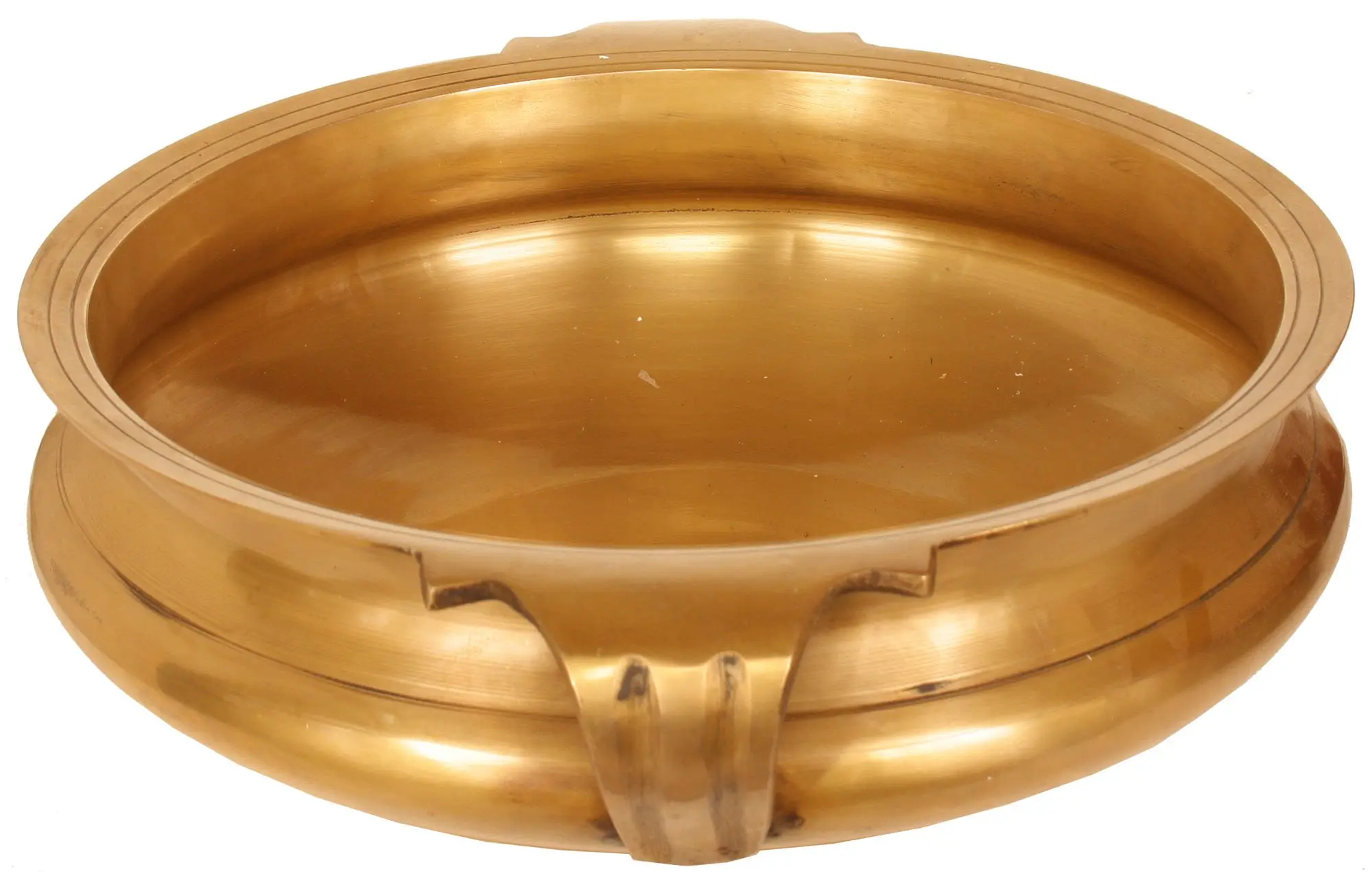 This traditional and simple Urli is constructed of very durable brass and exemplifies the charm of basic patterns. It possesses the ancient characteristics of an Otturuli or Varpul, such as a shallow body and a broad mouth. The base is practically flat, making it suitable for floor home décor. The antique hue on the body makes it more regal. The vessel may hold enough water to keep diyas afloat and create a wonderful ambiance in a location.