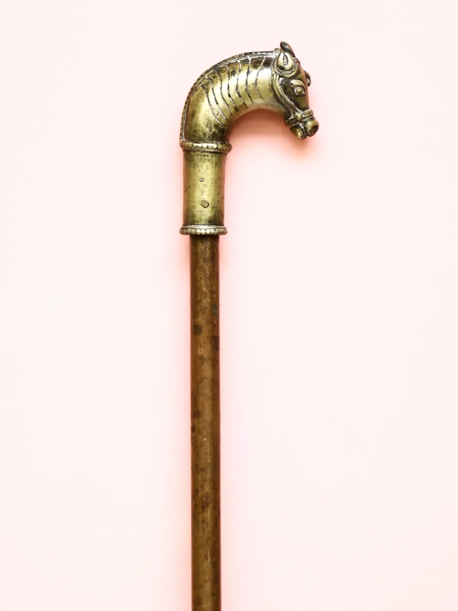 This vintage brass and copper with wood cane is an ideal and plain choice, whether you need help when you walk or a little bit of history for your home decor. Constructed from a robust wood, the cane's handle, adorned with a tranquil horse, gives a magnificent feel to the design, with its detailed and antiquated finish.