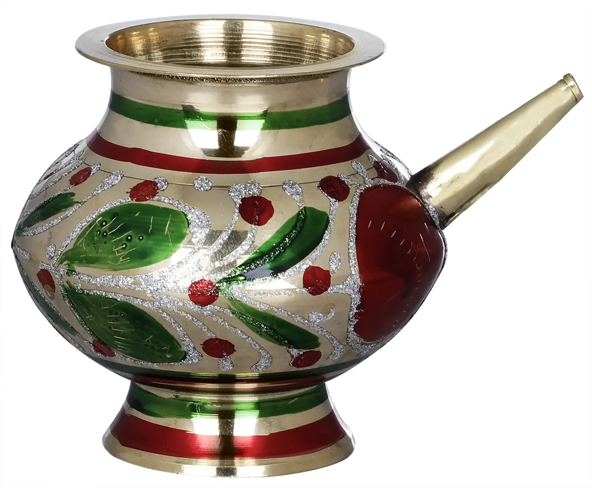 Add a burst of color to your rituals with the Colorful Small Ritual Kettle. This kettle isn't just for boiling; it's a vibrant companion to your traditions, a testament to Indian craftsmanship, and a symbol of ritual charm. As you use it, it carries the essence of vibrant ceremonies, and its colorful design reflects the artistic flair of India's cultural heritage. This Ritual Kettle isn't just an item; it's a splash of tradition and a tribute to skilled craftsmanship.