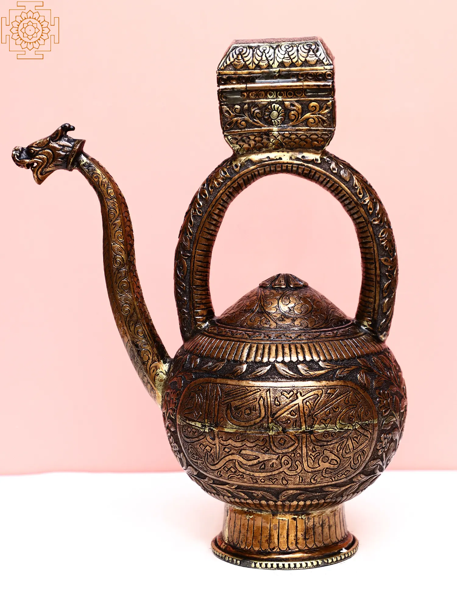 The surahi's design is a harmonious blend of form and fantasy. The generously proportioned body boasts a beautifully rounded silhouette, adorned with deeply incised patterns that draw the eye. These intricate etchings, possibly featuring script or symbolic motifs, wrap around the vessel, creating a mesmerizing visual texture. The graceful curve of the handle provides a comfortable grip, leading to a cap that mirrors the ornate detailing of the surahi itself, suggesting a secure closure for whatever precious contents it may hold. The true focal point, however, is the dragon's head spout. With its fierce yet refined features, sharp teeth, and alert eyes, the dragon adds an element of mythical power and ancient lore. The detailed rendering of scales and expression imbues this element with a lifelike quality, making it appear as if the creature itself is poised to pour forth. The confluence of the functional spout with this powerful imagery creates a unique and memorable aesthetic. ––––––––––––––––––––