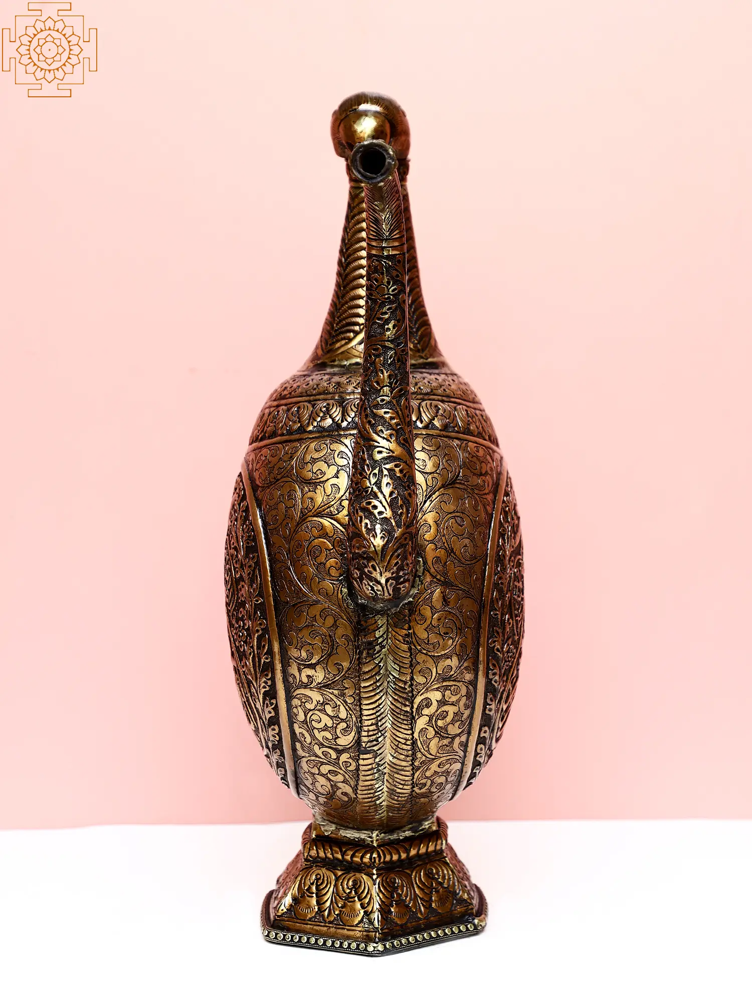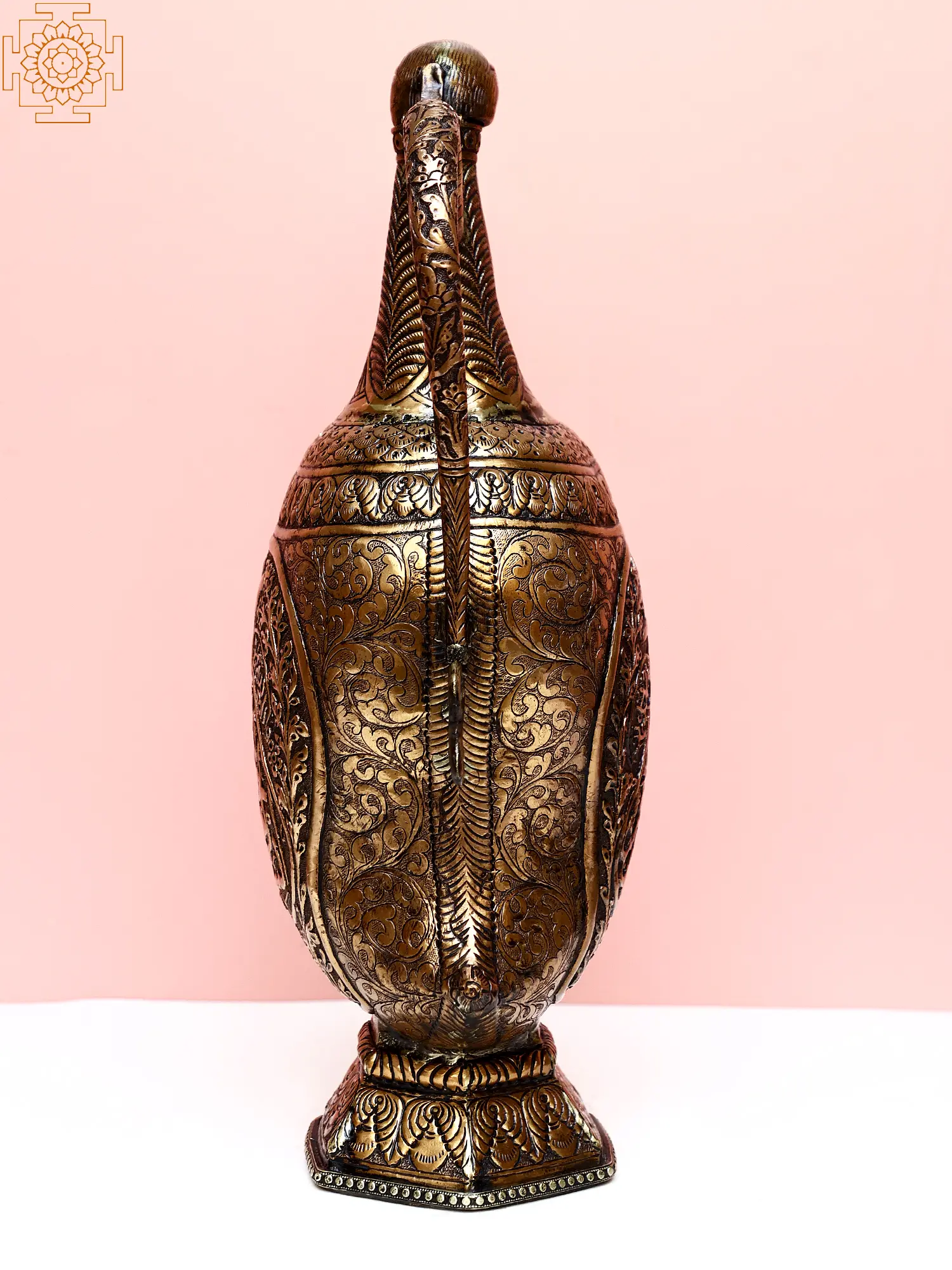 The surahi's body is a canvas of remarkable detail. Rich, hand-etched patterns, reminiscent of ancient motifs and floral designs, adorn its surface, catching the light and creating a dynamic play of shadows. The meticulous craftsmanship is evident in every curve and contour, showcasing the dedication and skill of the artisans who brought this piece into existence. The long, elegant spout, gracefully curved, suggests a heritage of hospitality and ceremonial pouring.