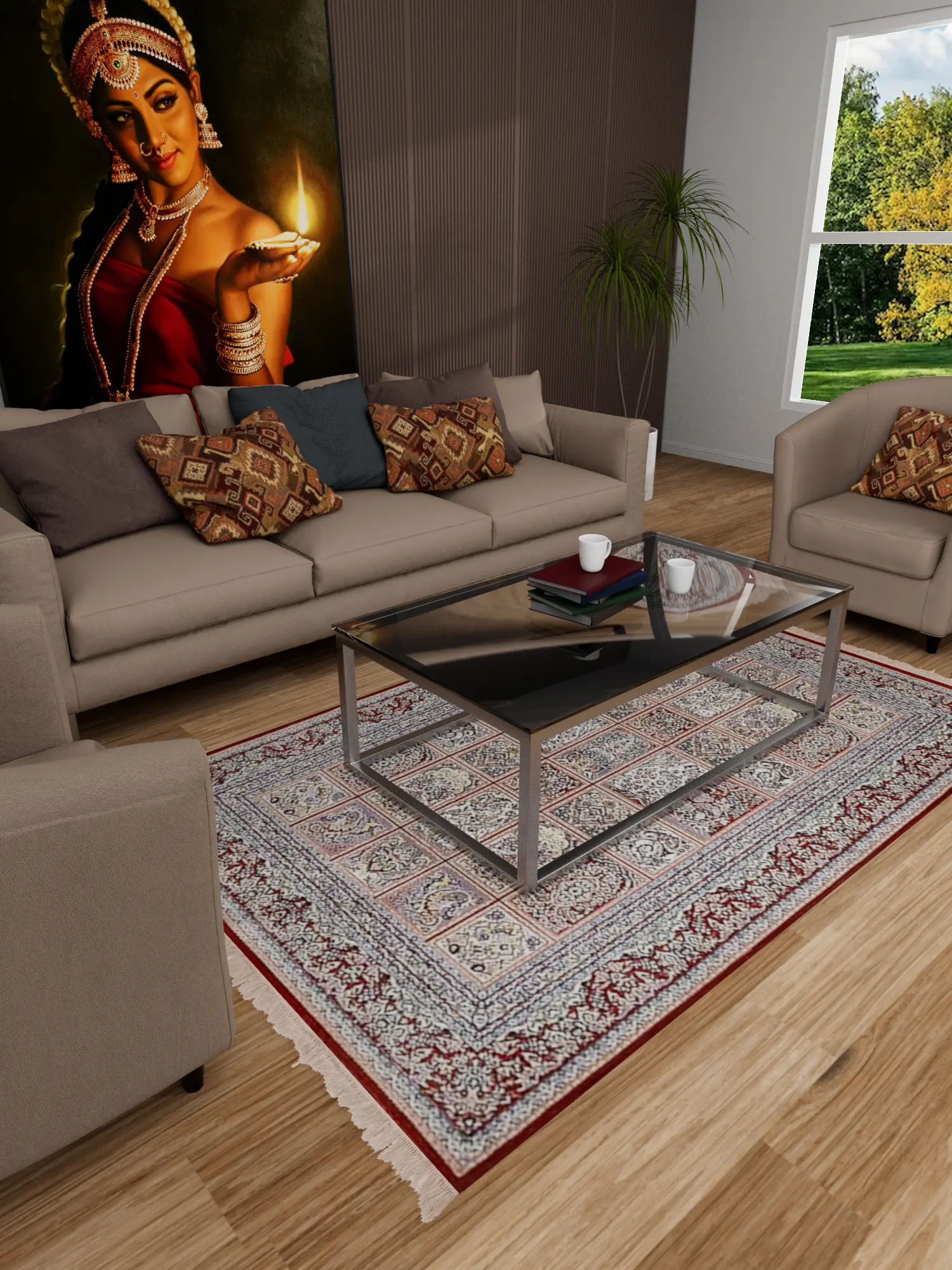 Off-White Chain Stitched Kashmiri Carpet with Floral Silk Threadwork