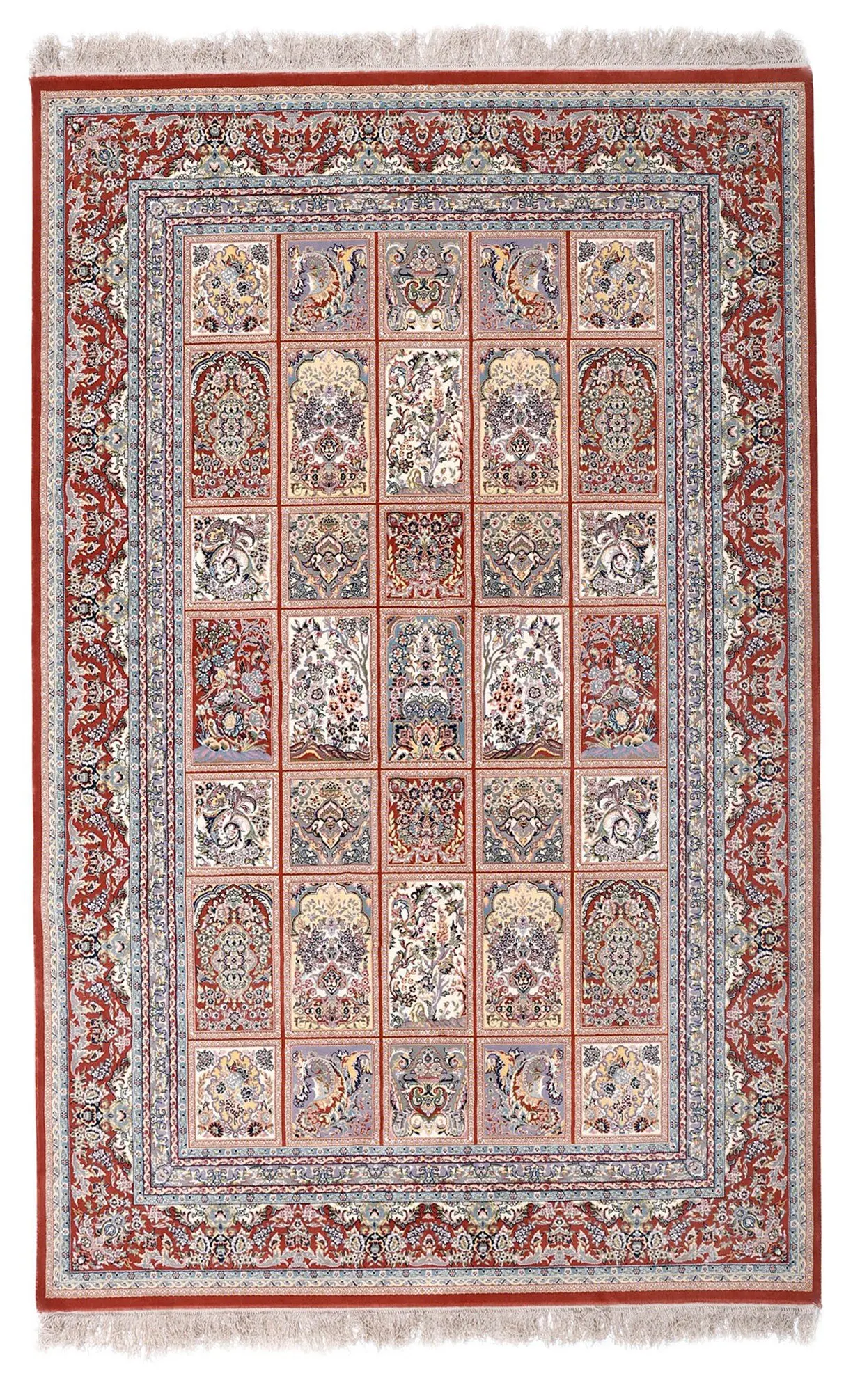 Mars-Red & Blue Chain Stitched Silk Asana Carpet from Kashmir