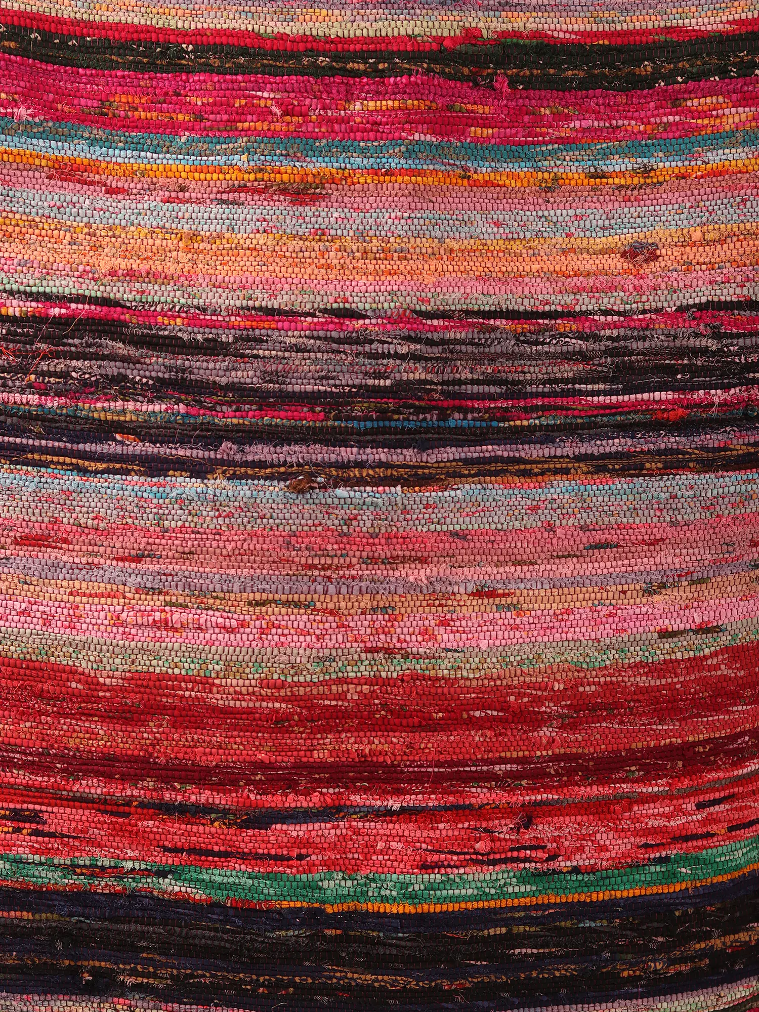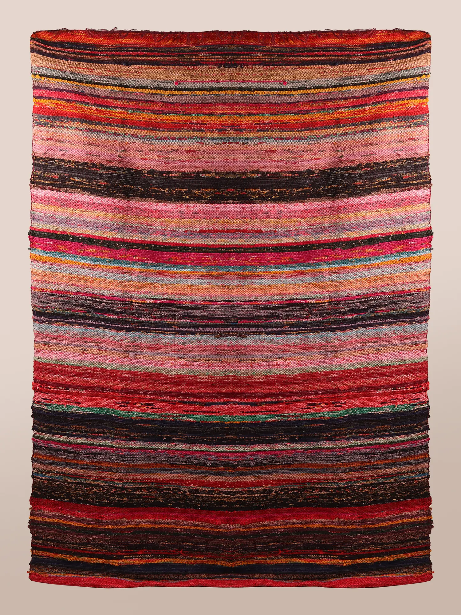 Each thread whispers stories of resilience, woven into vibrant stripes that dance across its surface. Embracing the ancient artistry of “Chindi Dhurrie”, this rug, adorned with stripes pattern, symbolizes renewal and resourcefulness, crafted from recycled fabric scraps with a nod to eco-conscious living.