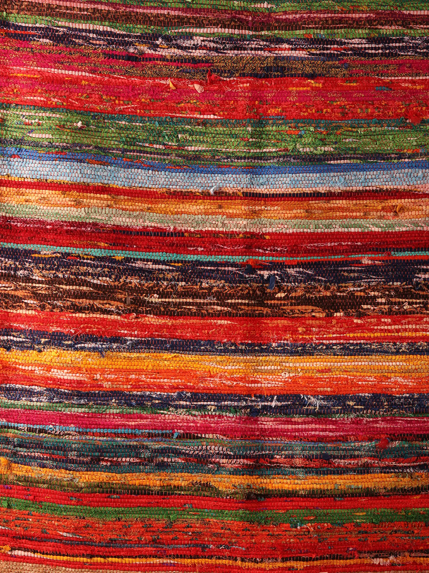 This Cotton Multicolor Striped Pattern Recycled Chindi Dhurrie epitomizes sustainable home decor, crafted from recycled cotton straps, exemplifying eco-conscious living. Its vibrant hues elevate aesthetics and contribute to a joyful ambiance, enhancing the overall mood of any space. The intentional use of recycled materials aligns with eco-friendly values, offering a guilt-free and stylish home addition.