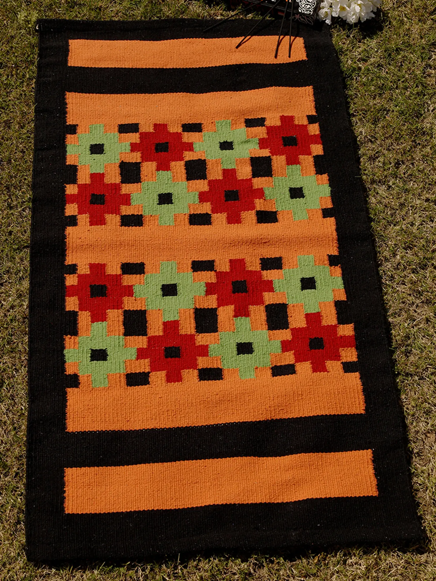 The broad black borders on all sides add depth to the design and make it even more attractive with the orange and black combination. This mat is perfect for sitting during pujas and can also double as a stylish home decor item, adding a touch of rural charm to any space.