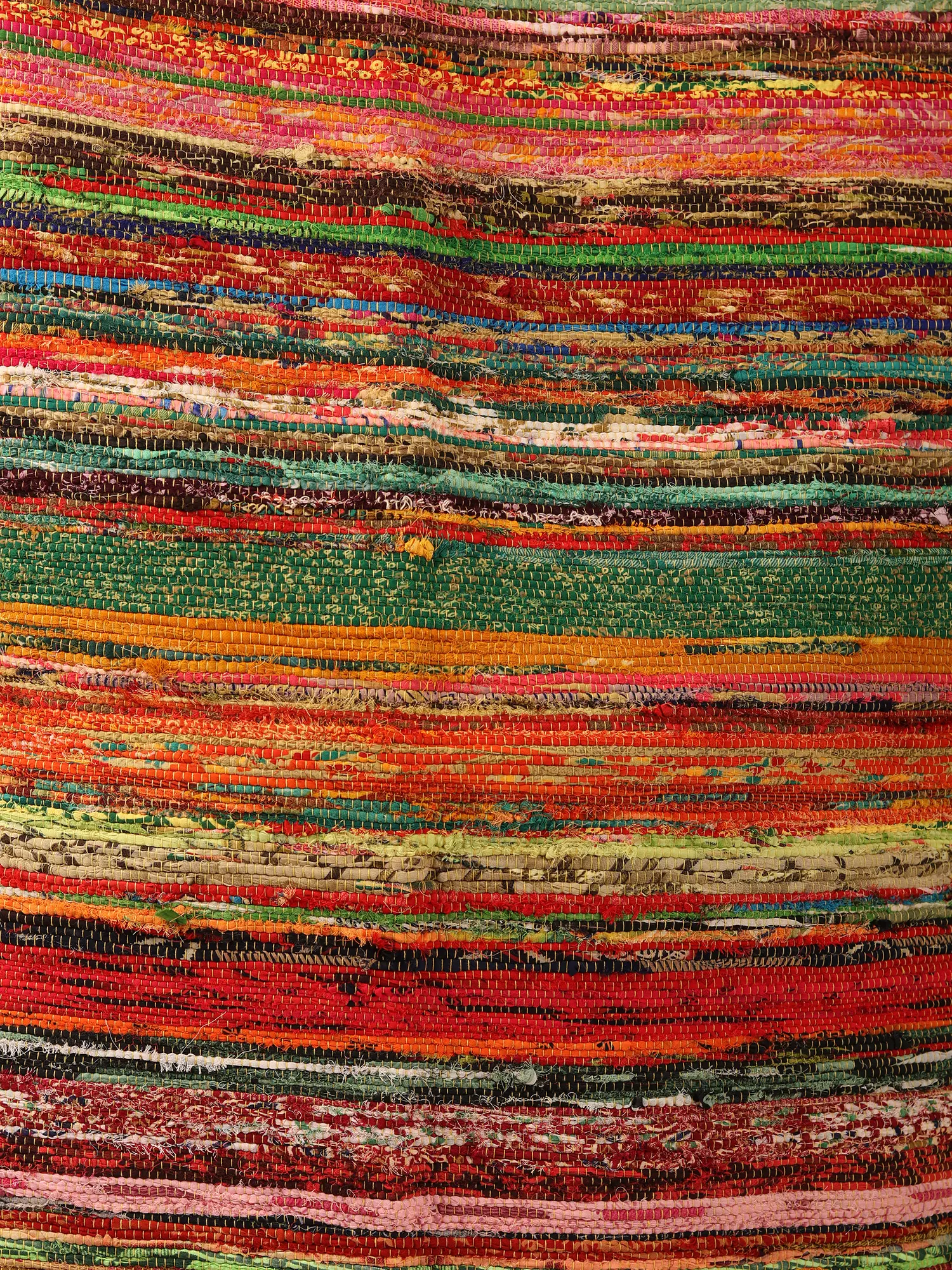 This “Cotton Recycled Chindi Dhurrie” transports you to an era of vibrant hues and eco-friendly design. This “Chindi Dhurrie,” made from salvaged fabric scraps and threads, conveys the tale of regeneration and innovation. The “Multicolor Stripes Pattern” flows over its surface, demonstrating the skill of Indian handweaving.