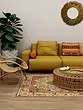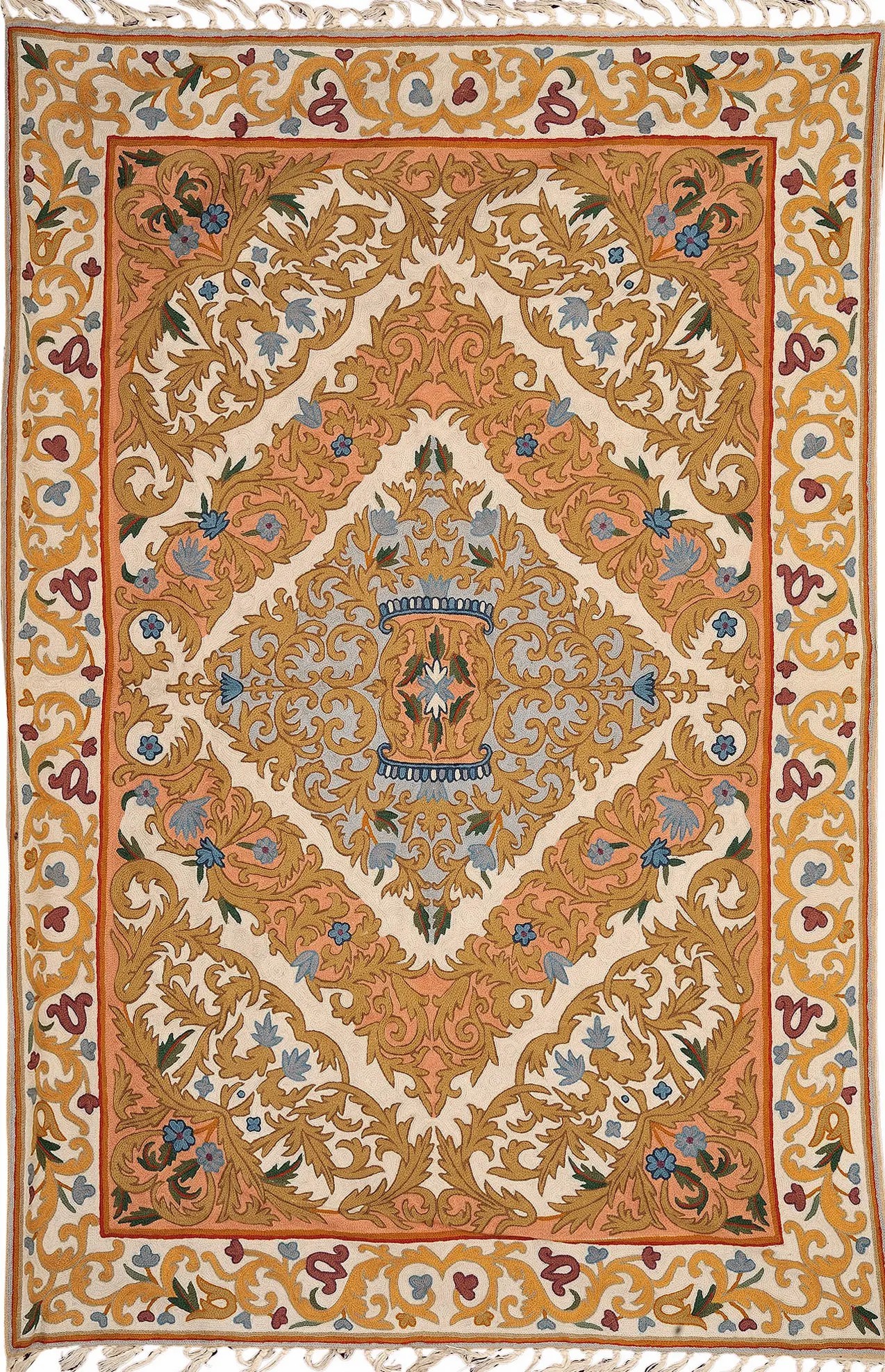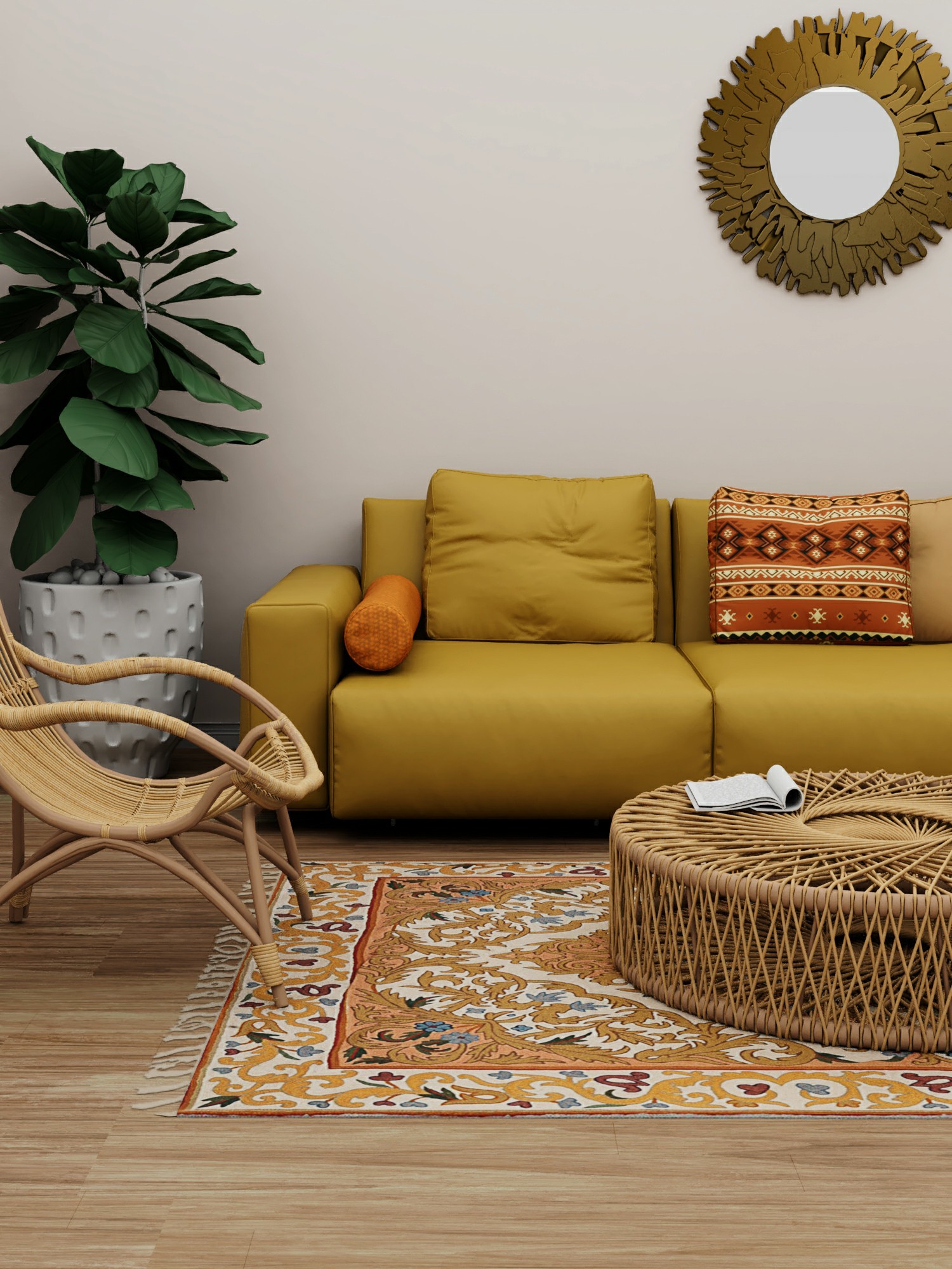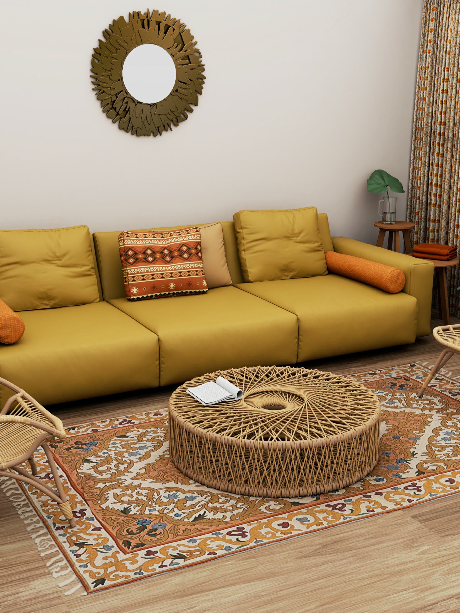 This asana is a unique piece of endemic Kashmiri handiwork. Bright colour-blocks and coalesced geometric shapes have been sewn into the canvas to put together an appeal that is at once aesthetic, Oriental, and sprightly.