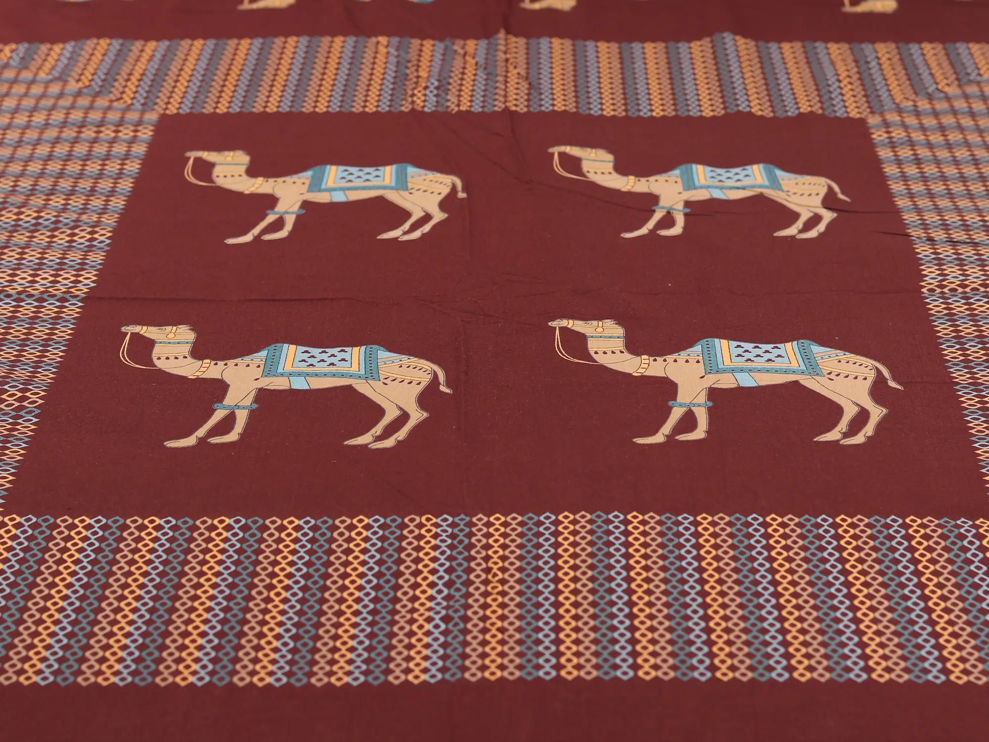Indulge in the luxurious comfort and captivating design of our Crimson-Red Camel-Link Motif Handblock Printed Cotton Queen Size Bedsheet. This exquisitely crafted bedsheet is more than just bedding; it's a statement piece that elevates your bedroom's ambiance. The rich crimson-red hue forms the perfect backdrop for the intricate camel motif, hand-printed using traditional block printing techniques. Each camel is meticulously detailed, showcasing the artistry and heritage behind this beautiful creation. The complementary patterns further enhance the design, creating a cohesive and visually stunning ensemble. Made from pure, breathable cotton, this bedsheet offers unparalleled softness and comfort, ensuring a restful night's sleep.