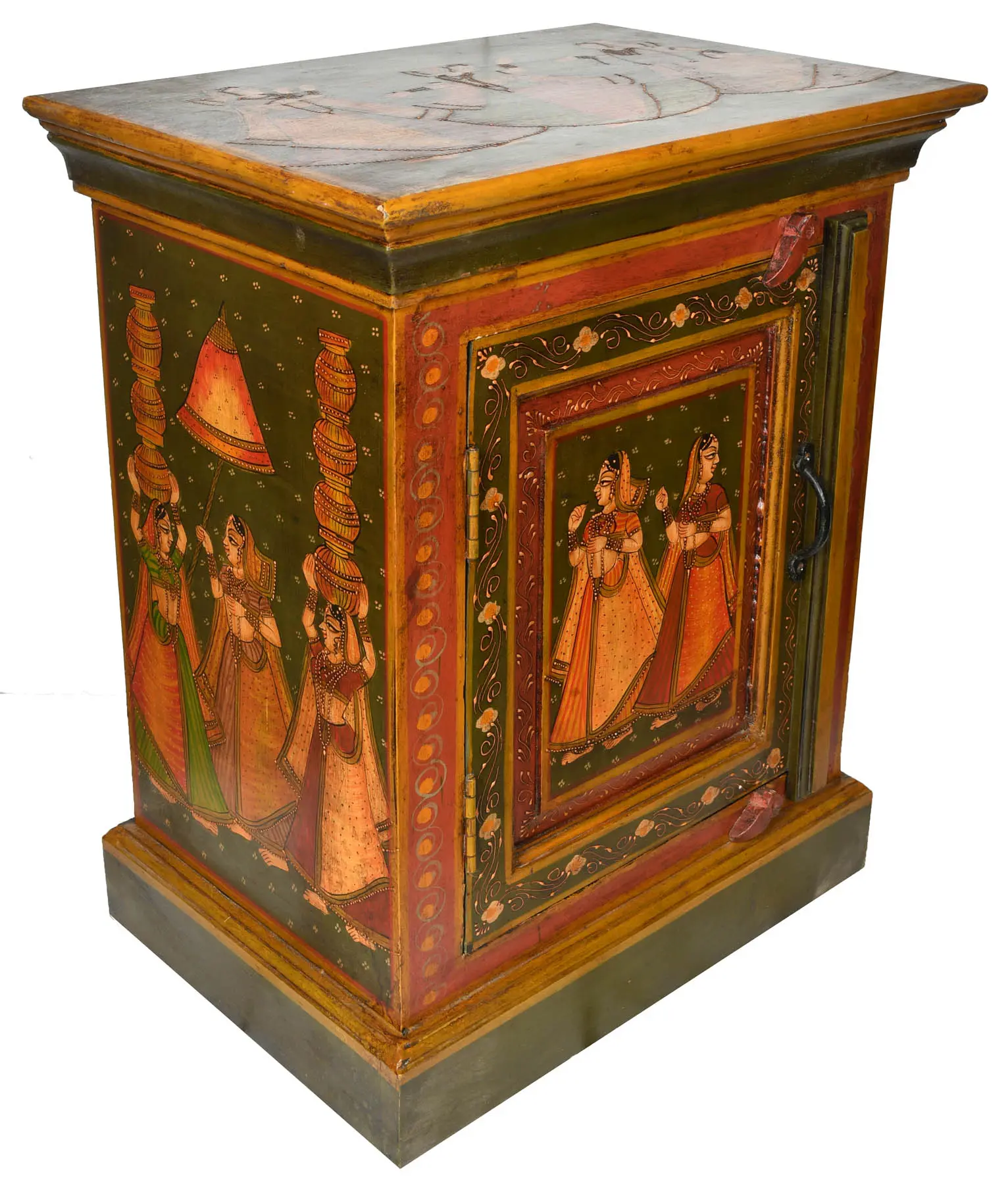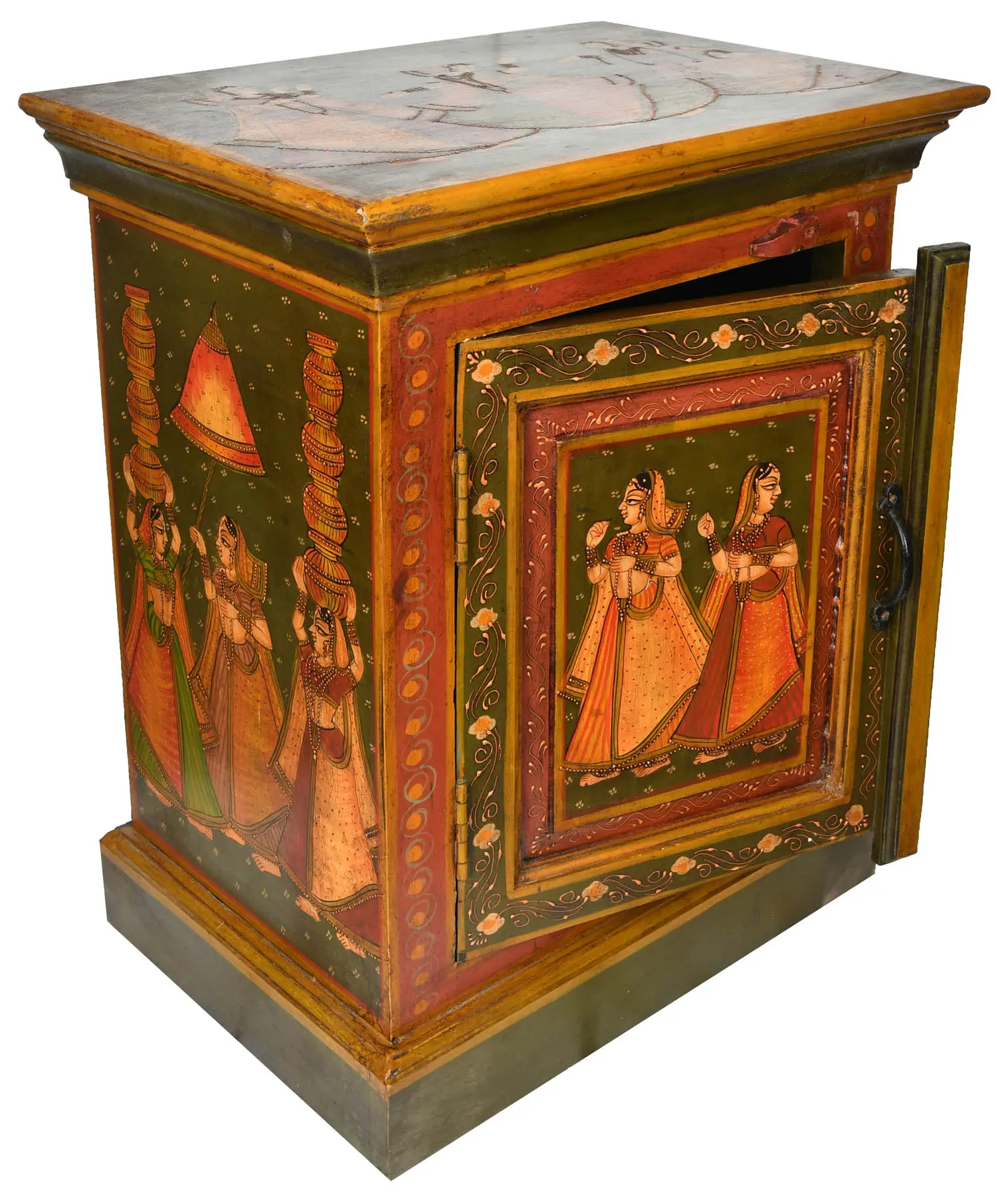The focus of the table is the central painting on the door, portraying two women in traditional attire and ornamentation. Each detail, from the flowing fabric of their garments to their delicate jewelry, is rendered with impressive care. The frame surrounding this central image is decorated with floral and swirl patterns, enhancing its visual appeal. The top surface offers a subtle hint of additional art, featuring figures that complement the overall aesthetic. The wood finish gives the piece an antique feel, creating a sense of history and timelessness. Its structure is sturdy, with a single door that opens to reveal storage space, blending functionality with its artistic design. This is an object that appeals to those with an eye for unique, globally-inspired decor. This distinctive piece effortlessly combines artistic beauty and practical utility. It promises to be not only a beautiful addition to your home but also a functional one.
