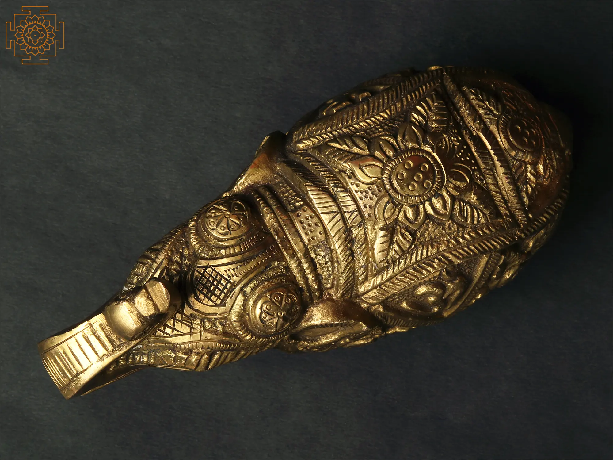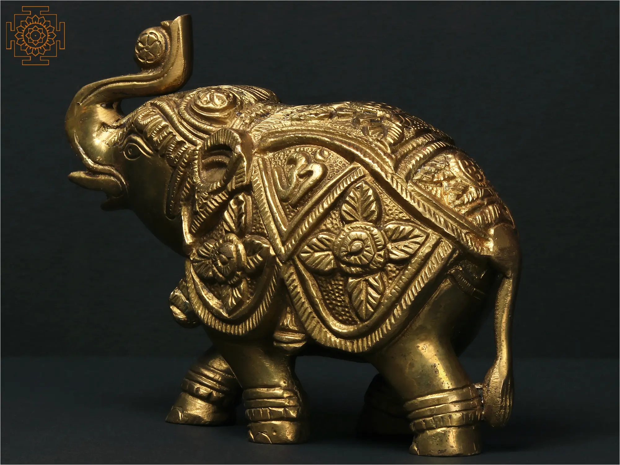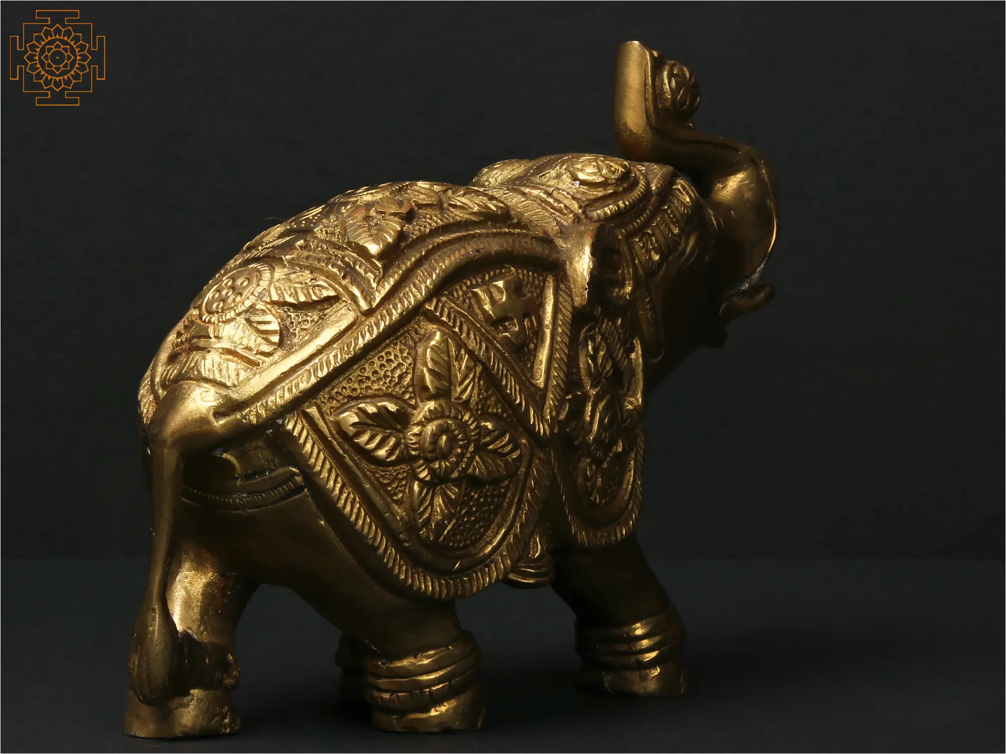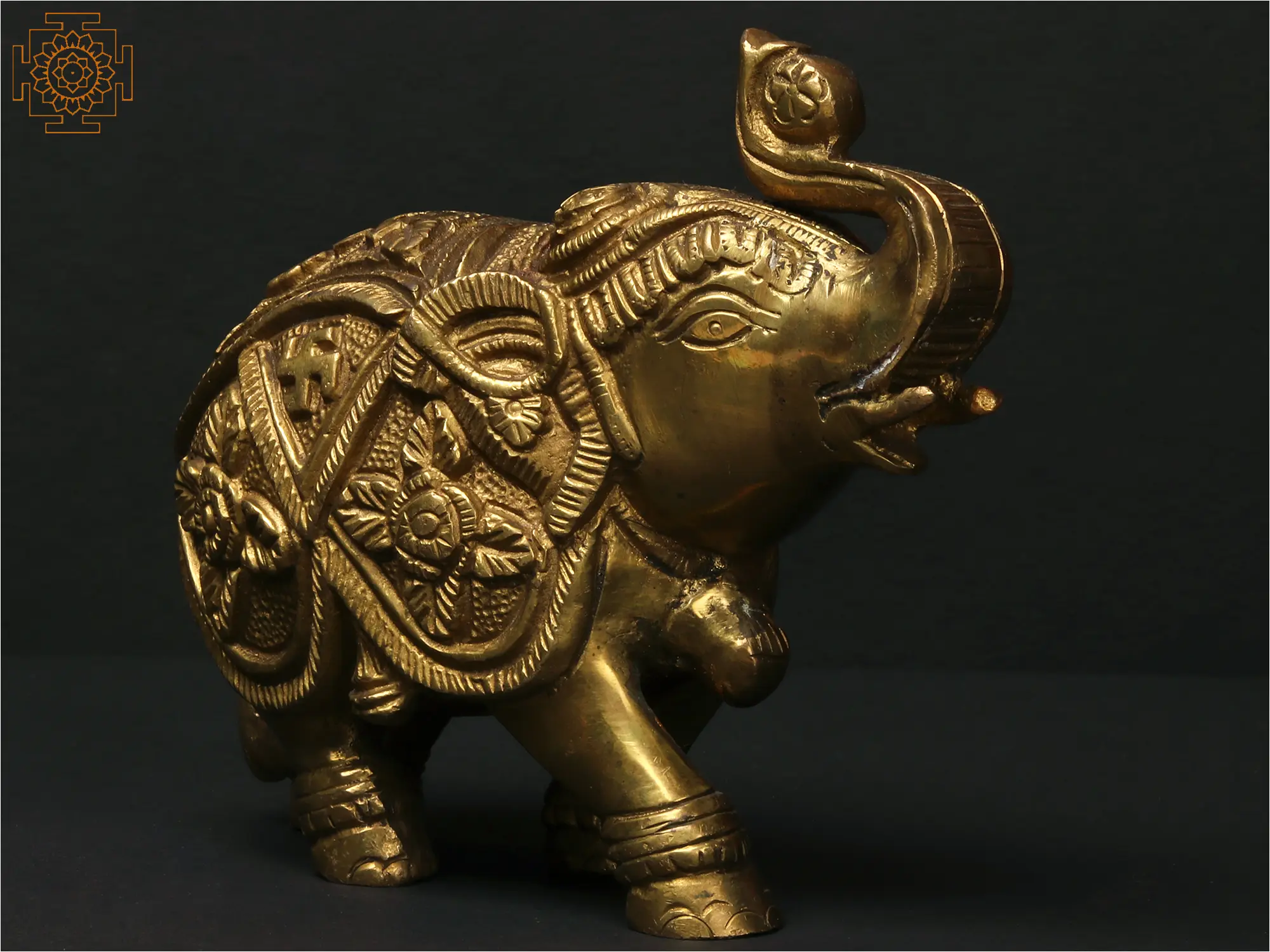Elephants are symbols of power and triumph. Their gigantic build has been incredibly efficient in squeezing the enemy troops to death. Elephants are also respected due to their association with Lord Ganesha. According to Vaastu, an elephant with its trunk up represents success, and animal statues in this position are sought-after decorative objects. This Fully Decorated Elephant Statue in Brass is an auspicious messenger. Its majestic shape, a moving artwork, holds an intricate tapestry of symbols and a regal tale engraved in gold and vivid colors. The Elephant has a bell around its neck and a wonderfully designed cover fabric on its back. This garment is a must-have because of its features.