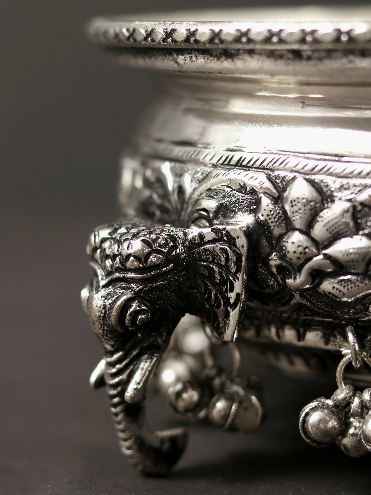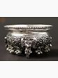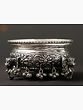 Regal grandeur and nature’s delicateness combined into one artwork, this exquisite copper decorative urli represents the richness of Indian aesthetics. Coated with a silver finish, the urli is enriched with ornate floral patterns etched into the copper meticulously, along with tiny ghungroos that add a beautiful element to the composition. The Urli stands with the support of the trunks of elephants on four sides, which beautifully balance the piece while amplifying its visual opulence.