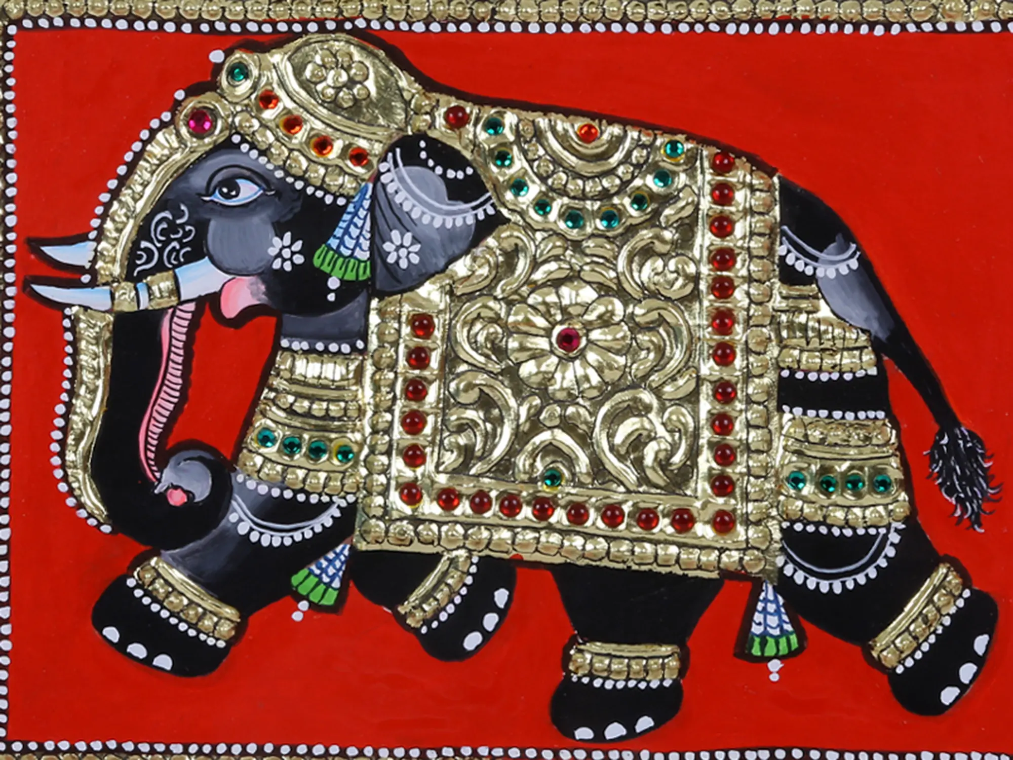 What truly sets this artwork apart is the generous use of gold foil work. The delicate application of real gold foil lends a magnificent shimmer and depth to the piece, catching the light and drawing the eye. This traditional technique, characteristic of Tanjore paintings, is masterfully employed to accentuate the elephant's regal attire, the decorative patterns on its body, and the surrounding border. Complementing the gleam of gold are carefully placed gemstones, adding pops of vibrant color and a touch of luxury. These colorful accents, embedded within the design, further enhance the artwork's visual appeal and create a sense of grandeur. ––––––––––––––––––––