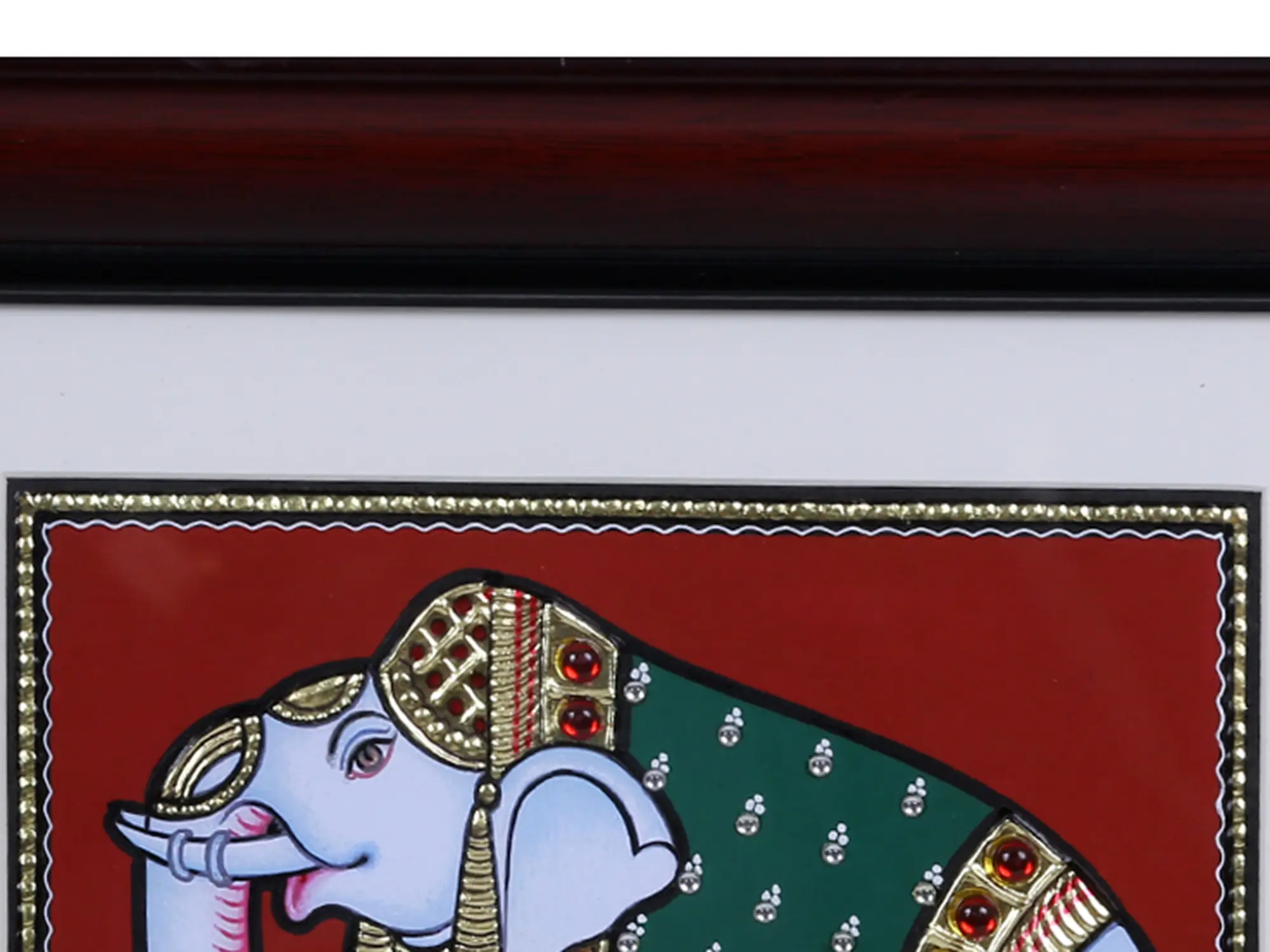 Tanjore paintings, originating from the southern Indian city of Thanjavur, are renowned for their unique style characterized by rich colors, intricate detailing, and the lavish use of gold foil. This particular piece captures the essence of this ancient art form, presenting the elephant in a dignified posture. The elephant is adorned with a decorative blanket and ornate jewelry, all meticulously crafted to highlight the textures and patterns. The use of vibrant colors, set against a deep red backdrop, creates a visually stunning contrast that draws the eye and emphasizes the preciousness of the gold embellishments. ––––––––––––––––––––