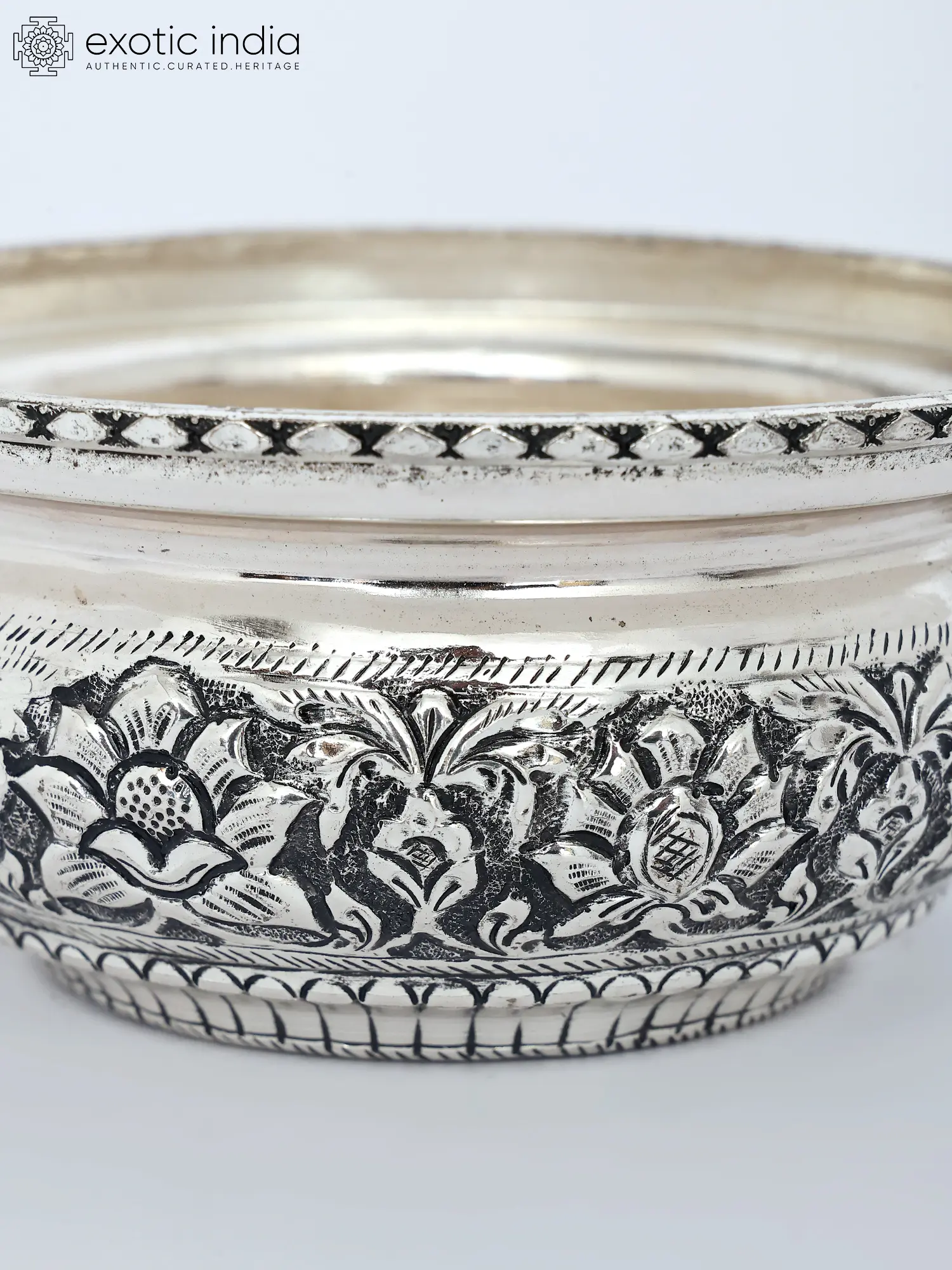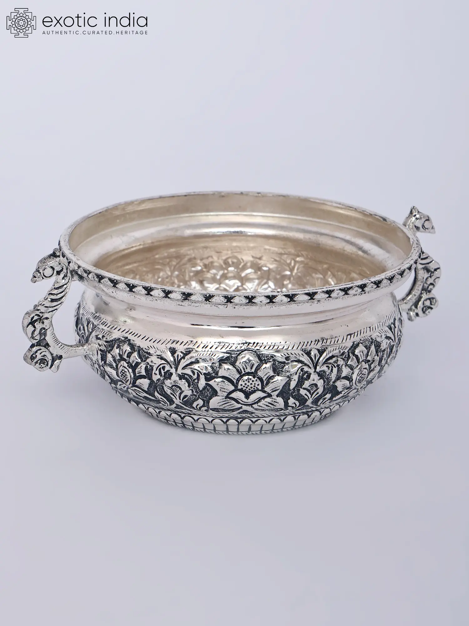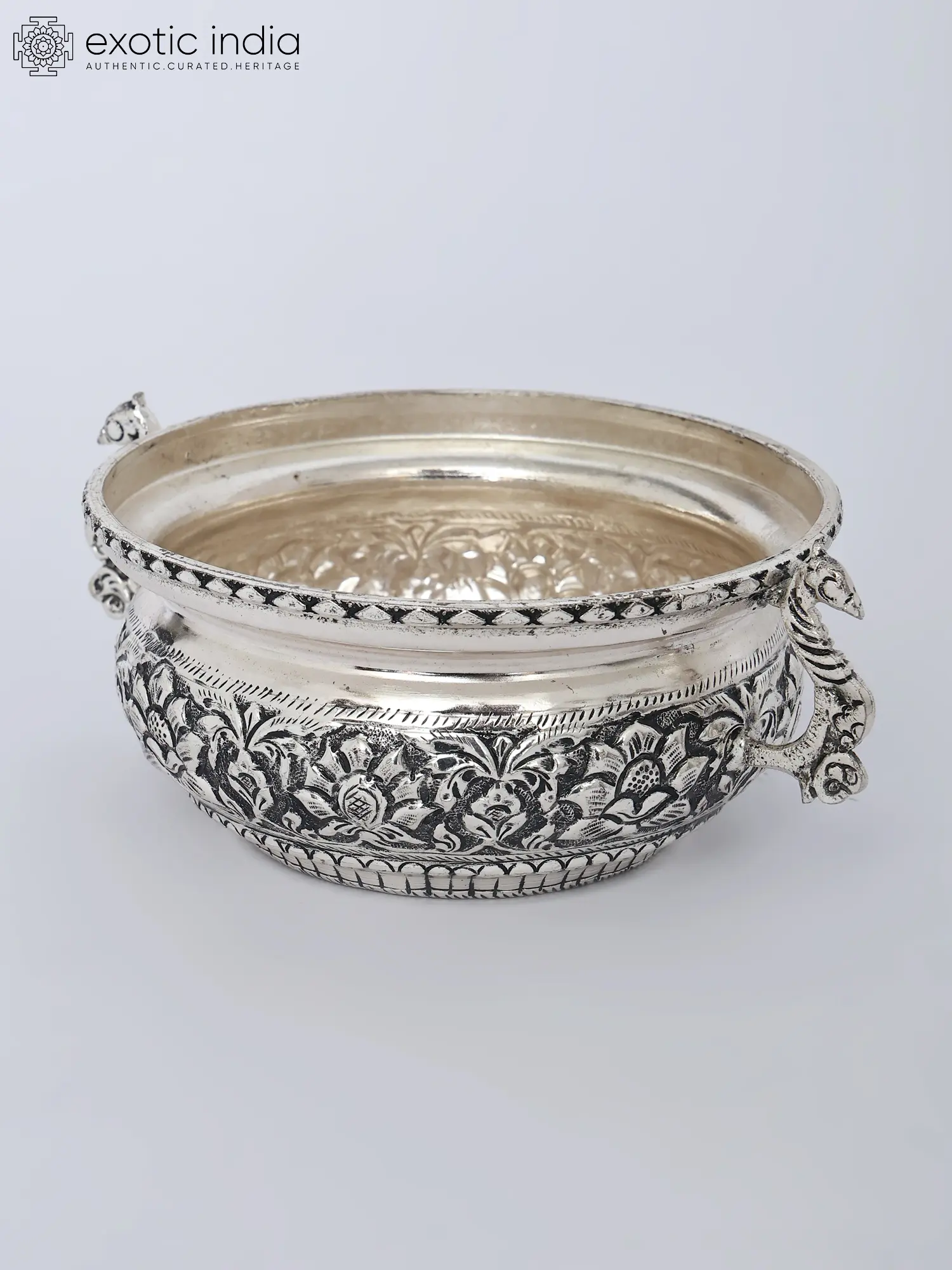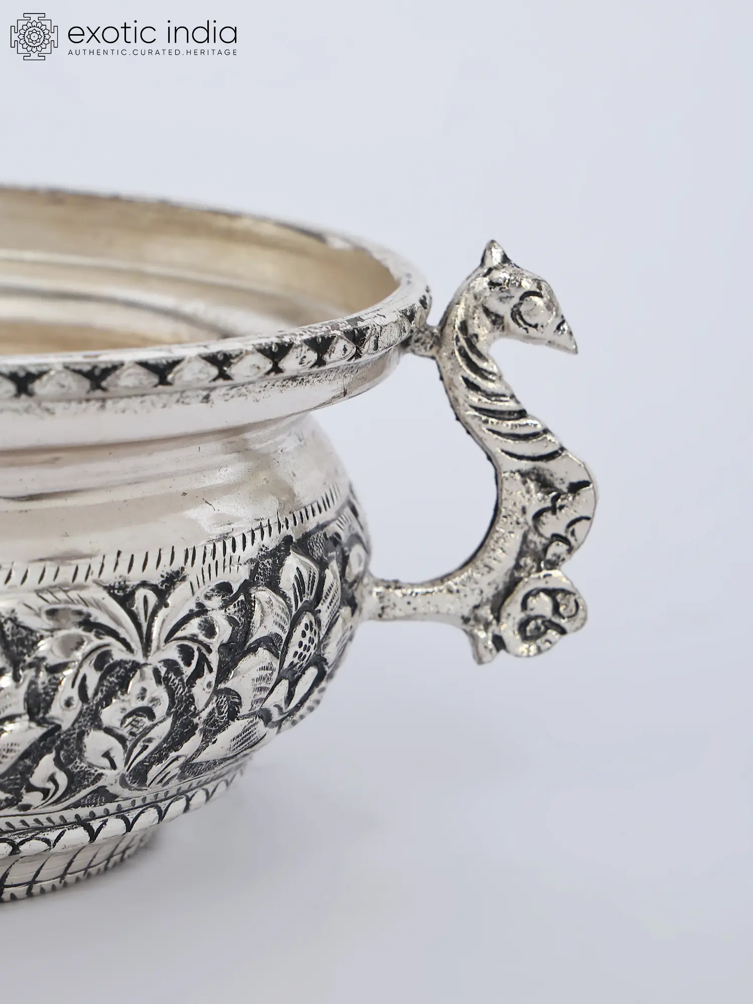 Crafted from lustrous white metal, this piece is a testament to the enduring skill of artisanal hands. Each curve and contour speaks of meticulous attention to detail, with the floral motifs deeply etched and highlighted to create a stunning visual depth. The handles, fashioned in the elegant form of peacocks, add a graceful flourish, underscoring its artisanal heritage.