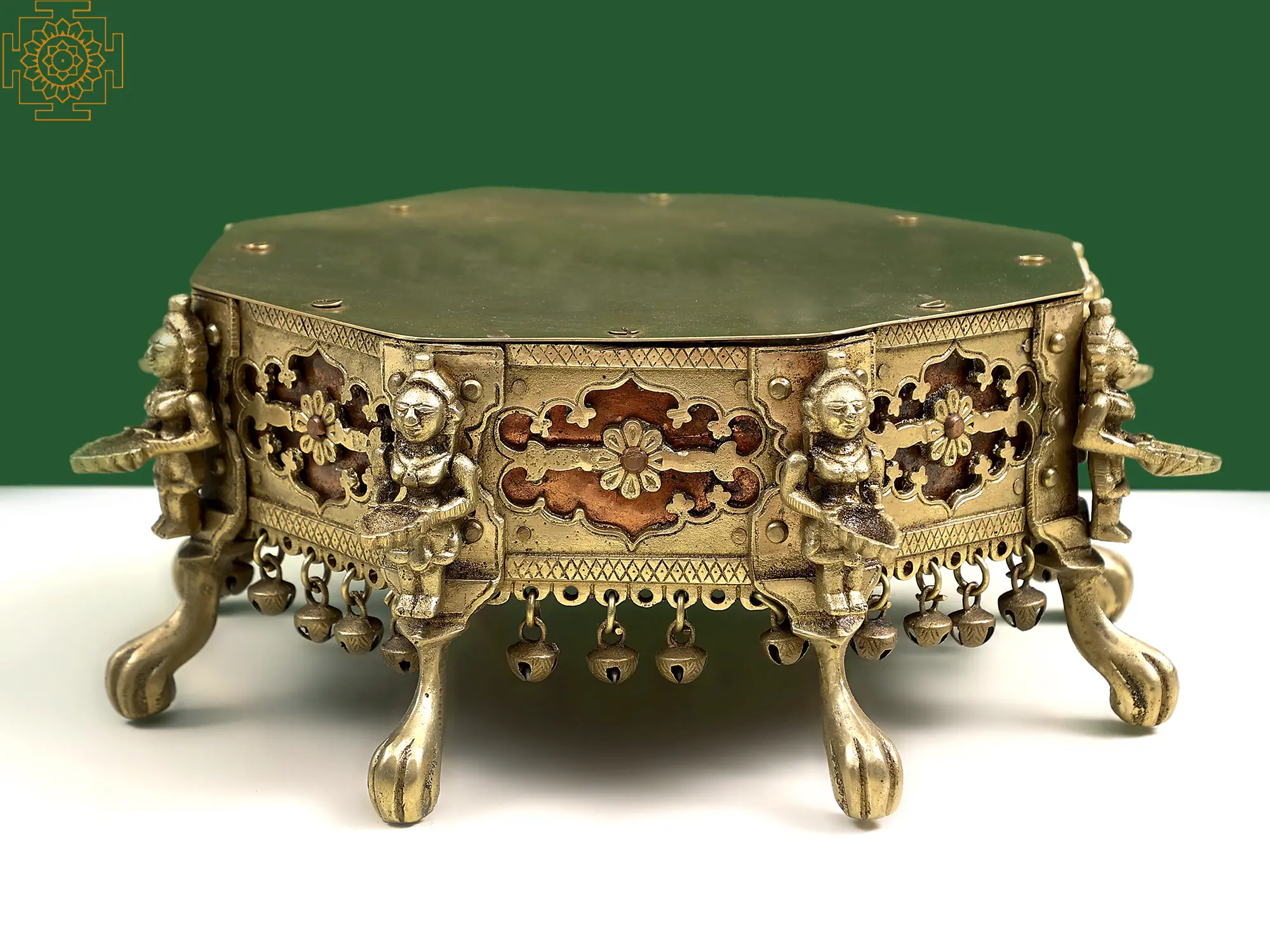 On the width of the chowki, intricately made floral patterns and miniature figures of Deepalakshmi (women figures holding Deep lamps) are added, giving an additional layer of element to the piece, and a touch of auspiciousness. A row of Ghungroo (tiny bells) on each side and supports formed like the legs of lions beautify this chowki further, making it an artistic element perfect for your Puja Ghar.