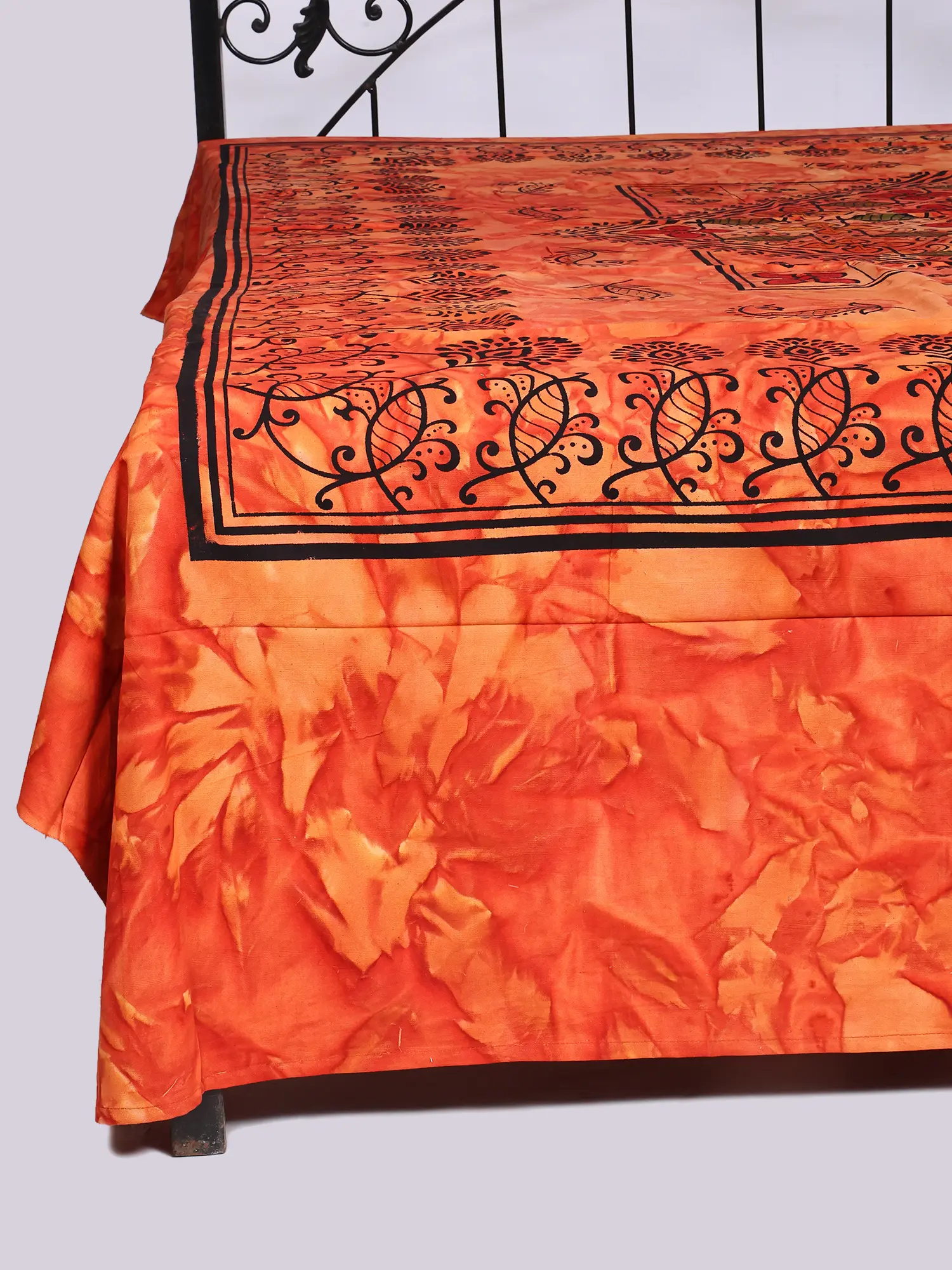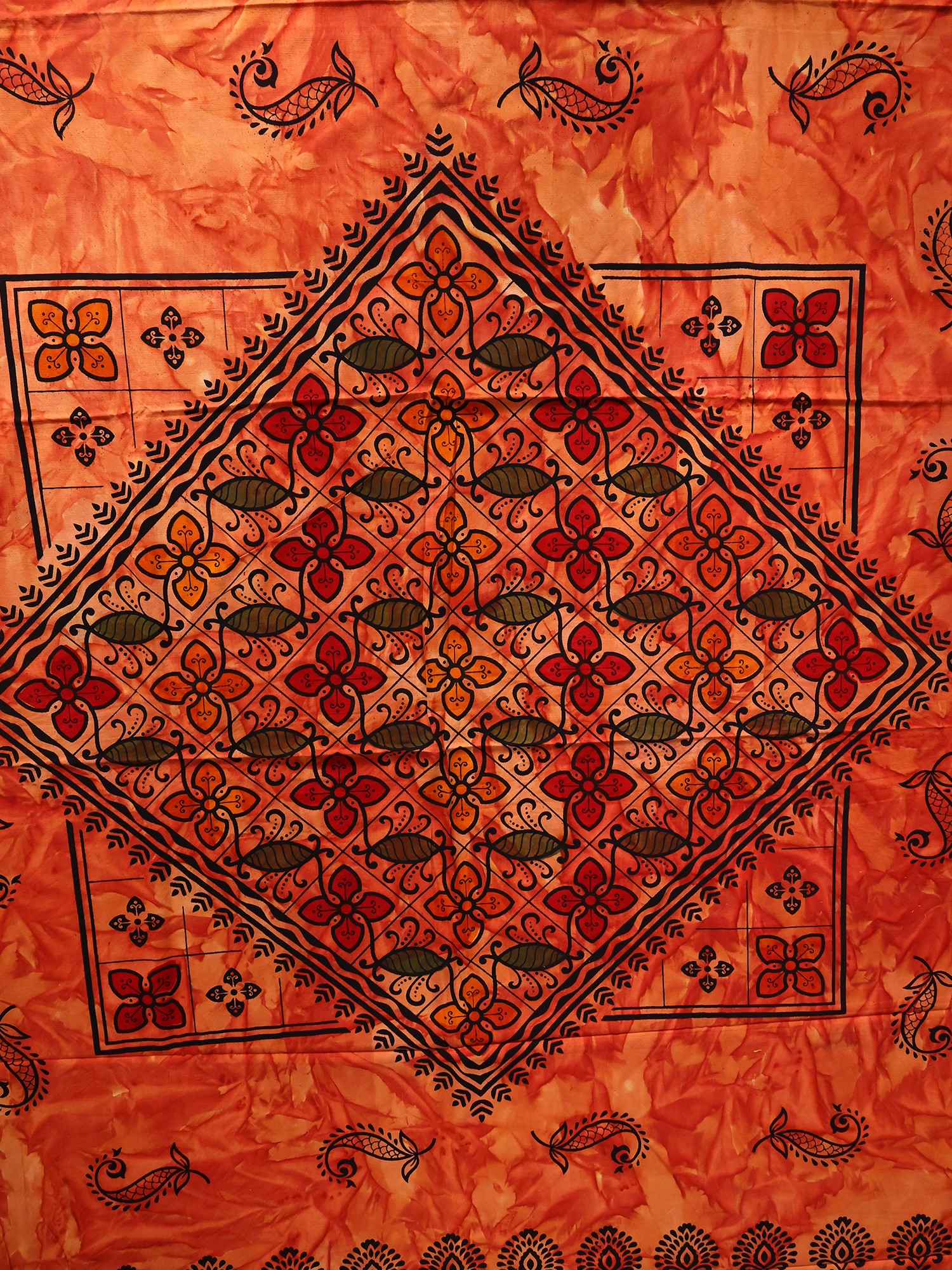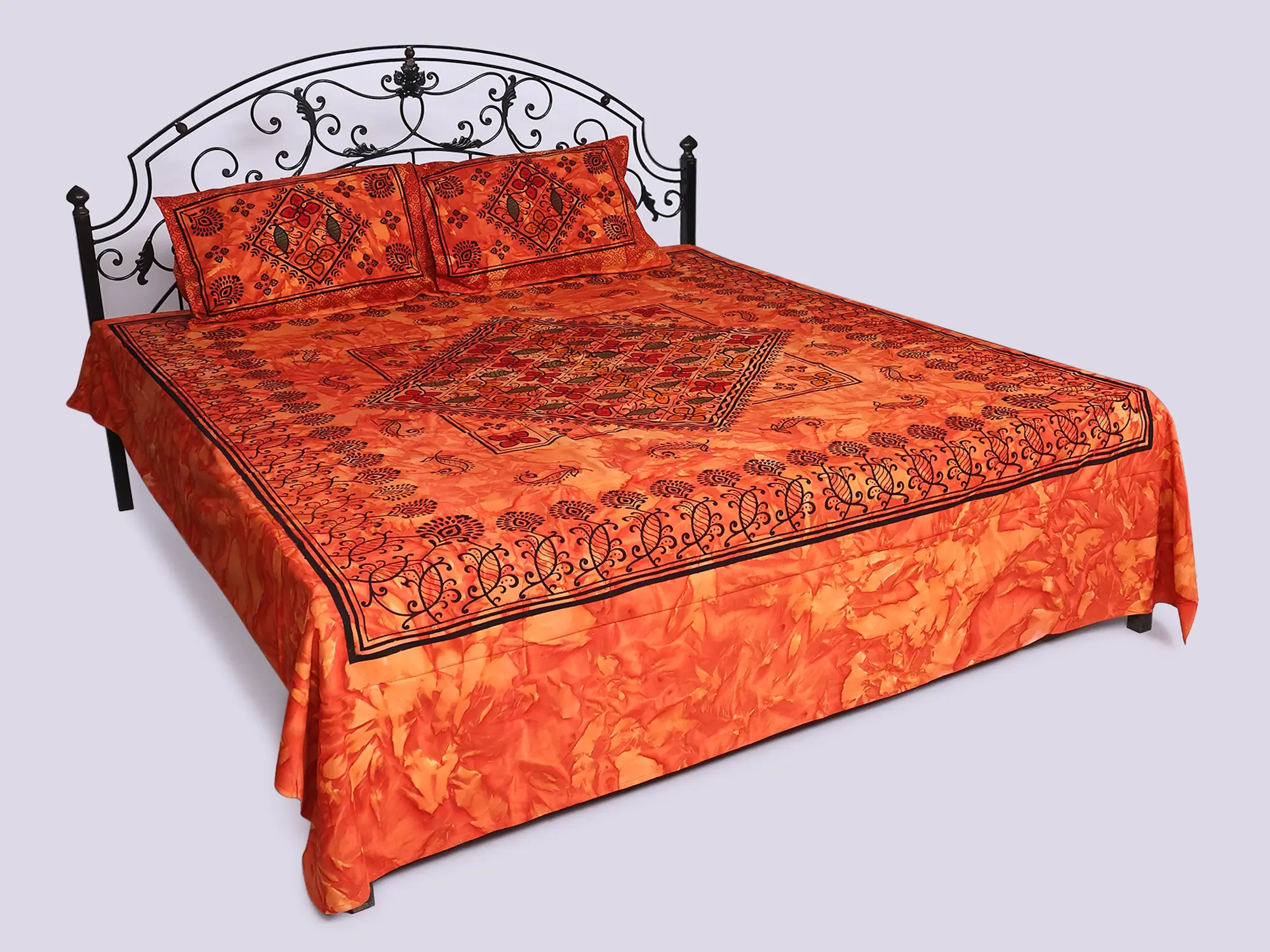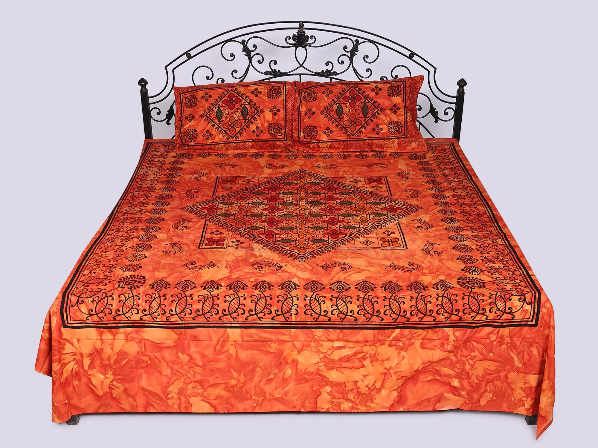 Apricot-Nectar Batik-Dyed Queen Size Bedspread with Pillow Cases and Printed Geometric Pattern
