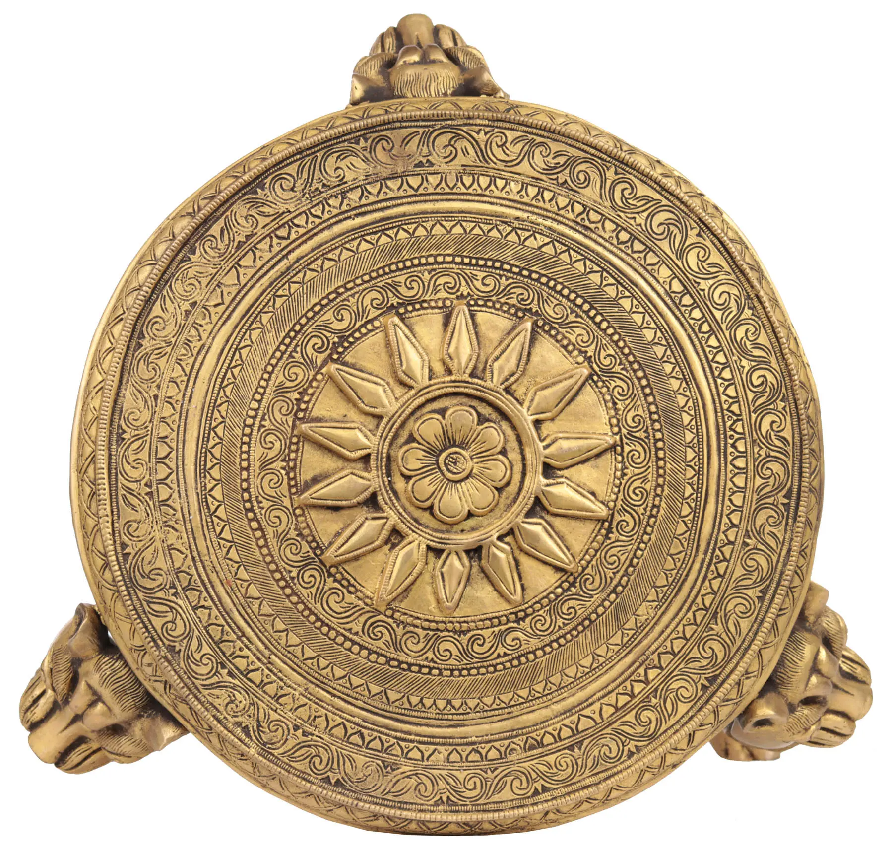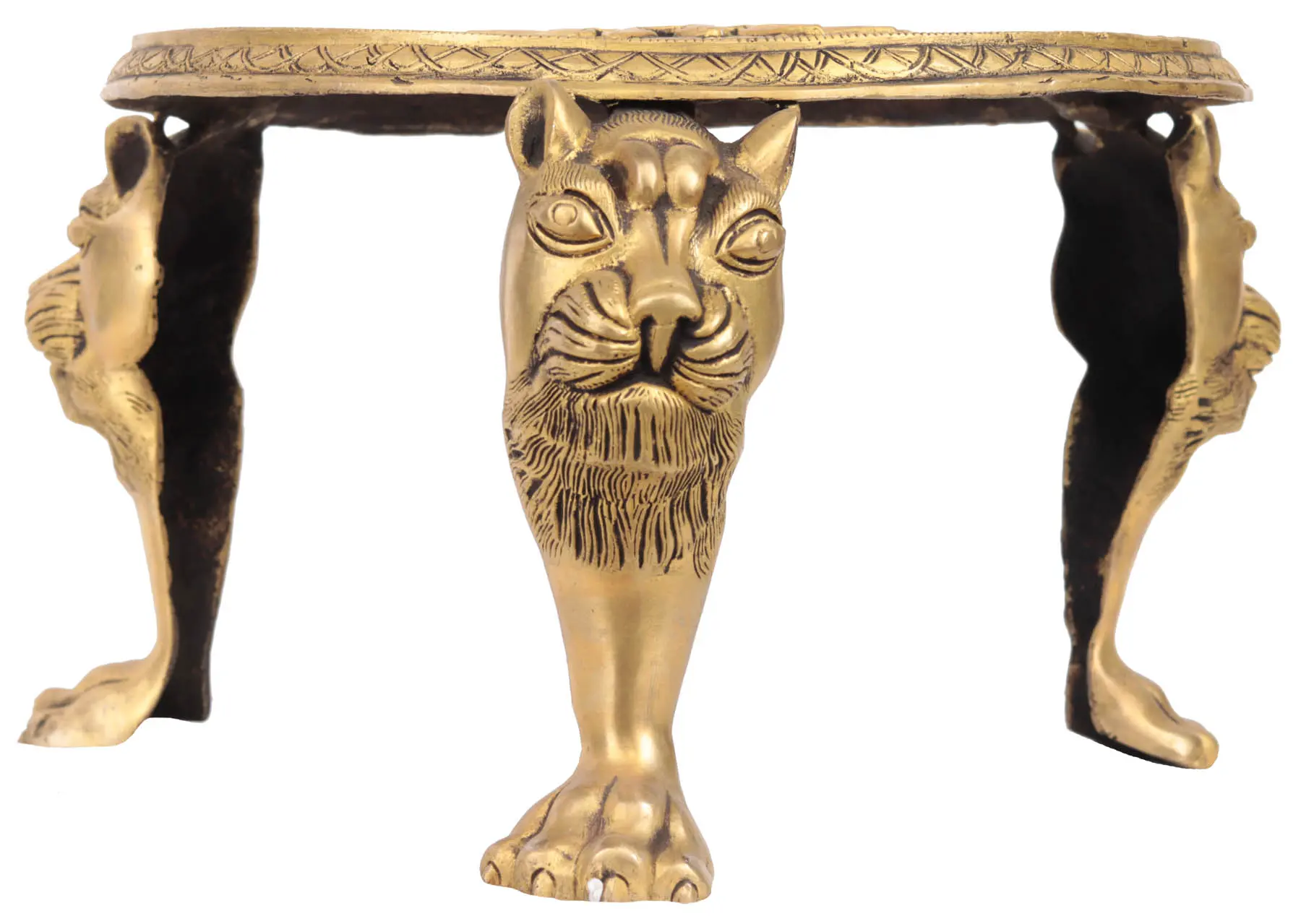 The chowki appears to be a noble household object. It is constructed of brass. It has an old appearance and functions as a stand where essential artifacts may be displayed. It features three distinct stands that support the tabletop. The stands depict a lion with a head and legs. It is also known as a Singhasan. Traditional flora is artistically decorated on the tabletop. A basic flower in the center is ringed by a lotus pattern, which subsequently elaborates into numerous rings of abel buta and other classic designs. It is a well-designed and compact piece of craftsmanship. When viewed from above, the stands and chowki appear to form a triangular shape.