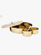 Spices are important in Indian cookery. They are preserved and stored for a longer period. In kitchens, little containers store a small quantity of spices for convenience. This round metal masala box is a culinary classic that improves the skill of spice management. It has seven lovely small masala jars, each with a beautiful golden sheen. The spice box includes a little spoon for even spice distribution. The lid of the spice box has a lovely handle and delightful motifs of Phool Patti influenced by Sanchi art gently carved on it. This masala box is adorned with stunning carvings, elevating it beyond utility to become a magnificent legacy that future generations will love.