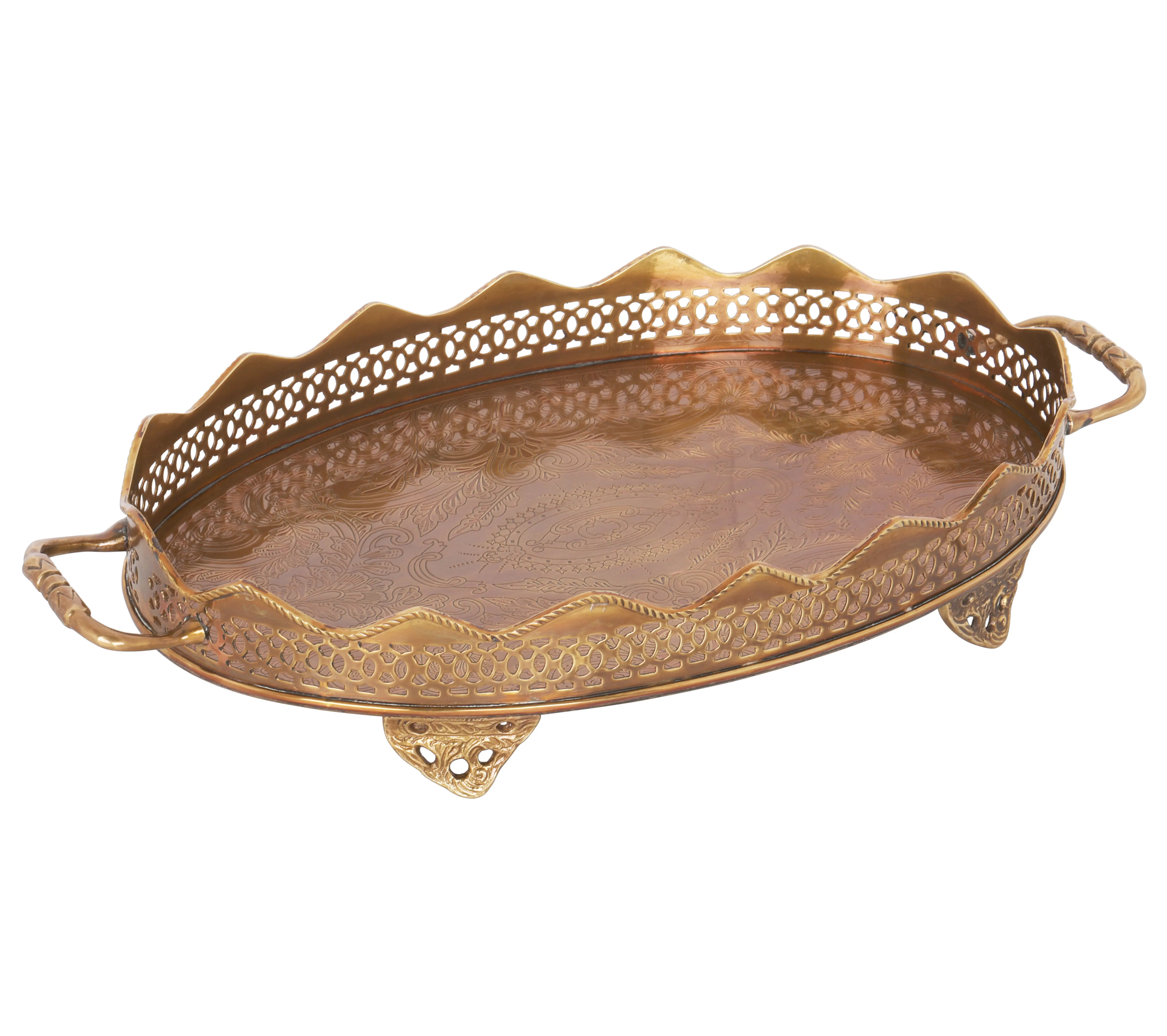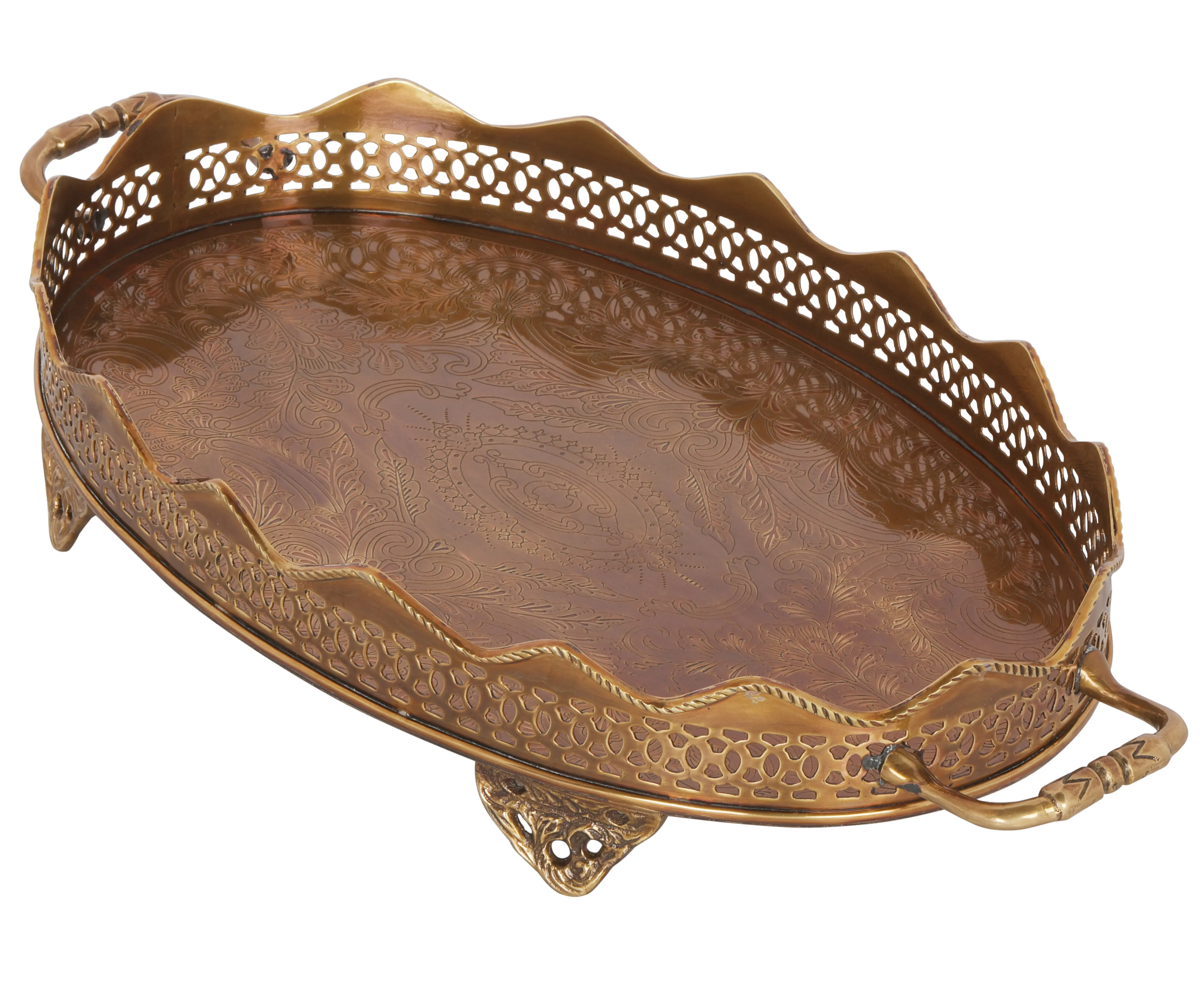 Elevate your home decor with this exquisite tray, a piece that embodies both functionality and artistry. The warm, inviting tone of the brass lends an air of sophistication to any space, while the intricate detailing speaks to a rich heritage of craftsmanship. It is a statement piece designed to capture attention and spark conversation. Whether you're serving guests, displaying cherished items, or simply adding a touch of glamour to your living space, this tray will serve you well. The sturdy construction ensures that it can hold its own, while its captivating design will only enhance what you place upon it. The ornate rim and handles add a layer of visual interest, making it a feast for the eyes even when empty.