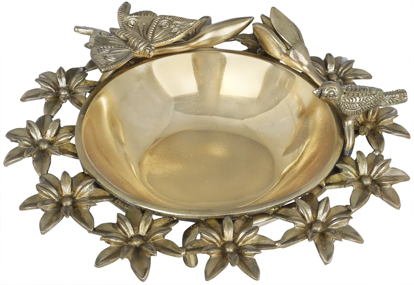 This fascinating arrangement respects nature's beauty with a brass Urli surrounded by flowers and perched butterflies and birds. The Urli, a shallow vessel, provides a tranquil retreat and is adorned with a colorful assortment of flowers, resulting in a magnificent floral arrangement. A butterfly and a bird are gently perched on the Urli's edges, lending life and charm to the picture. The butterfly represents change and the transient aspect of beauty, but the bird represents freedom and serenity. This harmonious blend creates a sense of calm and allows viewers to immerse themselves in nature's amazing delights.
