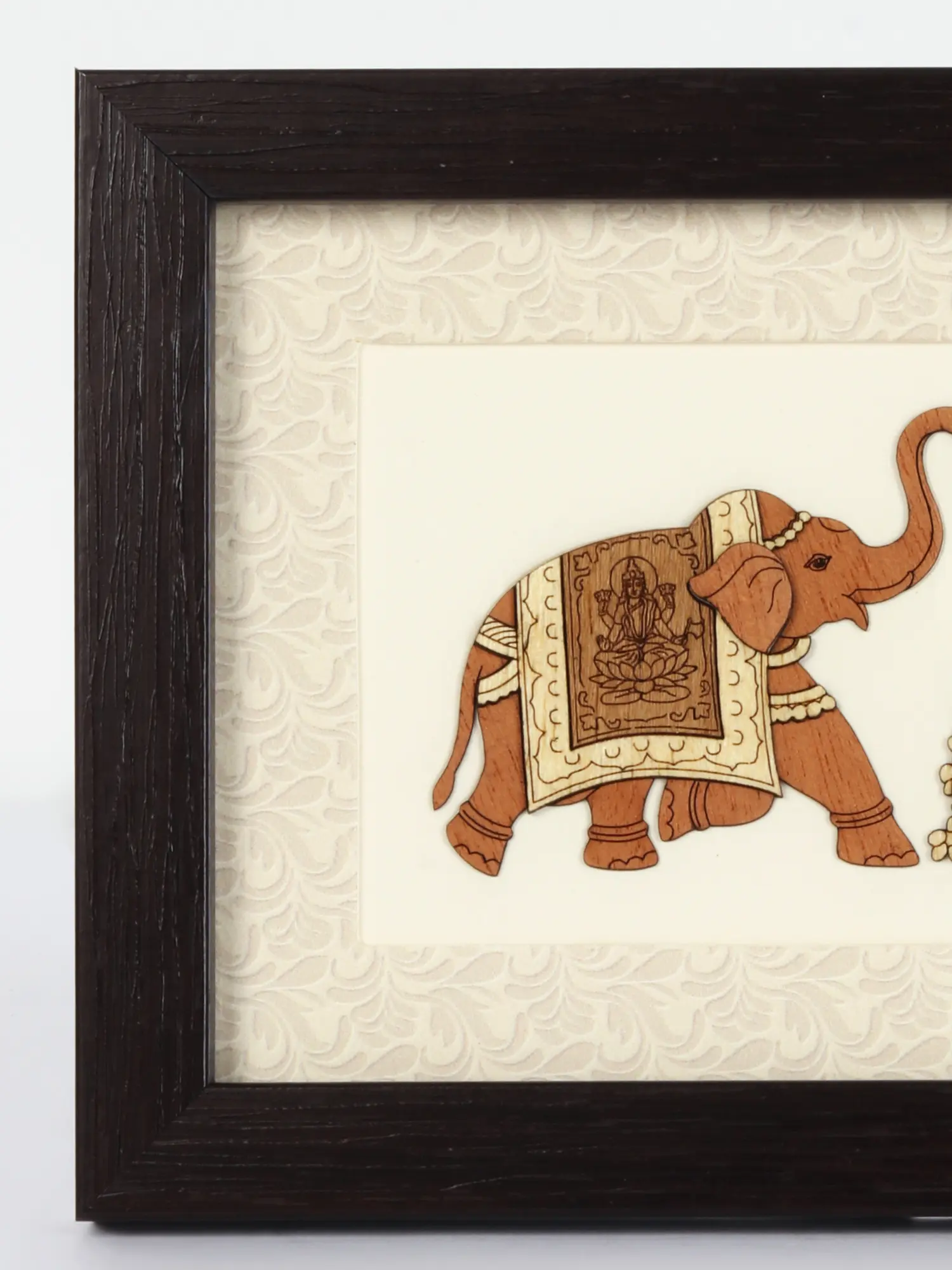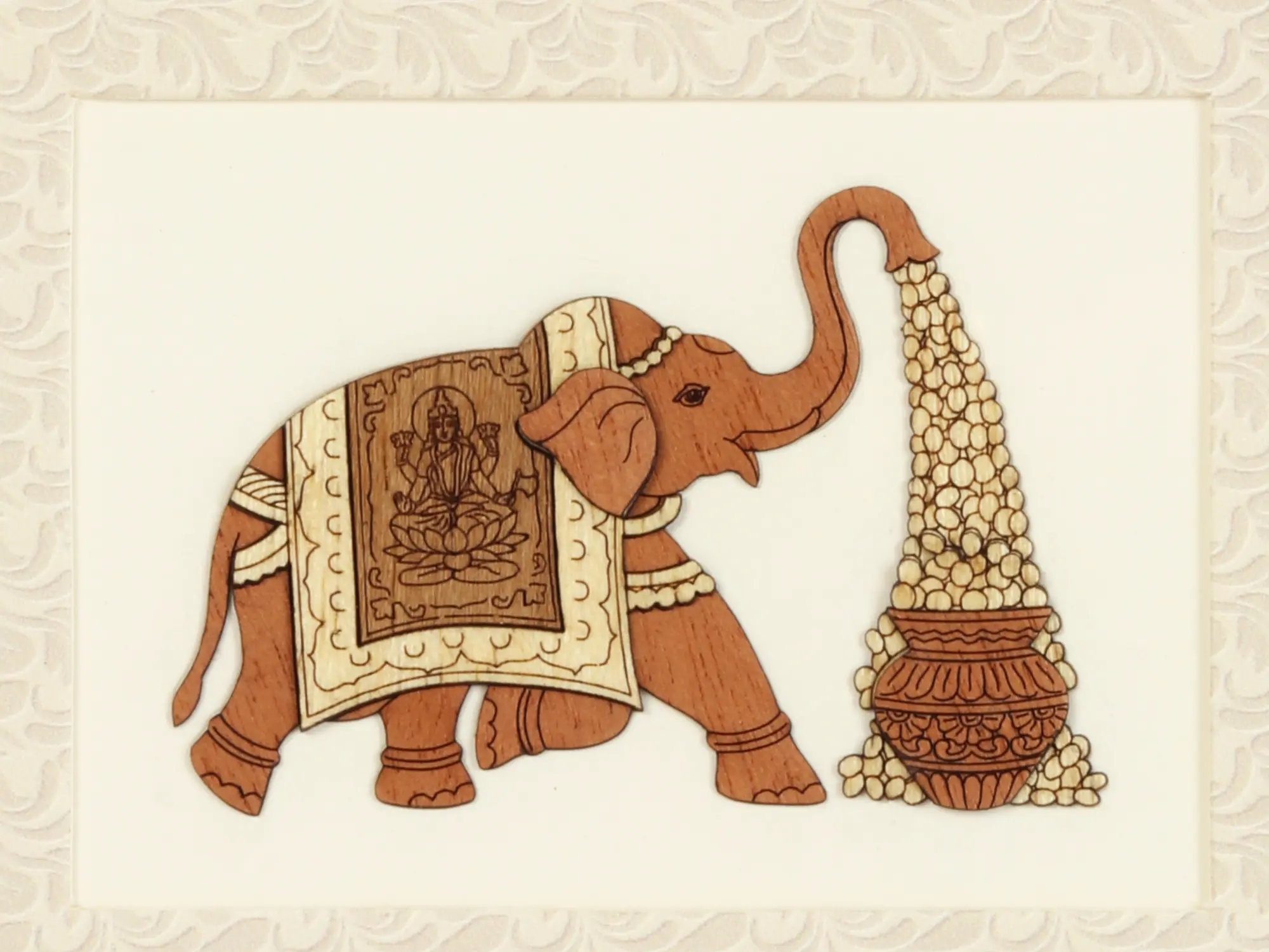 With this enchanting “Gajalakshmi Wooden Art,” enter a realm where heavenly blessings cascade like soothing monsoon rain. Crafted with careful precision, it portrays a magnificent elephant clad in splendid robes, beautifully raining coins of fortune from its trunk into a holy container. Symbolizing the benevolent embrace of Goddess Gajalakshmi, this masterpiece exudes an aura of abundance and grace.