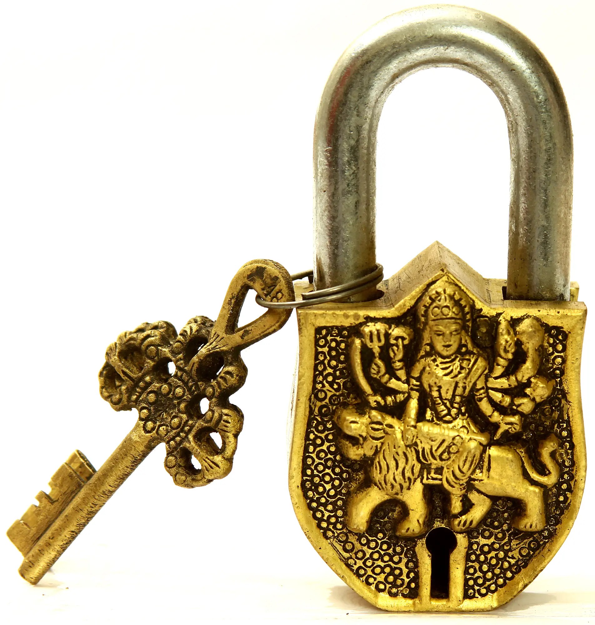 The Goddess Durga Temple Lock, fashioned from brass, is a sacred guardian of divinity. On one side, it showcases the sacred image of Goddess Durga, the fierce yet benevolent deity revered for her strength and protection. The other side bears the sacred symbol "Om," representing the essence of the universe. This lock, with its lacquer finish resembling a green patina, exudes an antique allure, embodying timelessness. It comes with two keys, symbolizing the dual aspects of devotion and protection. The image of Goddess Durga holds immense significance, symbolizing the divine feminine energy and the triumph of good over evil, making this lock not just a guardian of security but a vessel of spiritual strength and protection.