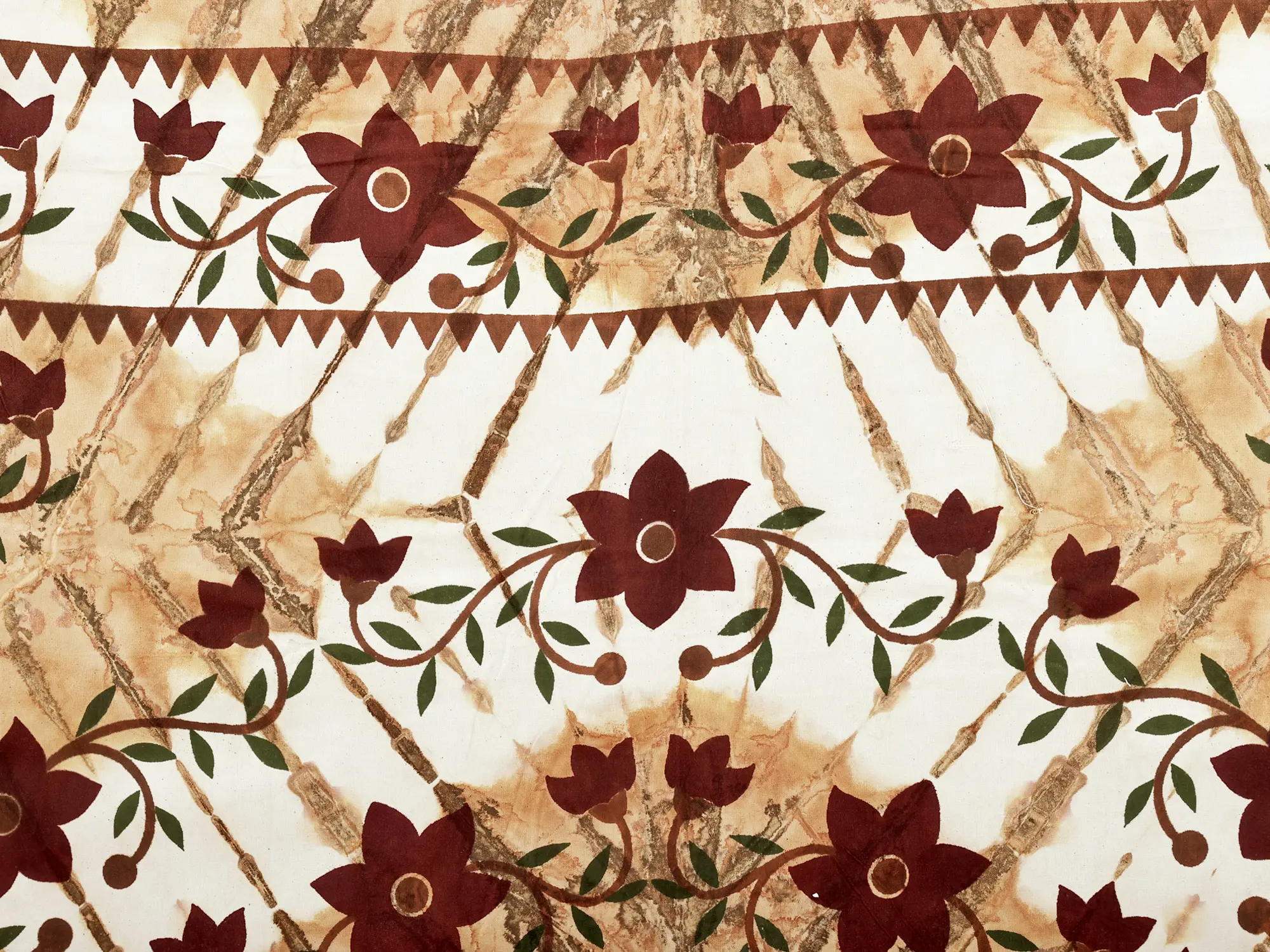 The design of this bedspread is a celebration of natural beauty. A mesmerizing tie-dye effect in warm, earthy tones forms the base, evoking the feeling of sun-drenched landscapes and the gentle flow of water. Overlaid on this artistic foundation are delicately printed flowers in a deep, rich hue, interspersed with trailing vines and subtle green accents. This thoughtful combination creates a visually dynamic and harmonious pattern that adds a touch of understated elegance to any bedroom. The interplay of the abstract batik and the structured floral print offers a captivating balance, making this bedspread a true statement piece.