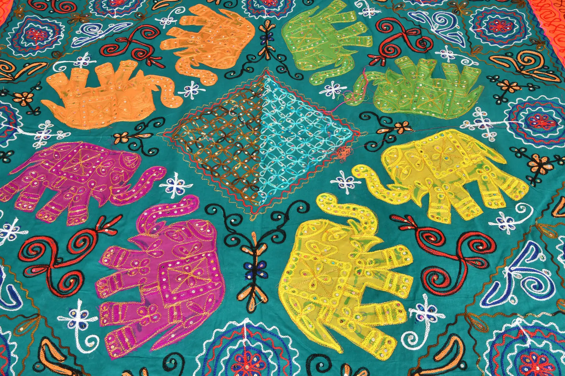 Transform your bedroom into a vibrant showcase of global artistry with this captivating piece. Handcrafted with passion and precision, this bedspread is more than just bedding; it's a testament to time-honored techniques and the rich cultural heritage of Gujarat, India. Every stitch tells a story, every detail a celebration of artistry. This stunning bedspread is crafted from pure cotton, offering a soft and breathable surface for a comfortable night's sleep. But its beauty lies far beyond its practicality. The centerpiece of this exquisite creation is the intricate embroidery and applique work. The detailed embroidery brings a unique and captivating visual texture to the fabric. The elephants, revered symbols of strength, wisdom, and good fortune, are rendered in a rainbow of vivid colors.