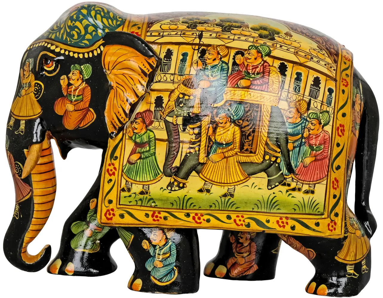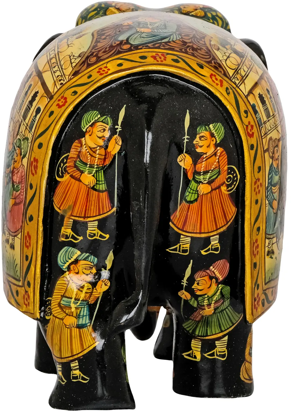 Every inch of this piece displays the dedication and skill of the artisan who created it. The vibrant color palette draws the eye, while the detailed artistry invites closer inspection. You'll find yourself captivated by the charming scenes painted across the body of the elephant, depicting scenes of courtly life and traditional processions, instantly transporting you to another world. The artistry extends to the smallest details, from the decorative motifs around the ears and legs to the subtle shading that gives the figure depth and dimension.