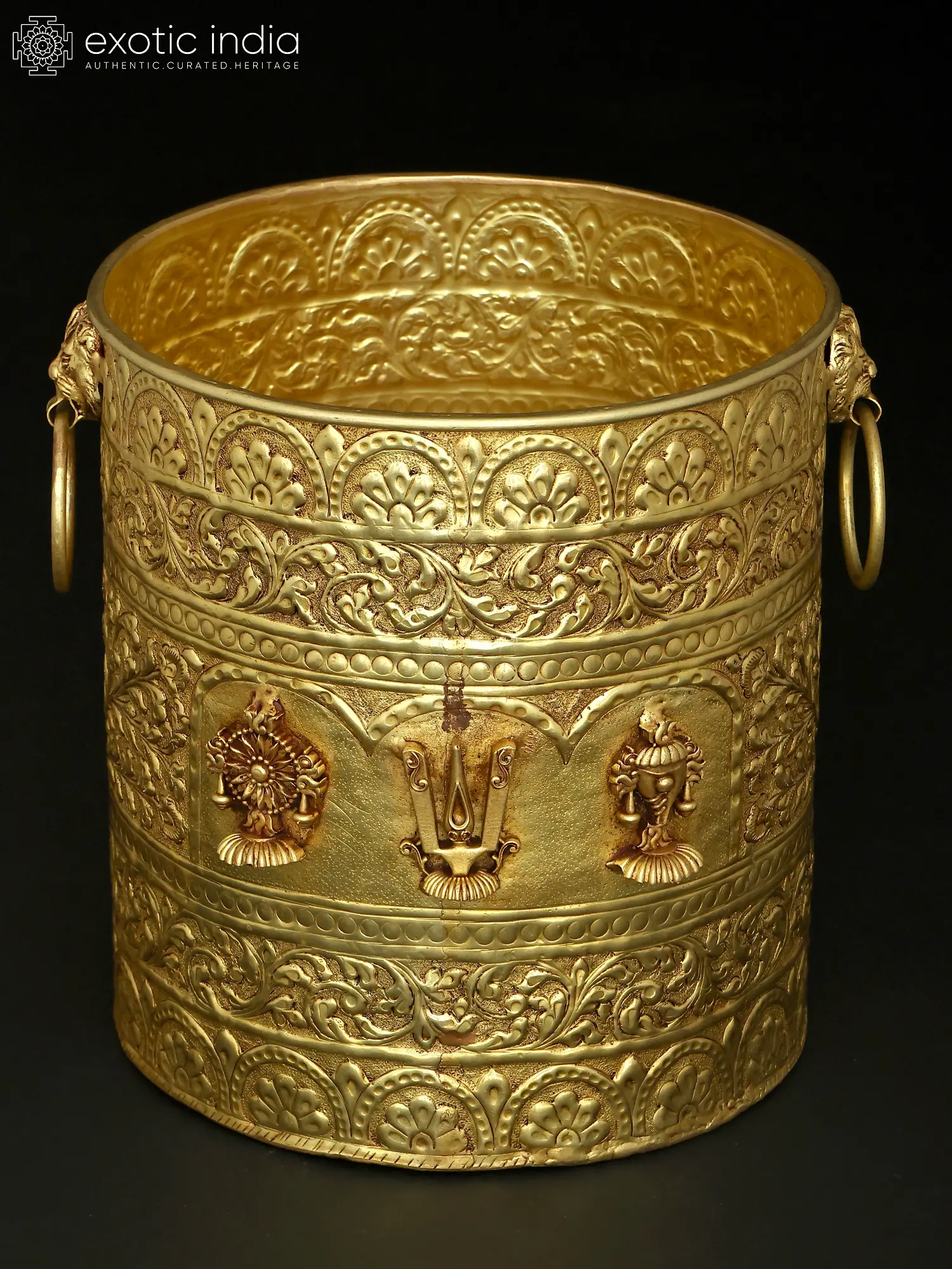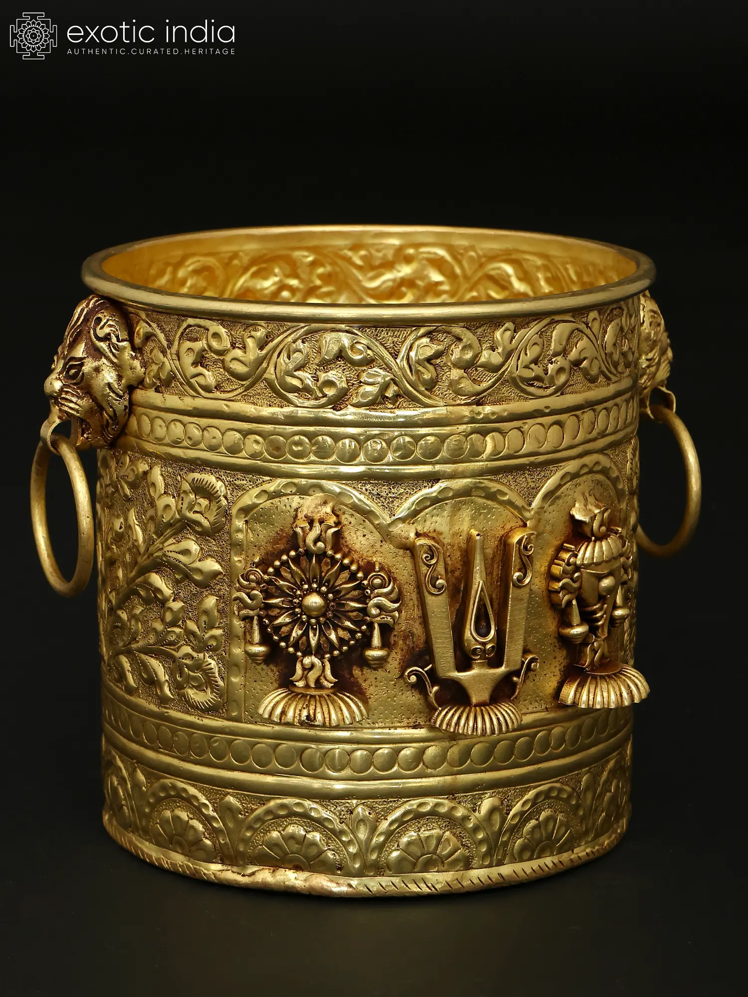 The surface is adorned with a symphony of deeply embossed motifs, creating a mesmerizing interplay of light and shadow that accentuates its sculptural form. The central panel prominently features the Vaishnav Tilak, flanked by the auspicious Shankh (conch shell) and Chakra (discus), symbols deeply revered in Hindu tradition. A decorative band of ornate floral scrollwork encircles the entire piece, with lion heads and rings adorning the upper rim, adding a regal touch. Measuring a commanding 10 inches in height and 10.5 inches in width and length, it offers a generous capacity for your botanical arrangements.